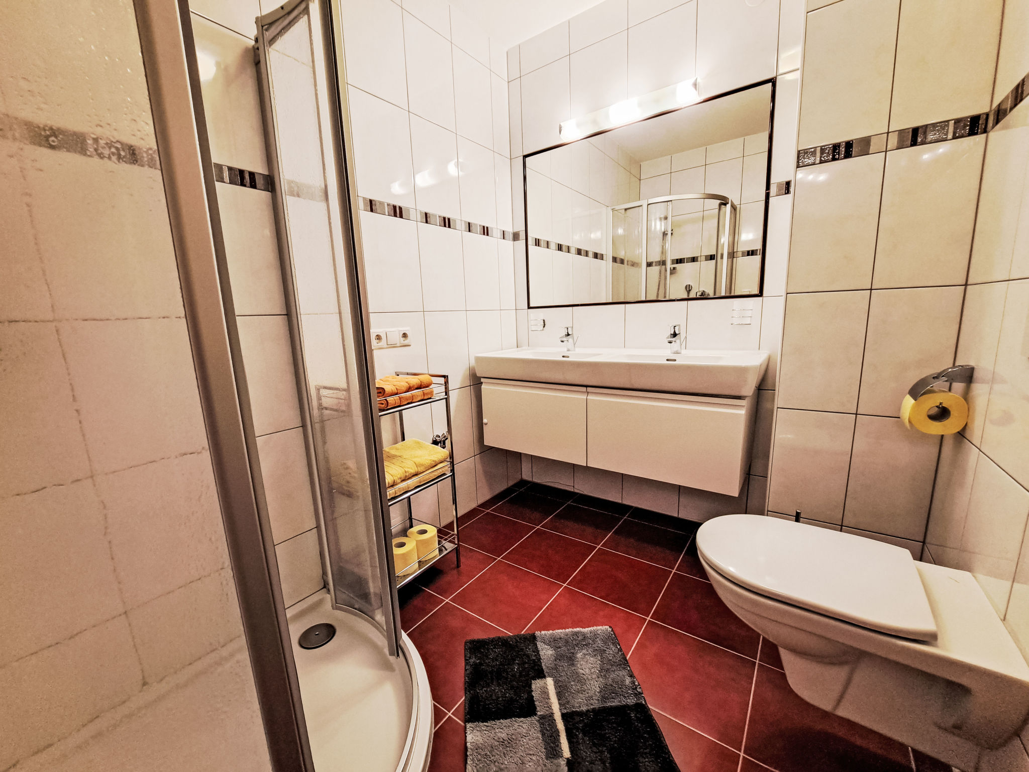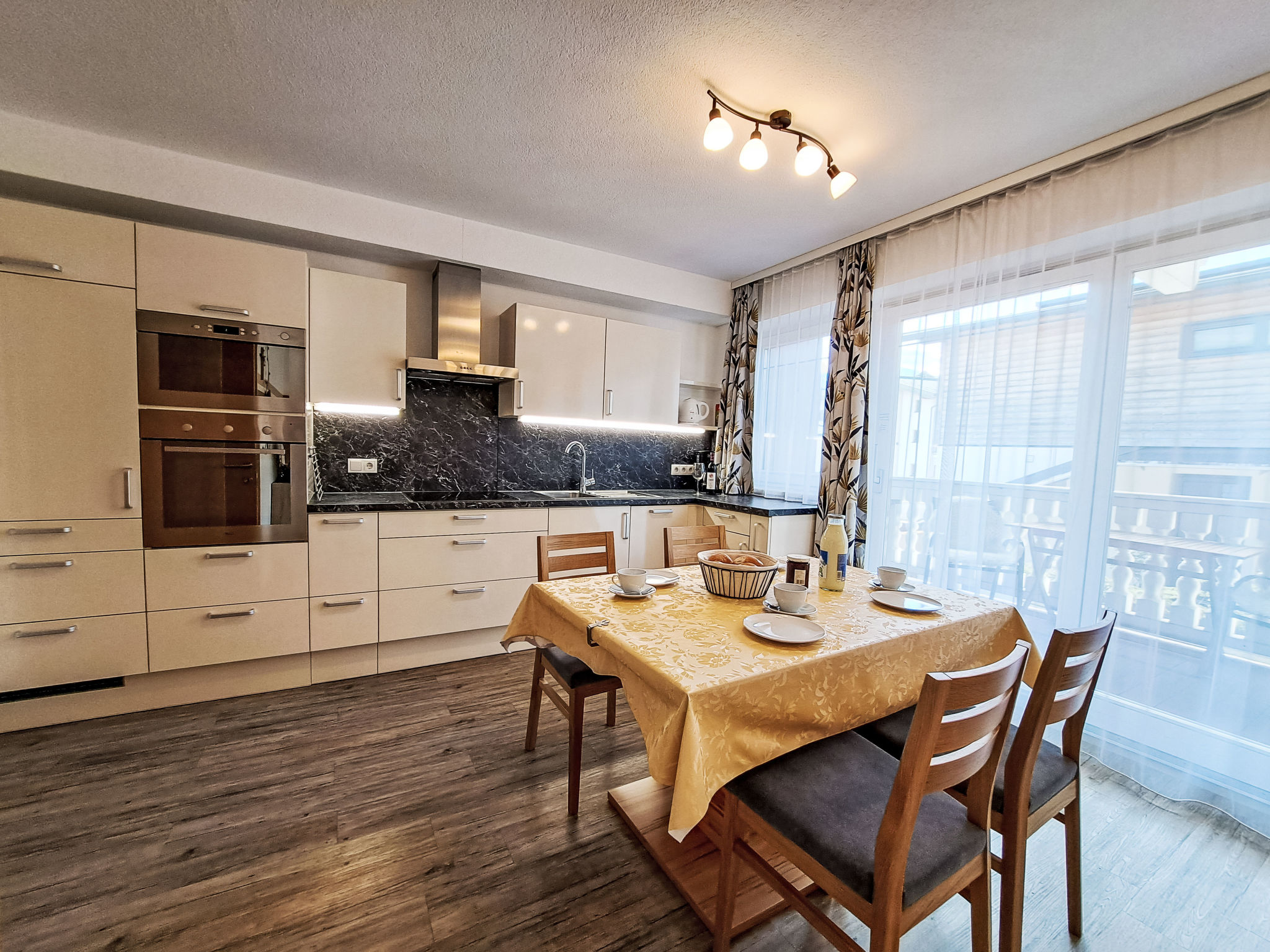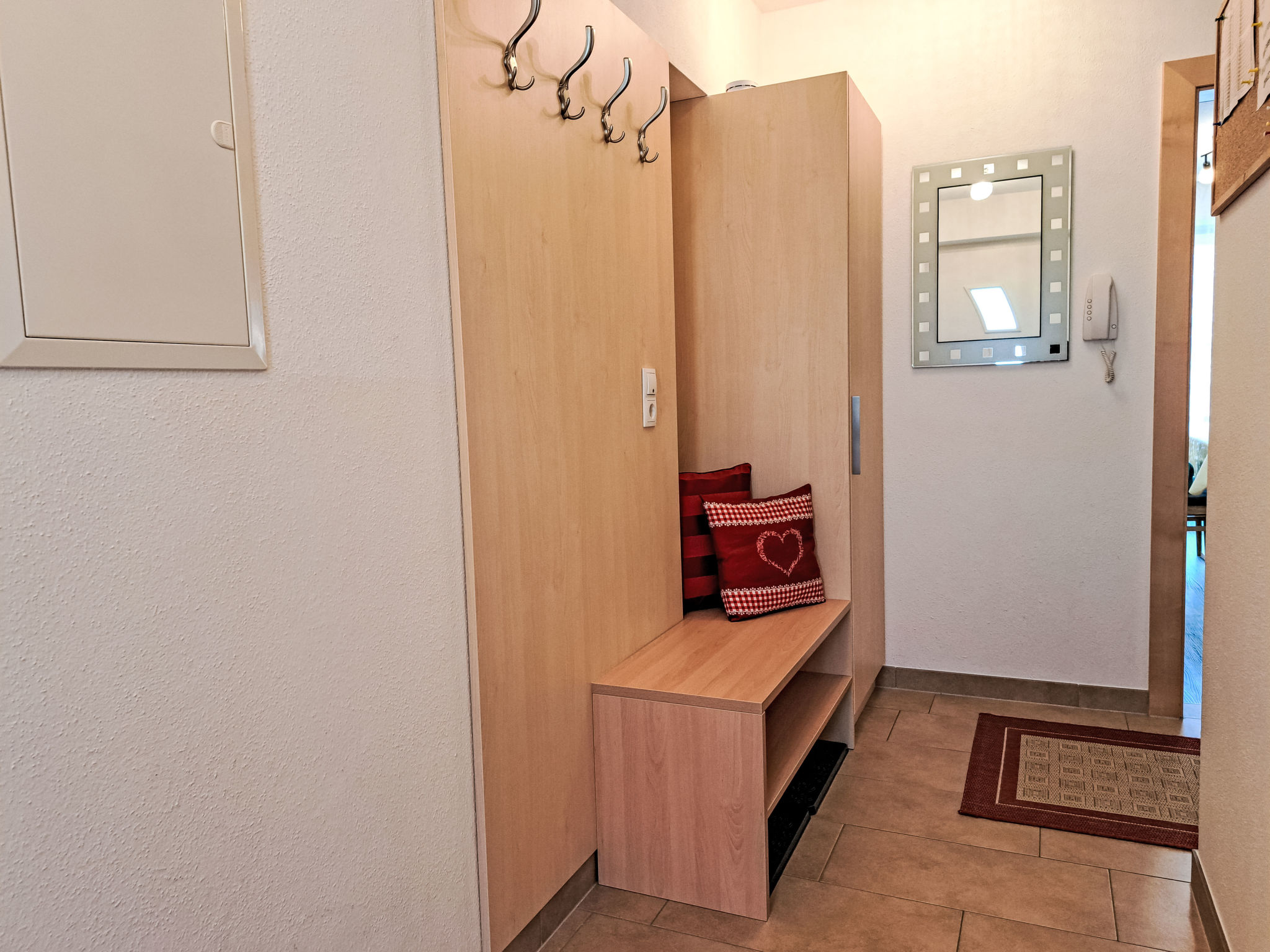 2-Zimmer-Wohnung, 1. Etage, ca. 45 m². Separater Zugang über Außentreppe. Wohn-/Schlafraum mit Doppelbettcouch (1,50 m breit), Essplatz, Küchenzeile (4 Ceranfelder, Backofen, Mikrowelle, Geschirrspüler, Kühlschrank, Kaffeemaschine, Wasserkocher, Toaster), Balkonausgang. Doppelzimmer. Dusche/Doppelwaschbecken/WC. Maximale Belegung: 3 Erwachsene oder 2 Erwachsene und 2 Kinder bis 14 Jahre.
