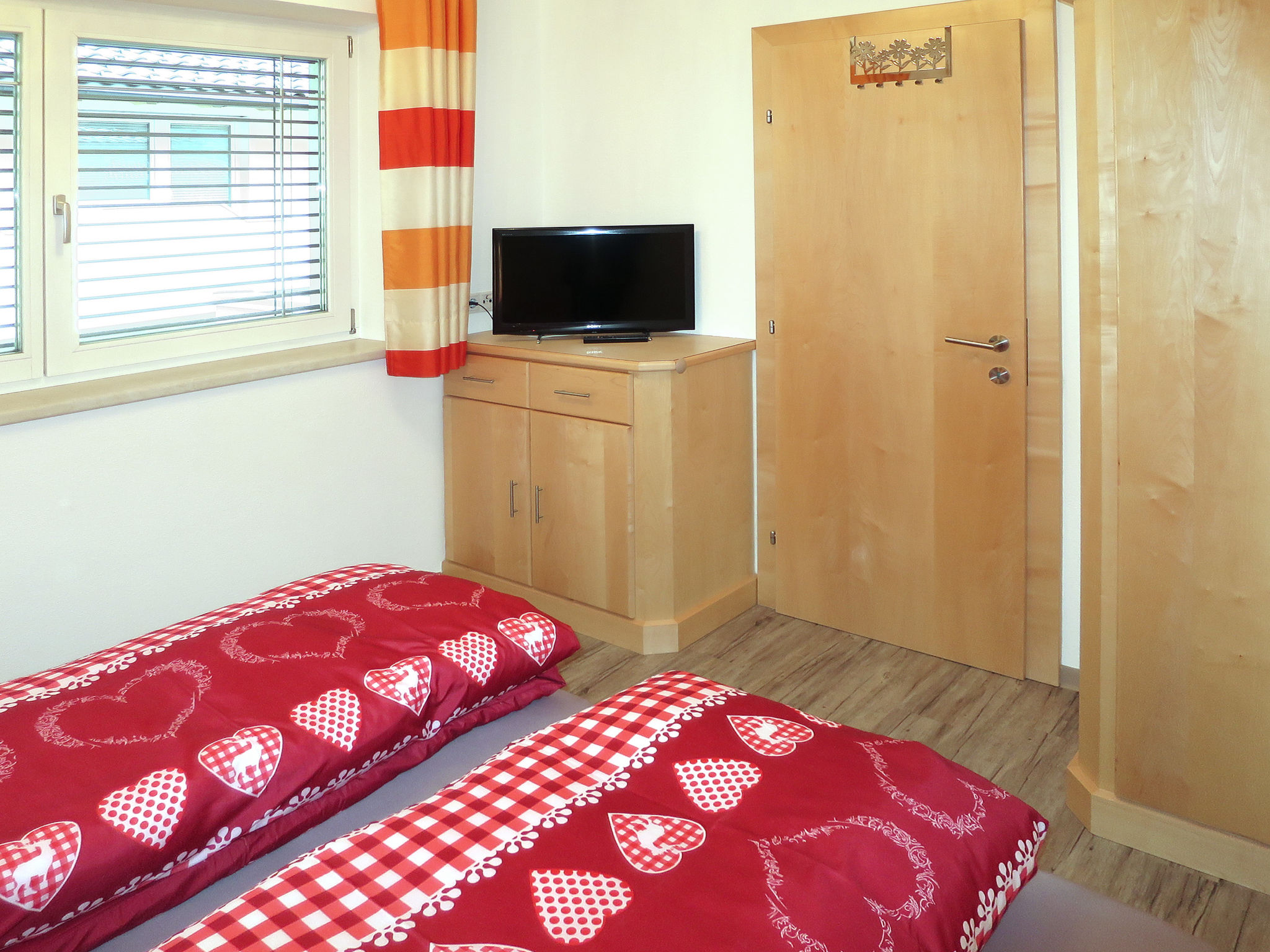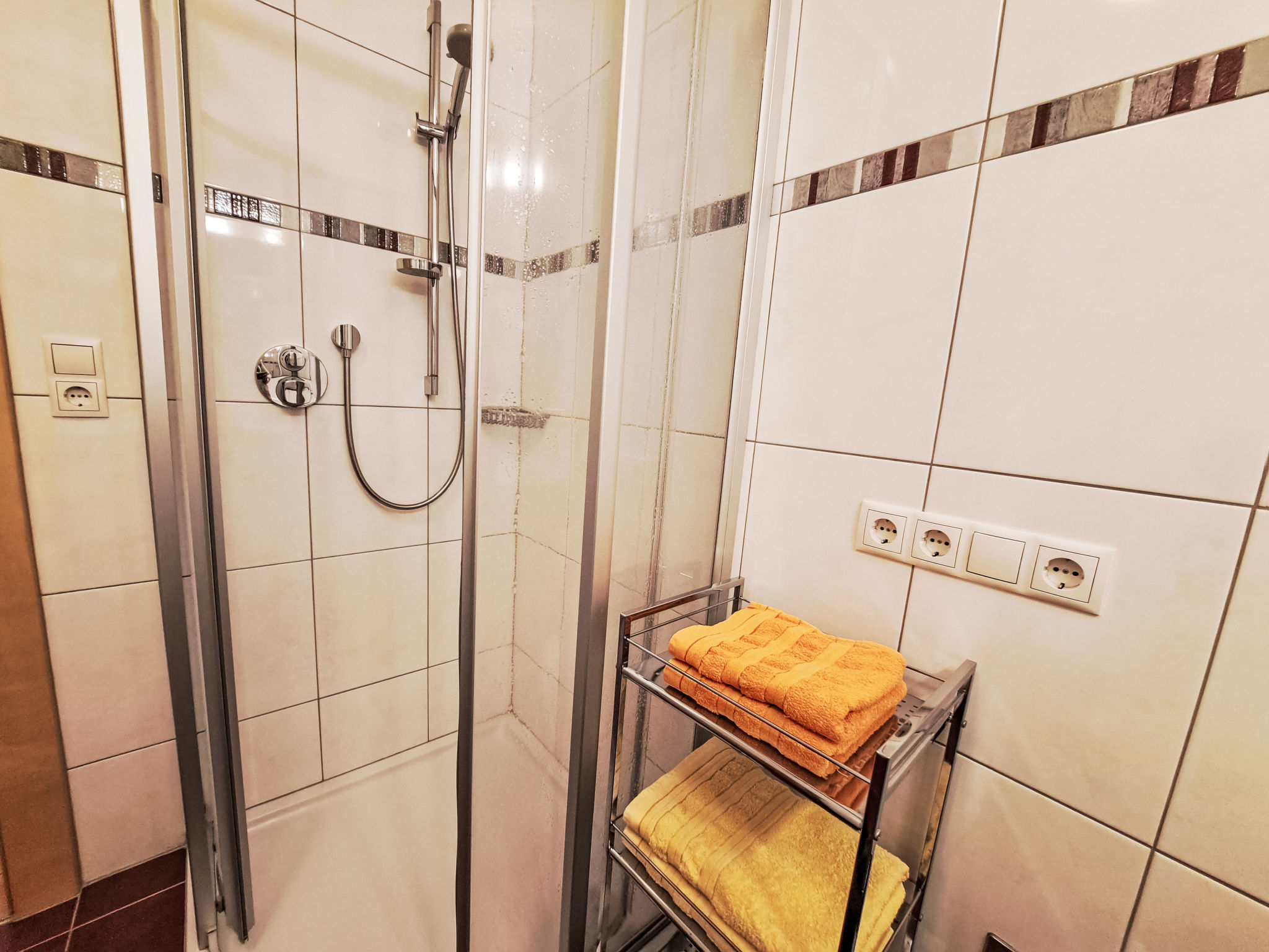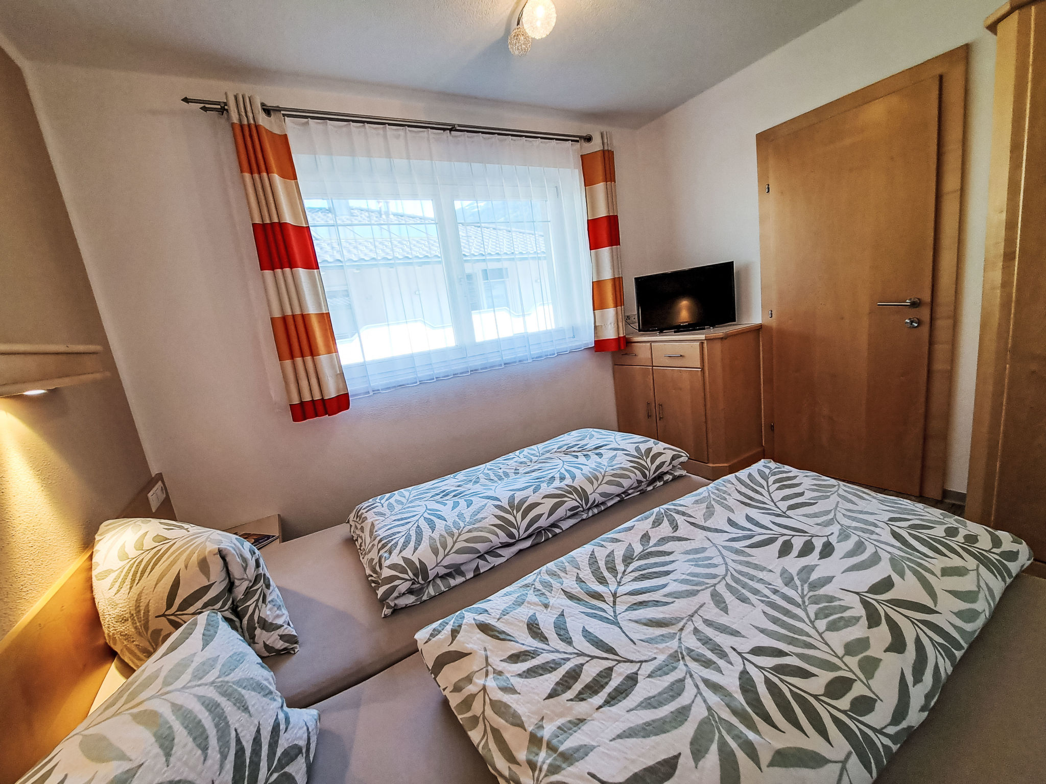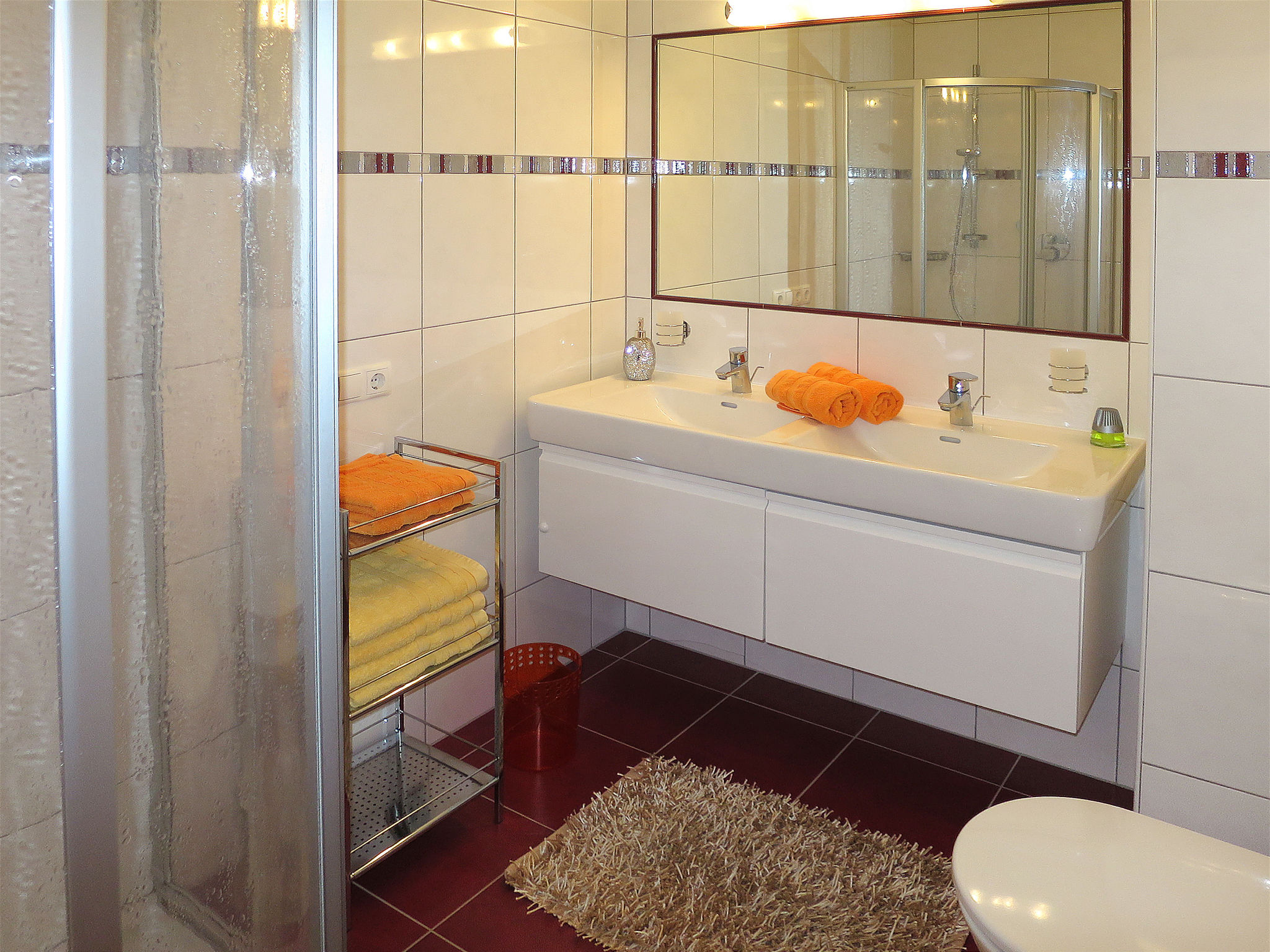 2-Zimmer-Wohnung, 1. Etage, ca. 45 m². Separater Zugang über Außentreppe. Wohn-/Schlafraum mit Doppelbettcouch (1,50 m breit), Essplatz, Küchenzeile (4 Ceranfelder, Backofen, Mikrowelle, Geschirrspüler, Kühlschrank, Kaffeemaschine, Wasserkocher, Toaster), Balkonausgang. Doppelzimmer. Dusche/Doppelwaschbecken/WC. Maximale Belegung: 3 Erwachsene oder 2 Erwachsene und 2 Kinder bis 14 Jahre.