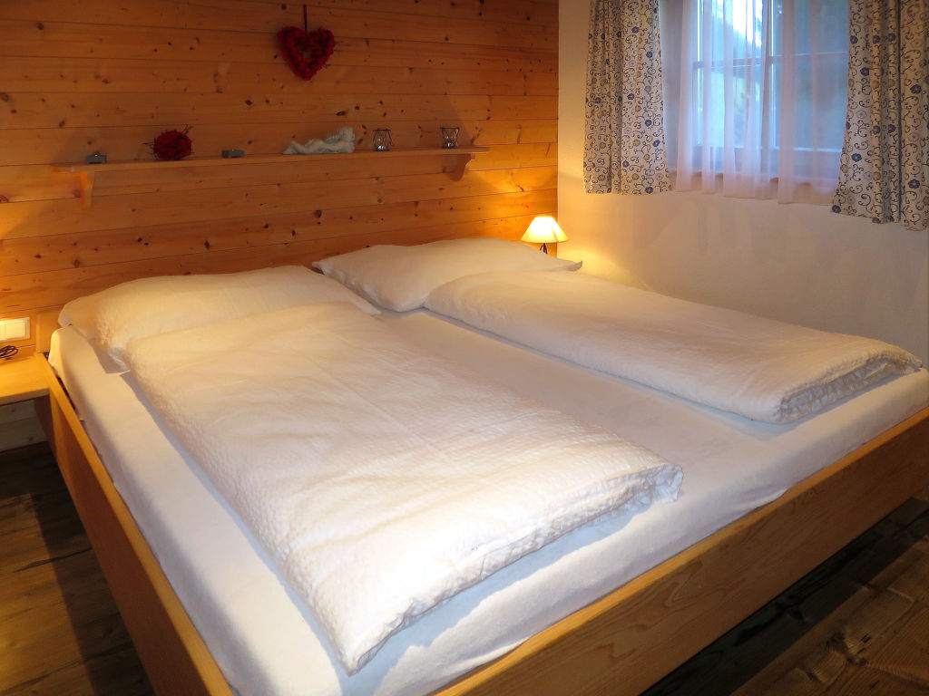 2½-Zimmer-Haus, 2 Ebenen, ca. 60 m². Zugang über Außentreppe ins Erdgeschoss (Hanglage): Wohnküche (4 Ceranfelder, Backofen, Geschirrspüler, Kühlschrank, Kaffeemaschine, Wasserkocher, Toaster) mit Essplatz (Eckbank) und Kaminofen (Holz inklusive). Doppelzimmer. Dusche/WC. Von der Küche Treppe zu offener Galerie (Dachschräge, teils eingeschränkte Stehhöhe) mit Doppelbett und Einzelbett. Hinweis: Bei Buchung zum Preis für 2 Personen steht die Schlafgalerie nicht zur Verfügung. Bei Belegung mit weniger Personen als der maximalen Personenzahl stehen nicht alle Wohneinheiten zur Verfügung.