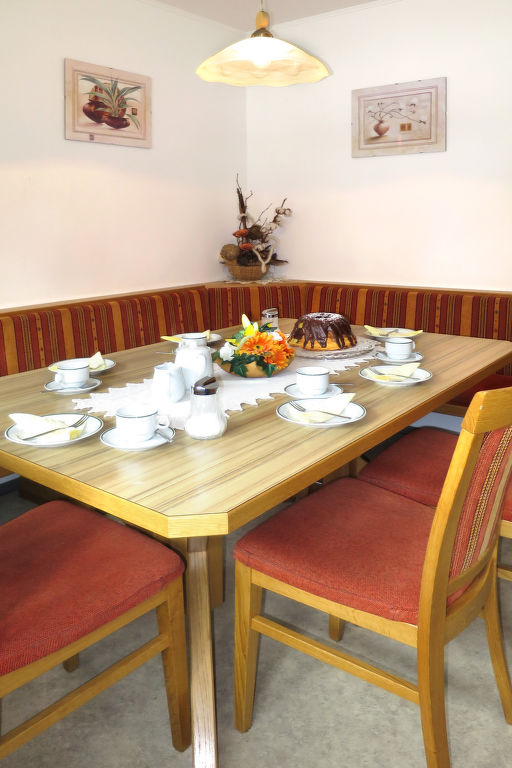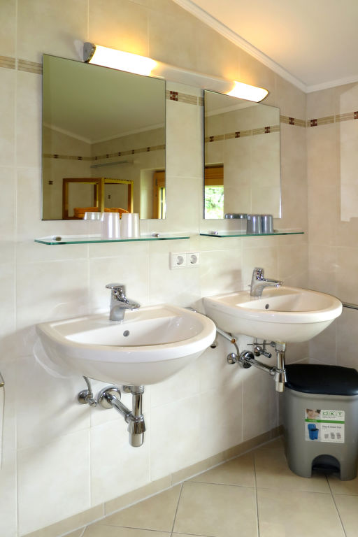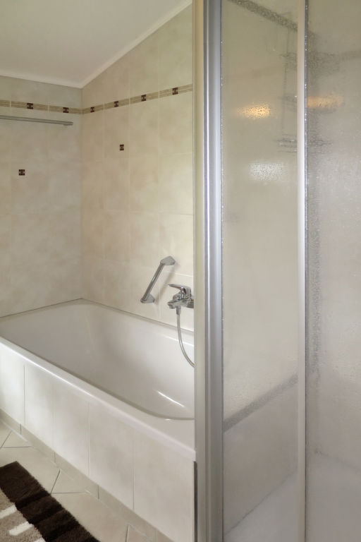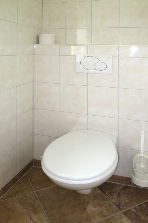 4-Zimmer-Haus, ca. 90 m². Zugang über Außentreppe in die 1. Etage (Hanglage): Flur mit Garderobe. Wohn-/Schlafraum mit Doppelbettcouch und Terrassenausgang. Küche (4 Ceranfelder, Backofen, Mikrowelle, Geschirrspüler, Kühl-/Gefrierkombination, Kaffeemaschine, Wasserkocher, Toaster) mit Essplatz (Eckbank). 2x Doppelzimmer. Zweibettzimmer. Bad/Dusche/Doppelwaschbecken. Sep.WC. Bei Belegung mit weniger Personen als der maximalen Personenzahl stehen nicht alle Wohneinheiten zur Verfügung. REG.NR.:506150001822020