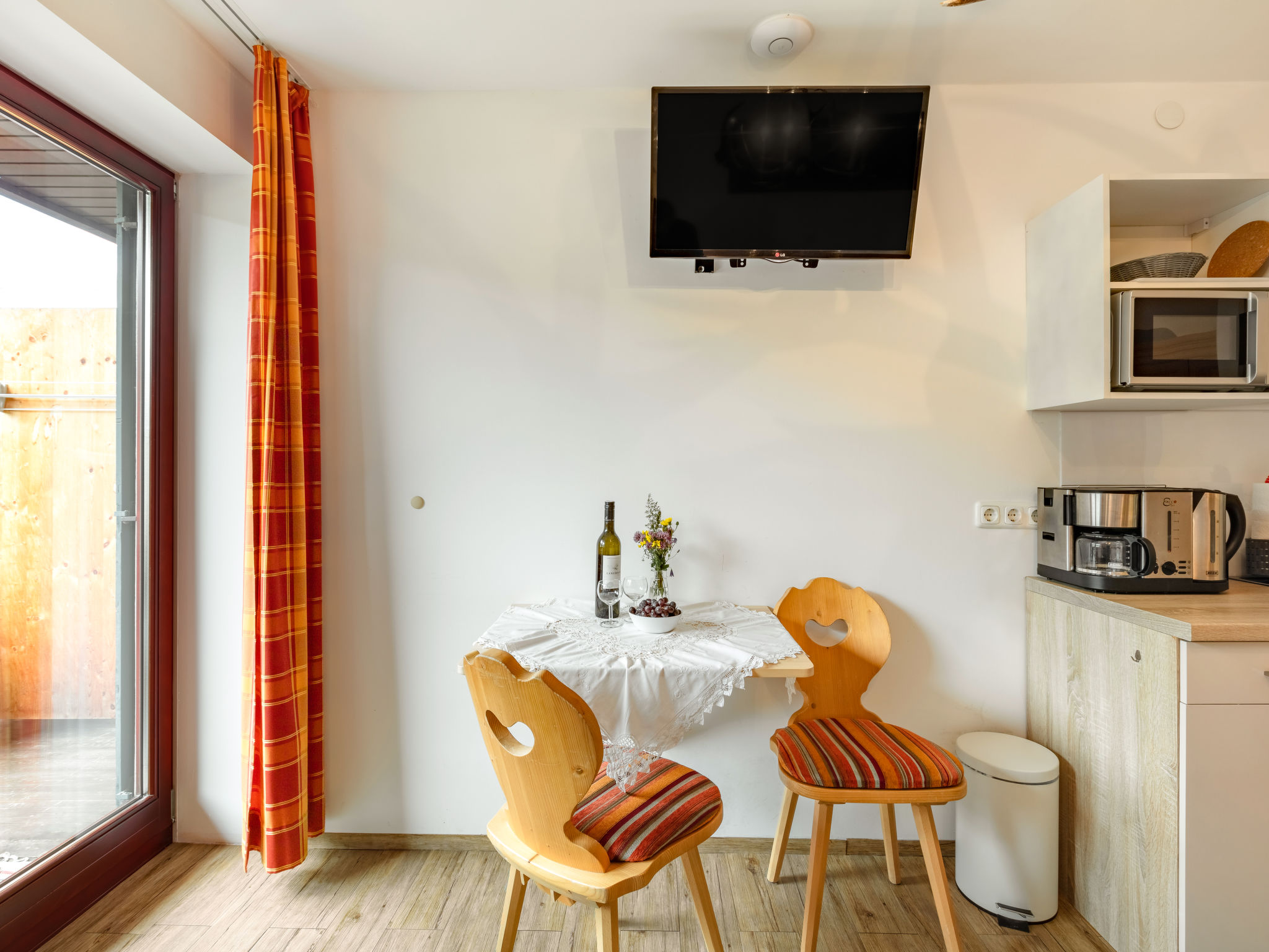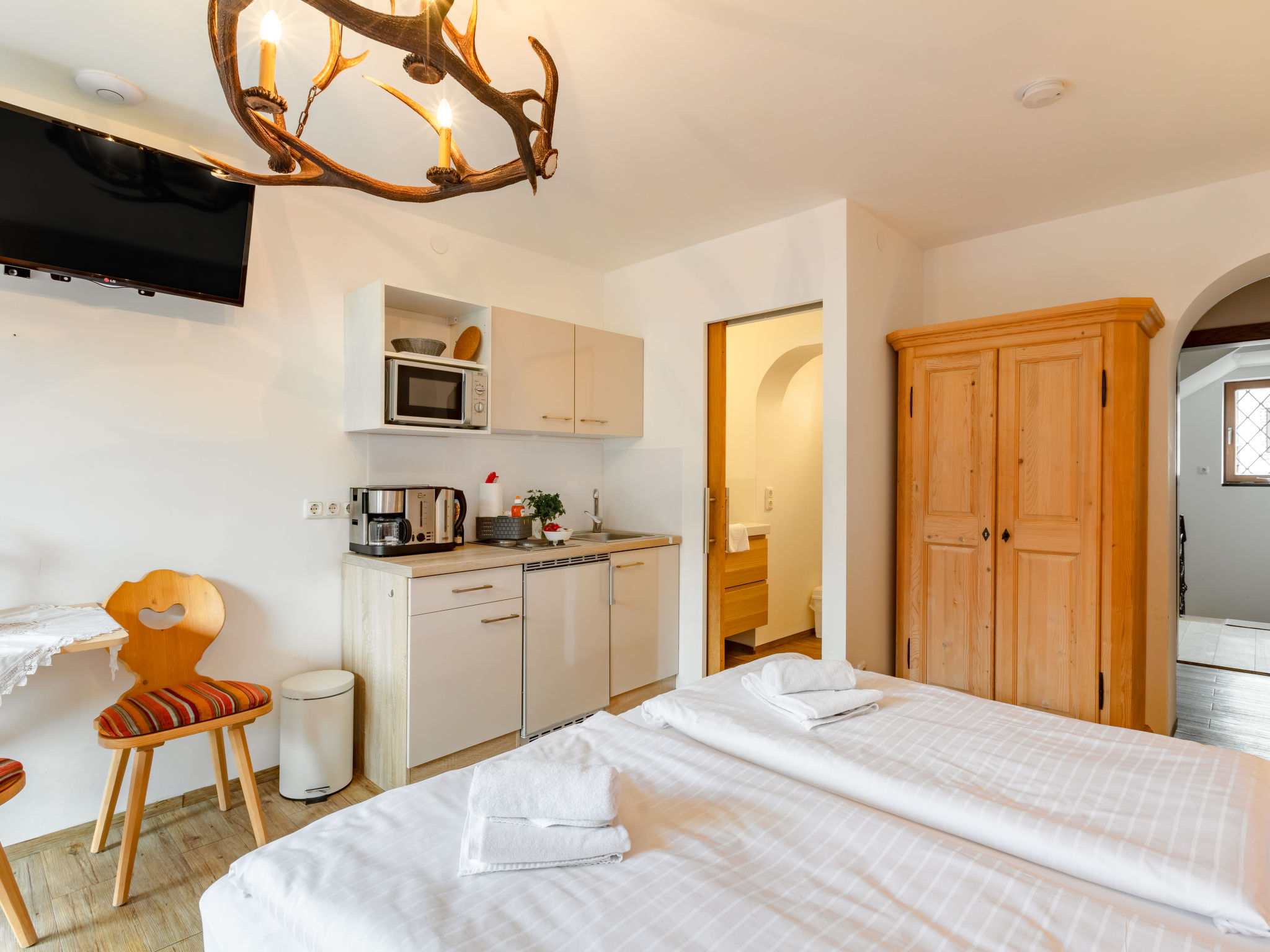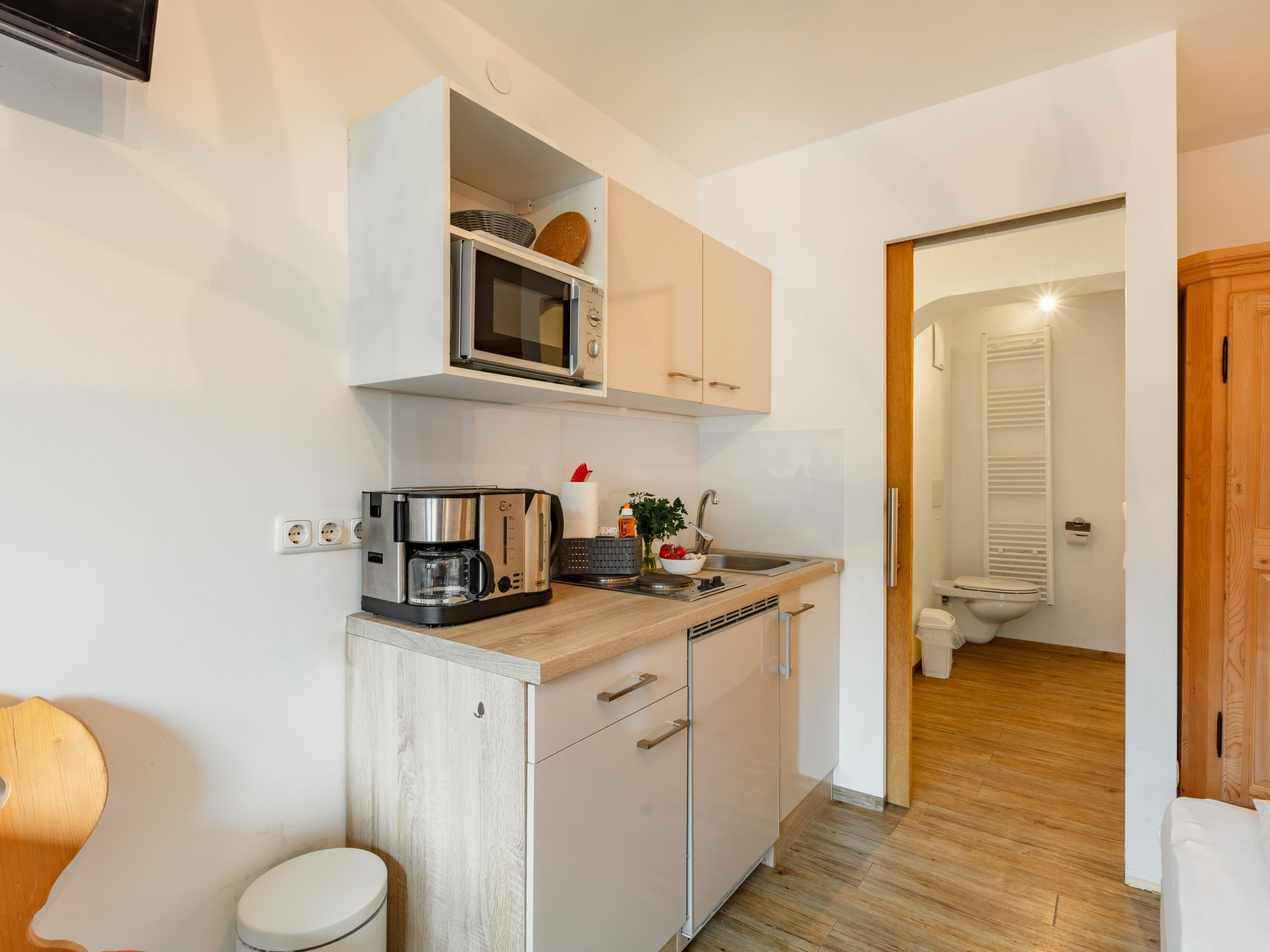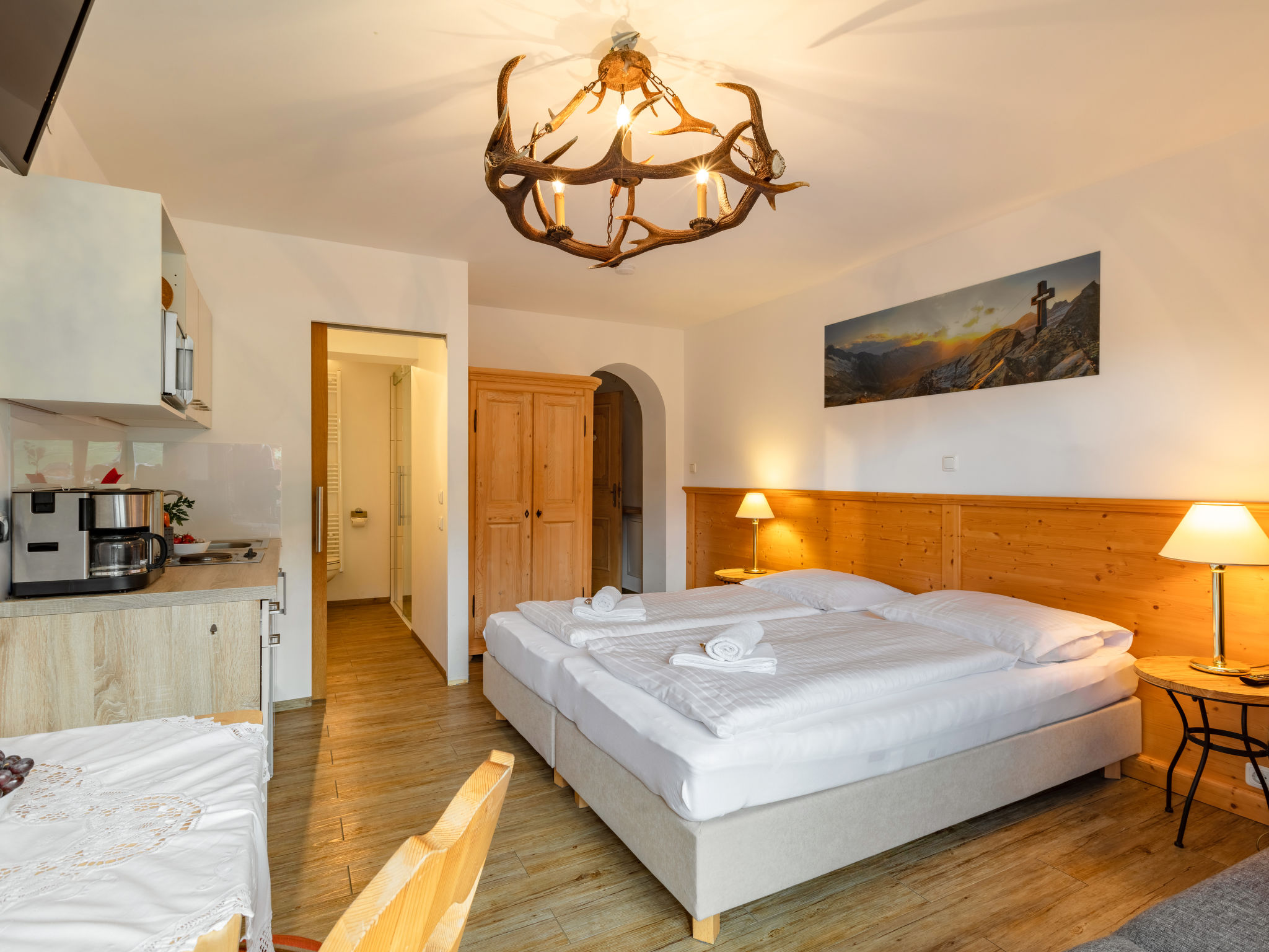 "Apartment Mittagssonne", 1-Zimmer-Studio 30 m2 im 1. Stock. Hell, komfortabel eingerichtet: Wohn-/Schlafzimmer mit 1 Doppelbett, Esstisch und Sat-TV (Flachbildschirm). Kochnische (2 Glaskeramikherd Platten, Wasserkocher, elektrische Kaffeemaschine, Kombinationsmikrowelle). Dusche/WC. Balkon 7 m2, Südlage. Balkonmöbel. Schöne Sicht auf die Hohen Tauern. Zur Verfügung: Kinderhochstuhl, Babybett, Haartrockner. Internet (Wireless LAN, gratis). Bitte beachten: Nichtraucher-Unterkunft. 50614-006260-2021