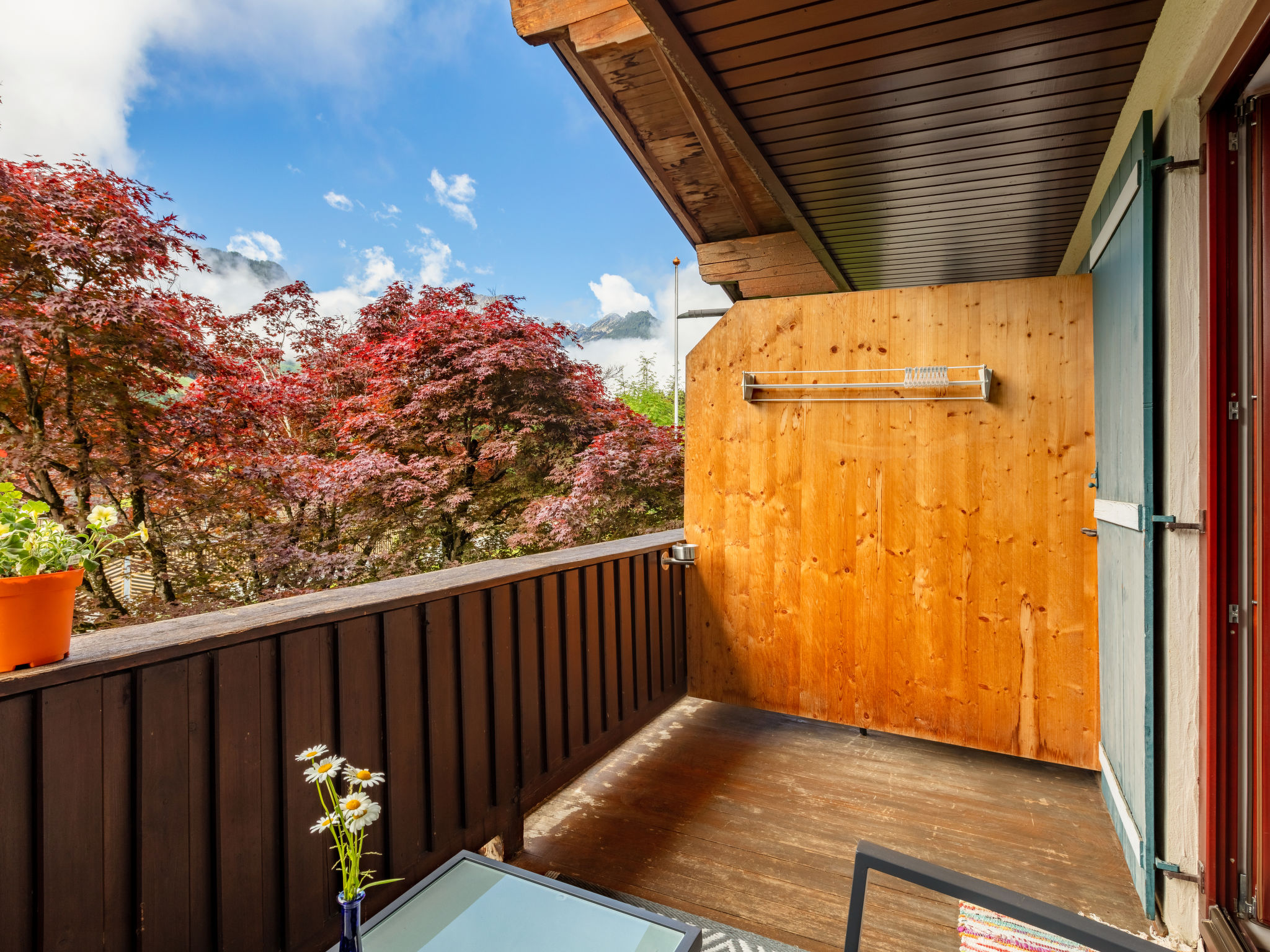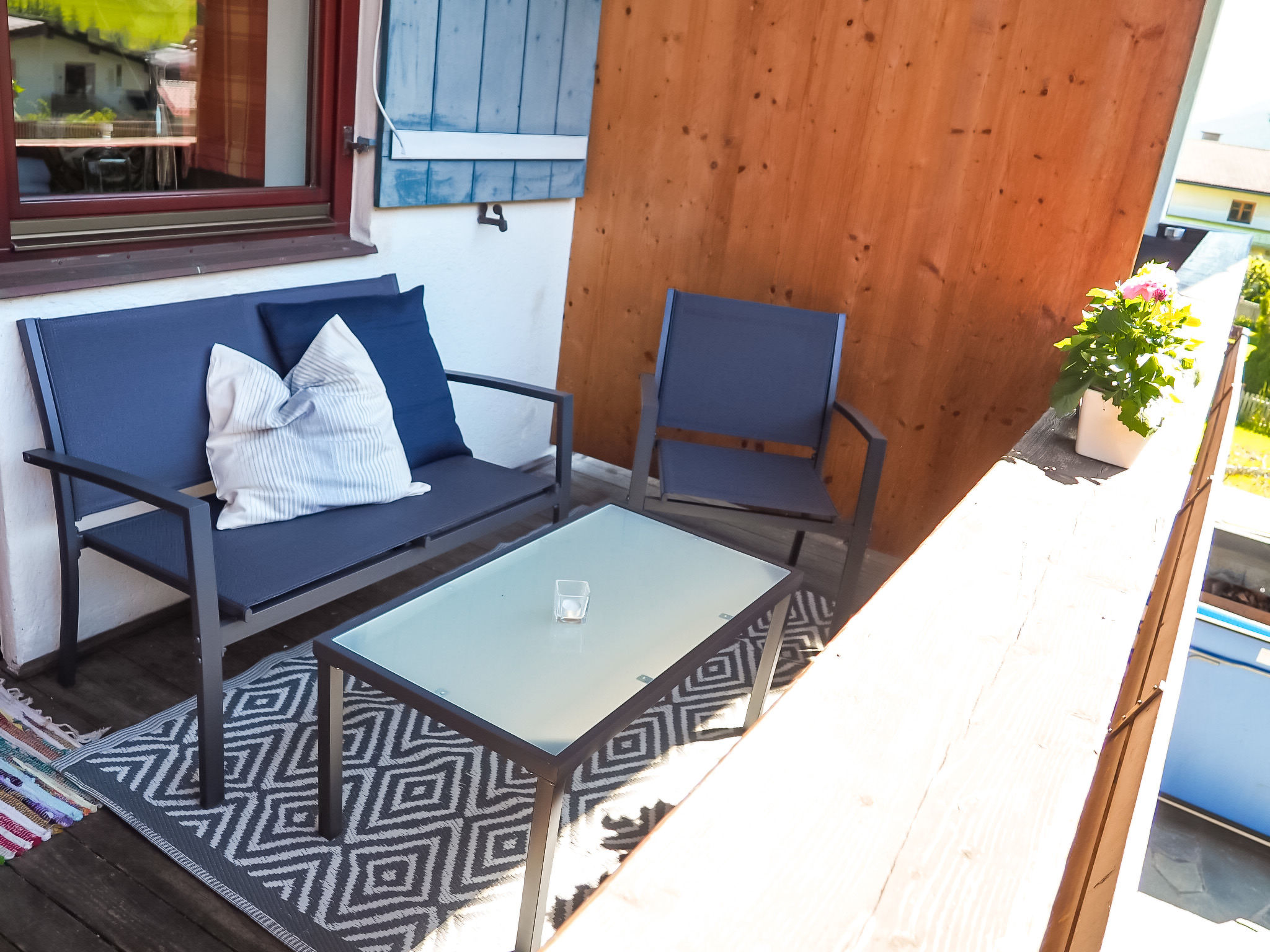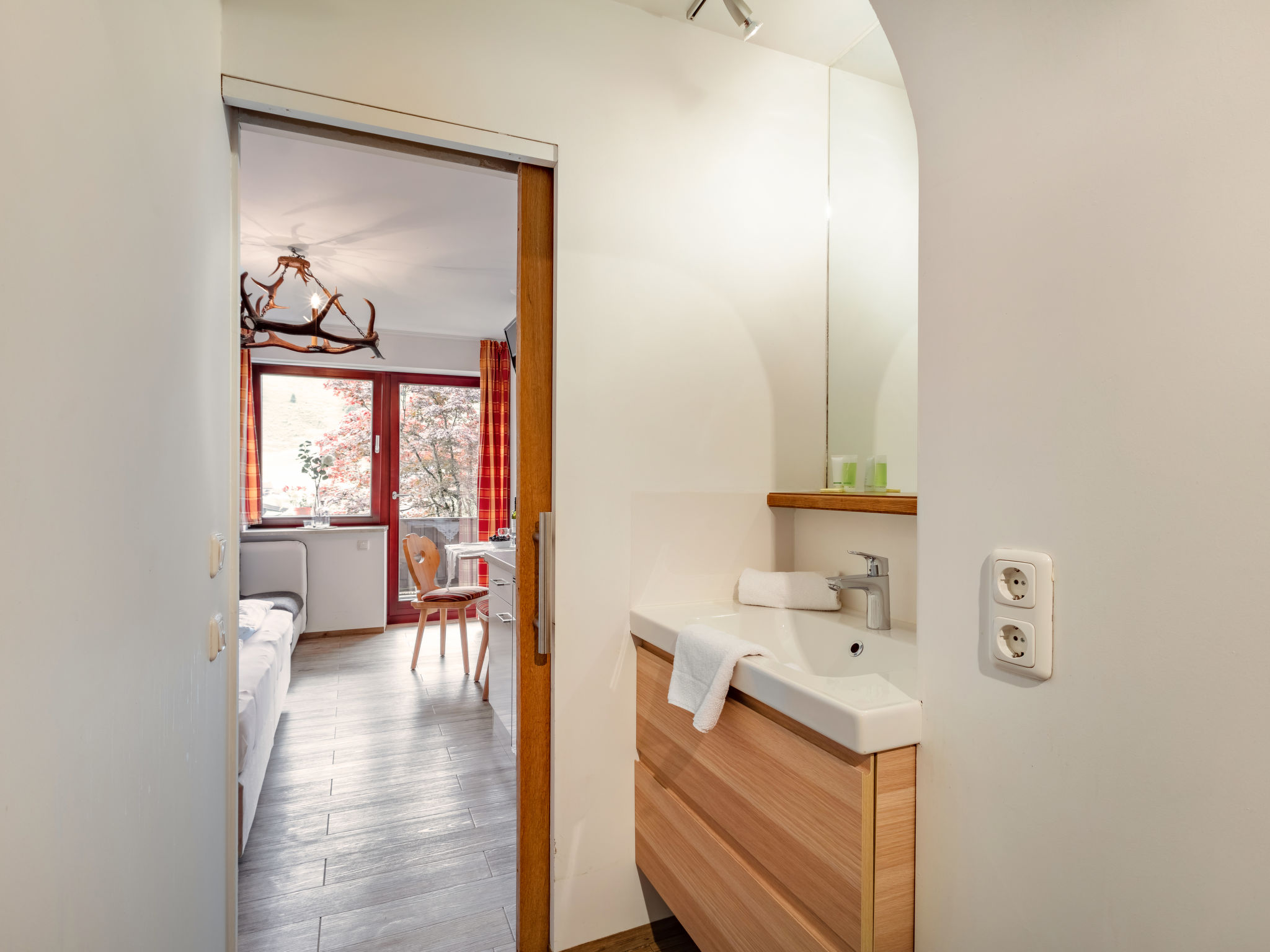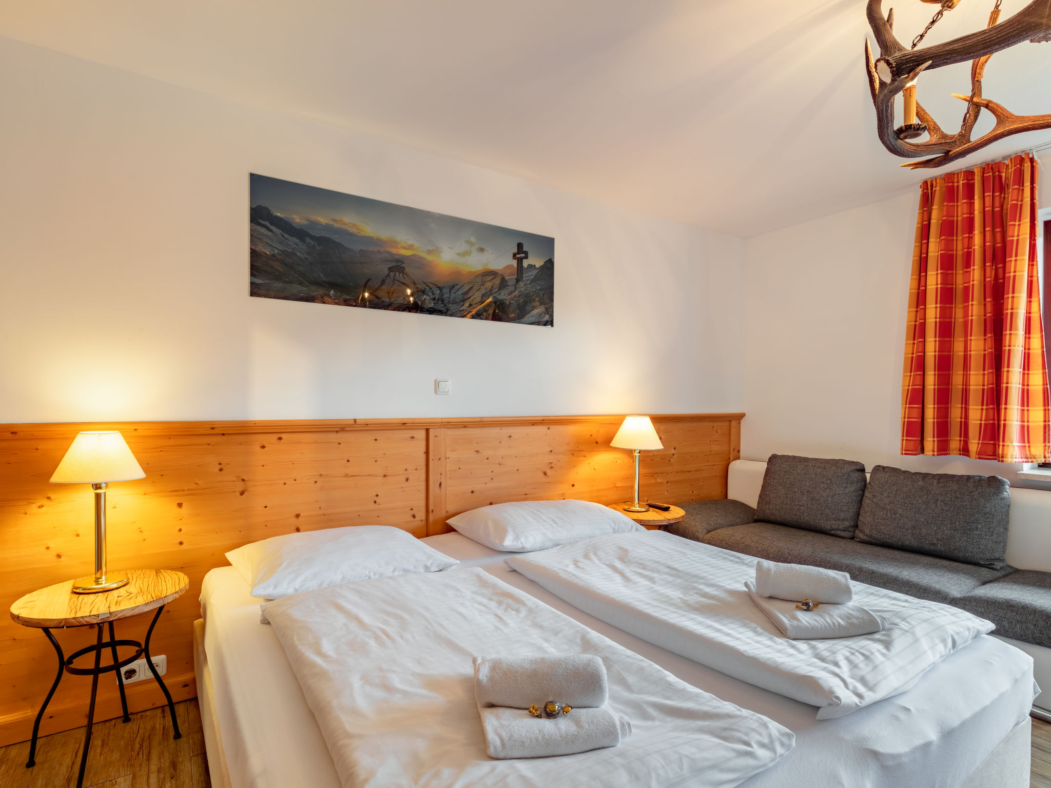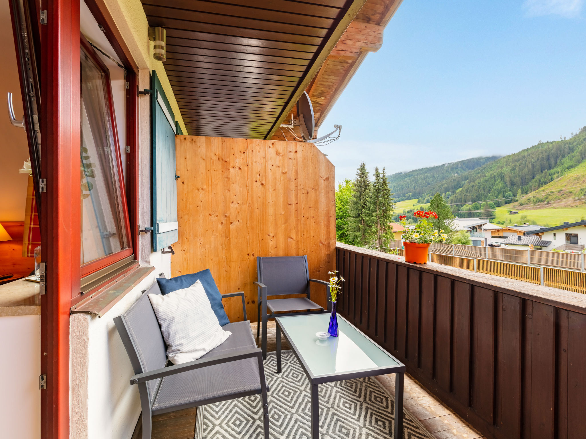"Apartment Mittagssonne", 1-Zimmer-Studio 30 m2 im 1. Stock. Hell, komfortabel eingerichtet: Wohn-/Schlafzimmer mit 1 Doppelbett, Esstisch und Sat-TV (Flachbildschirm). Kochnische (2 Glaskeramikherd Platten, Wasserkocher, elektrische Kaffeemaschine, Kombinationsmikrowelle). Dusche/WC. Balkon 7 m2, Südlage. Balkonmöbel. Schöne Sicht auf die Hohen Tauern. Zur Verfügung: Kinderhochstuhl, Babybett, Haartrockner. Internet (Wireless LAN, gratis). Bitte beachten: Nichtraucher-Unterkunft. 50614-006260-2021