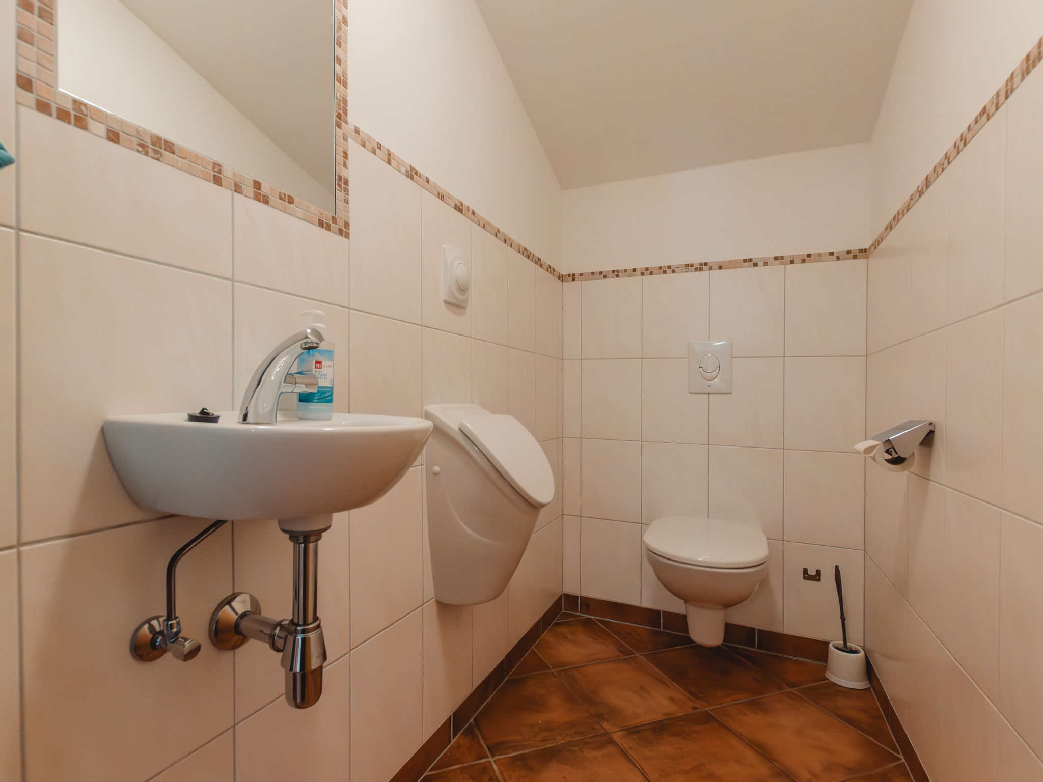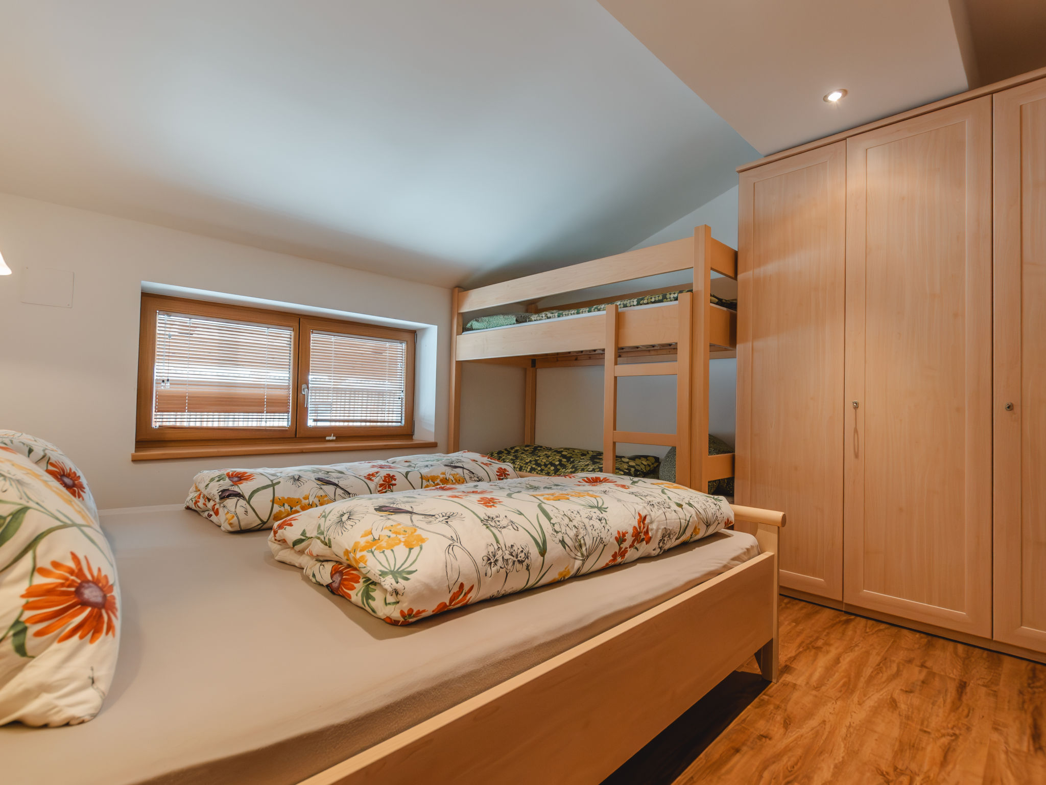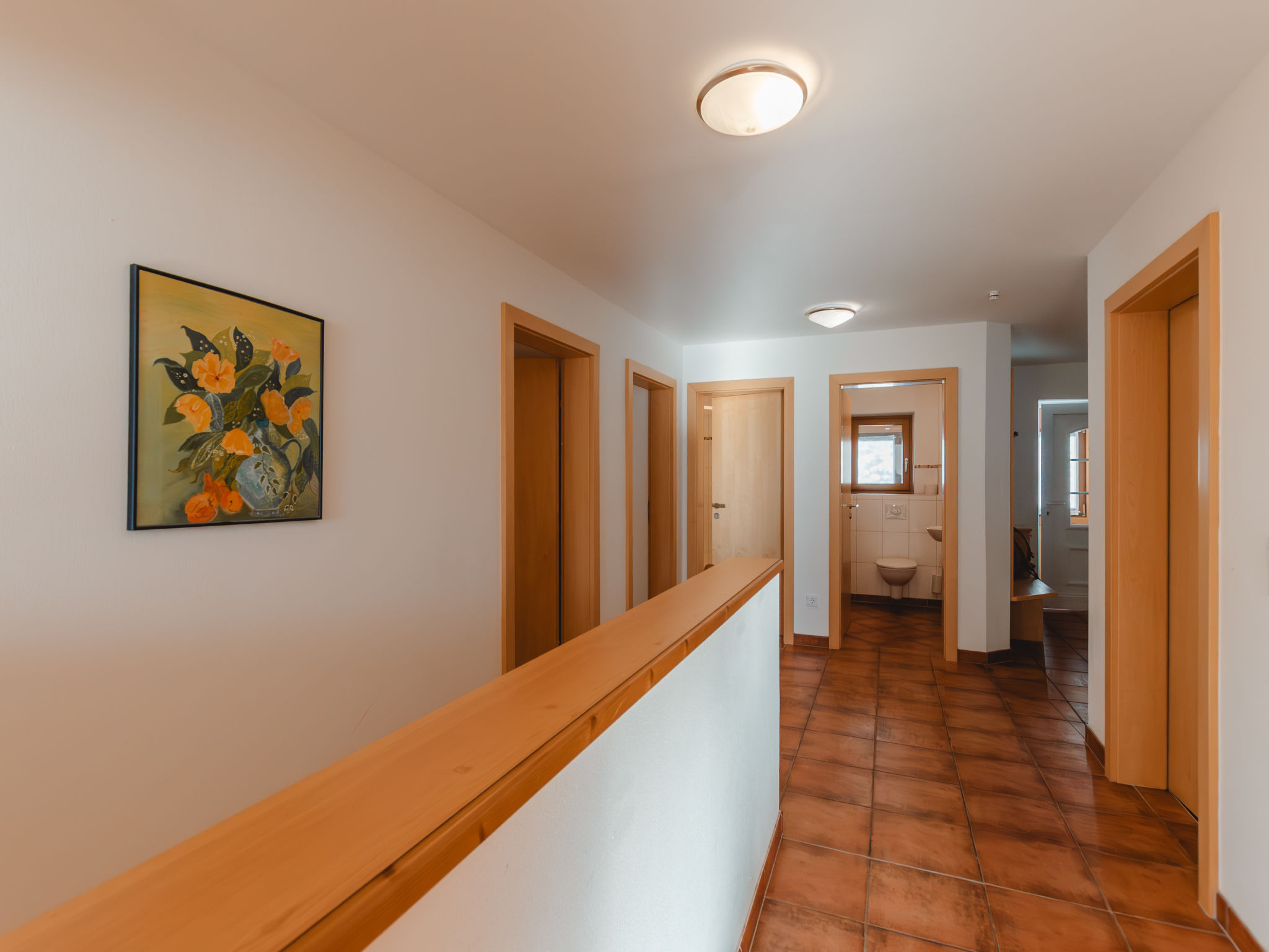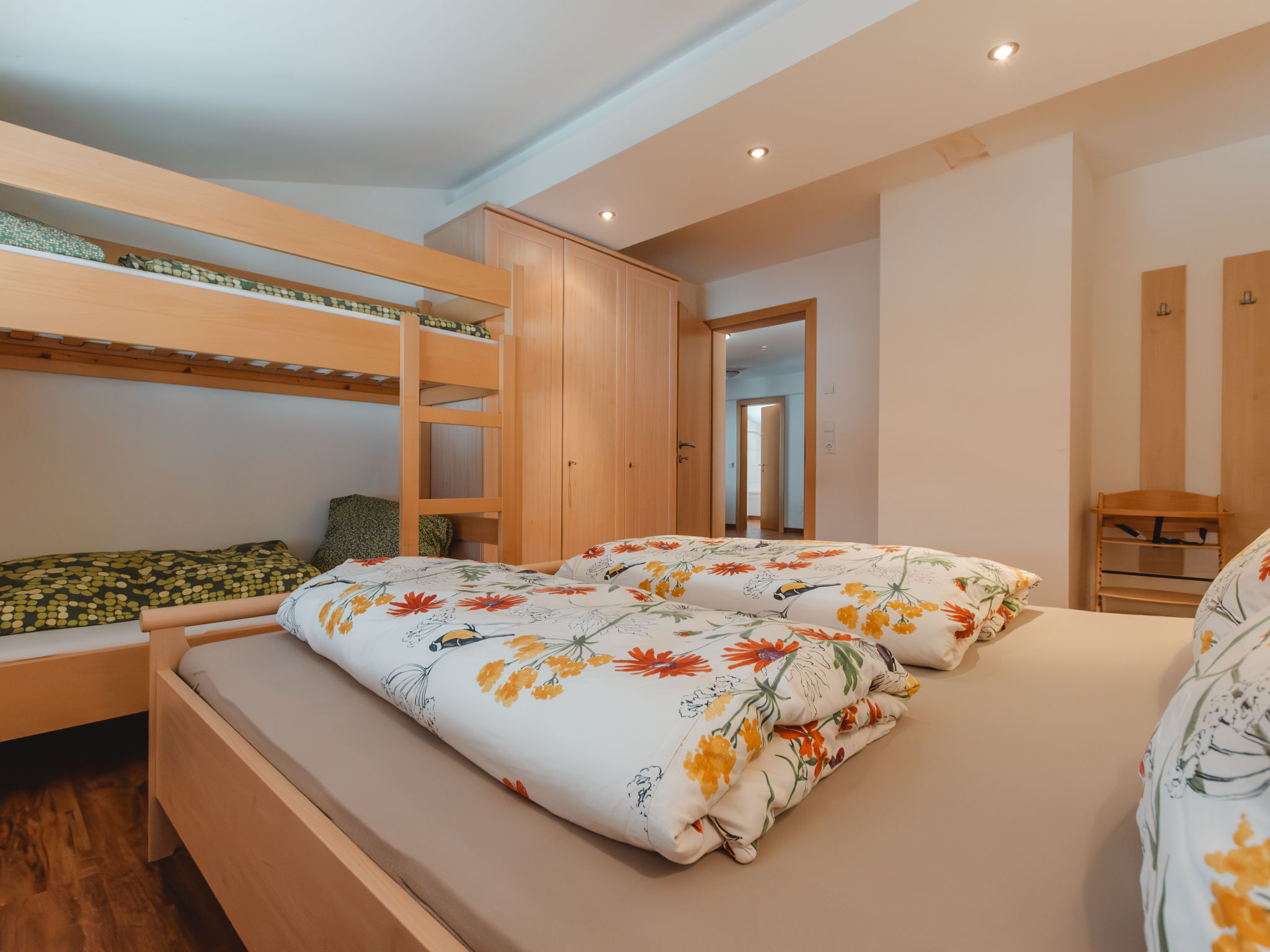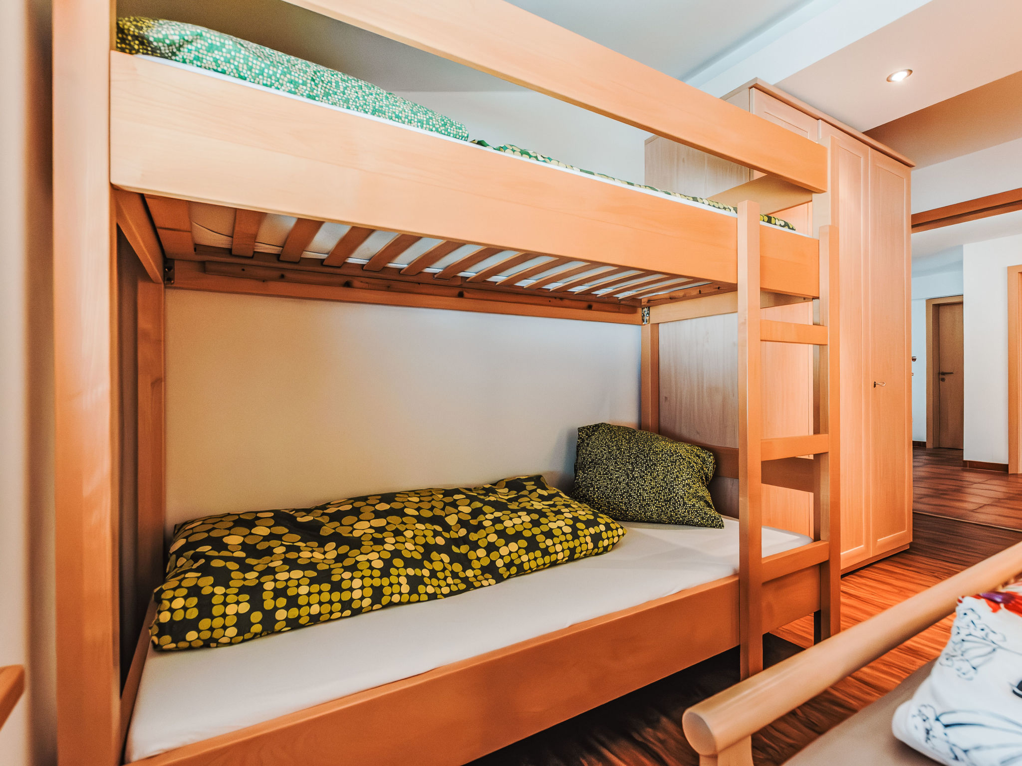 4-Zimmer-Wohnung, 2. Etage (leichte Dachschräge), ca. 120 m². Separater Eingang über Außentreppe. Wohnraum mit Sitzgruppe, Balkonausgang. Küche (4 Ceranfelder, Backofen, Mikrowelle, Geschirrspüler, Kühlschrank, Kaffeemaschine, Wasserkocher) mit Essplatz (Eckbank), Balkonausgang. 2 Schlafzimmer, jeweils mit Doppelbett und Etagenbett. Doppelzimmer. 2x Bad/Dusche. 2x sep.WC. Bei Belegung mit weniger Personen als der maximalen Personenzahl stehen nicht alle Wohneinheiten zur Verfügung. REG.NR.:50601-000641-2020