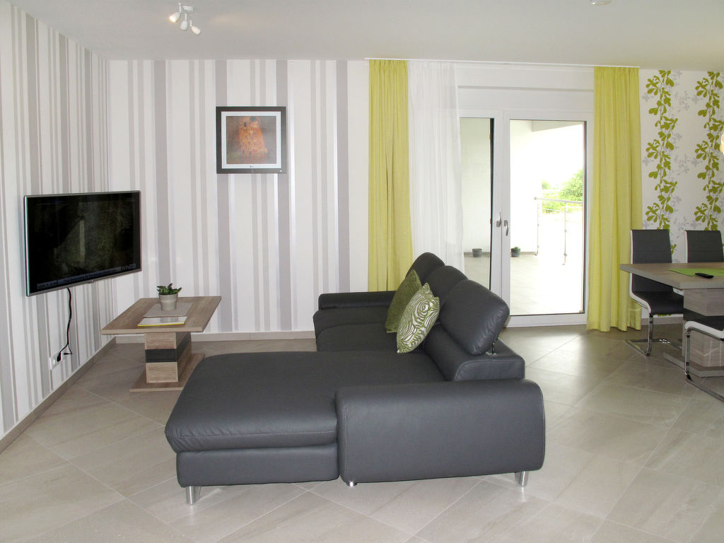 3-Zimmer-Wohnung, 1. Etage, ca. 80 m². Wohn-/Schlafraum mit Sitzgruppe/Doppelbettcouch, Essplatz, Küchenzeile (4 Ceranfelder, Backofen, Geschirrspüler, Kühlschrank, Kaffeemaschine, Wasserkocher, Toaster) und Balkonausgang. Doppelzimmer mit Dusche/WC. Doppelzimmer. Bad/WC. Bei Belegung mit weniger Personen als der maximalen Personenzahl stehen nicht alle Wohneinheiten zur Verfügung.