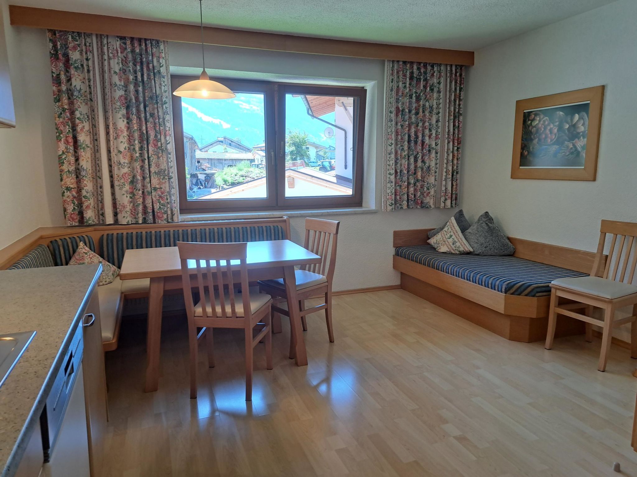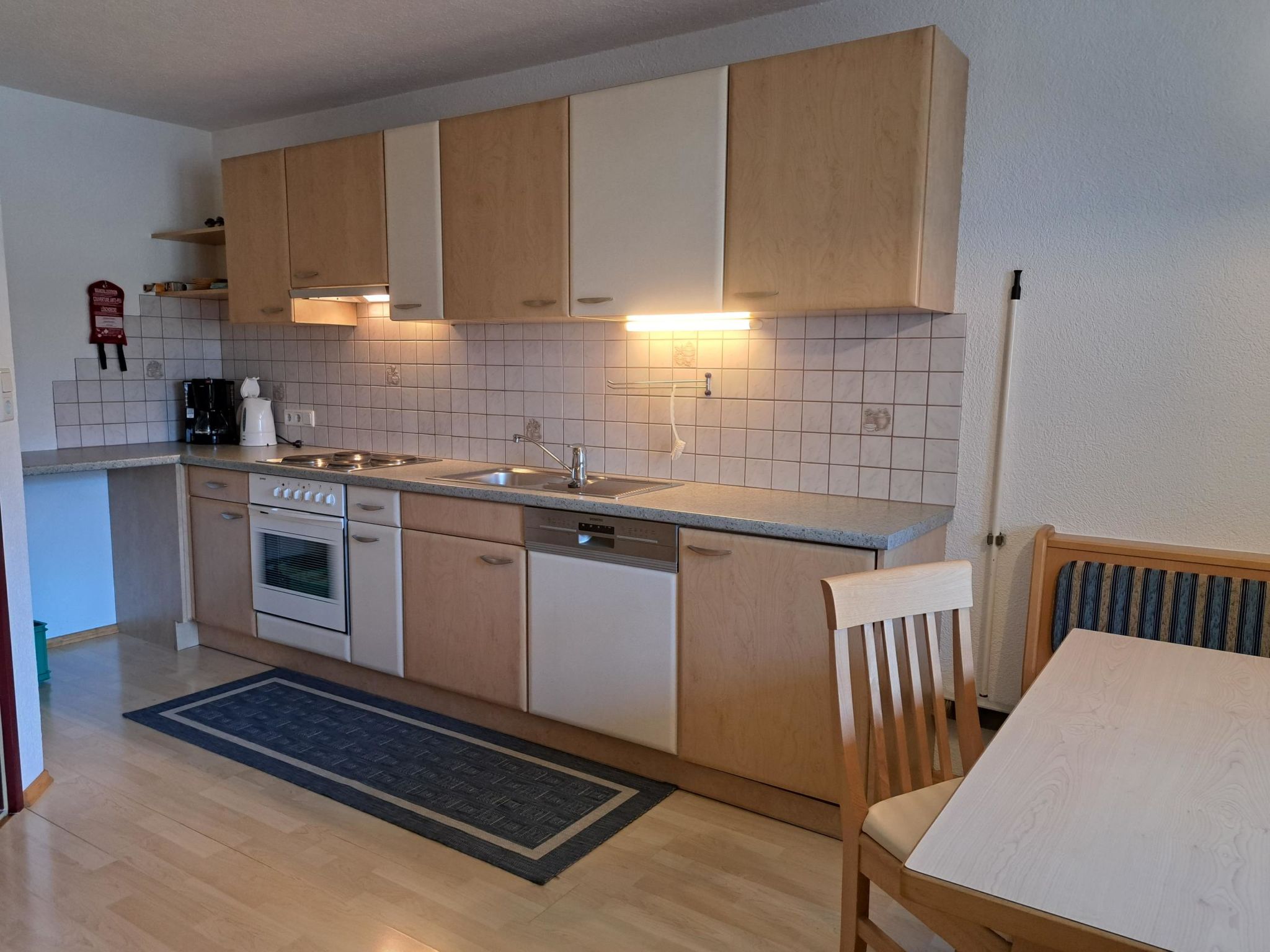 2-Zimmer-Wohnung, Erdgeschoss, ca. 43 m². Wohnküche (4 Platten, Backofen, Geschirrspüler, Kühlschrank, Kaffeemaschine, Wasserkocher, Toaster) mit Essplatz (Eckbank) und Doppelbettcouch. Doppelzimmer. Dusche/WC.Maximale Belegung: 2 Erwachsene und 2 Kinder bis 14 Jahre.