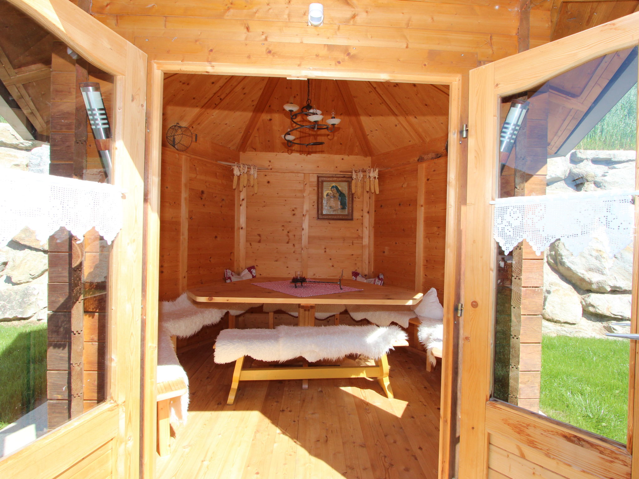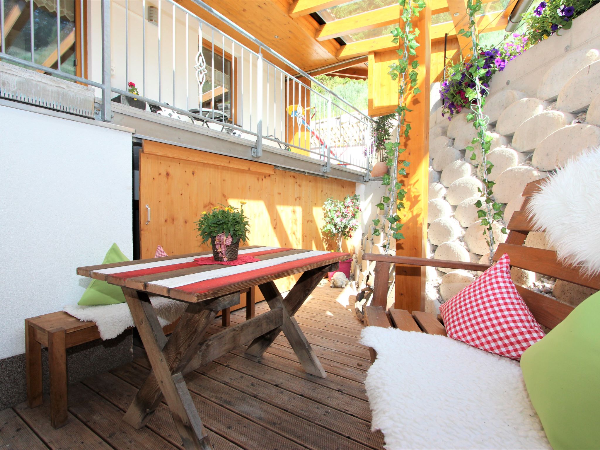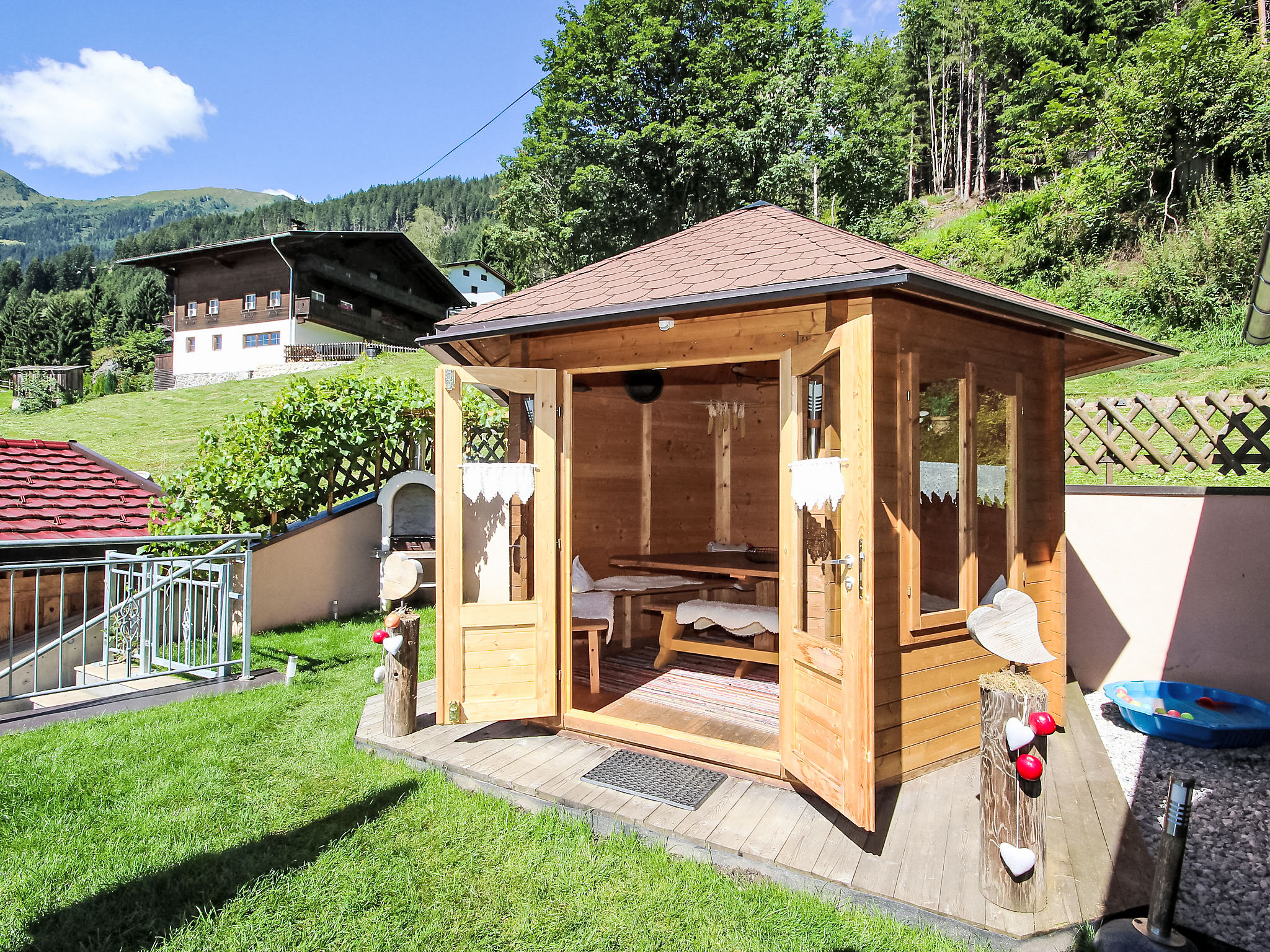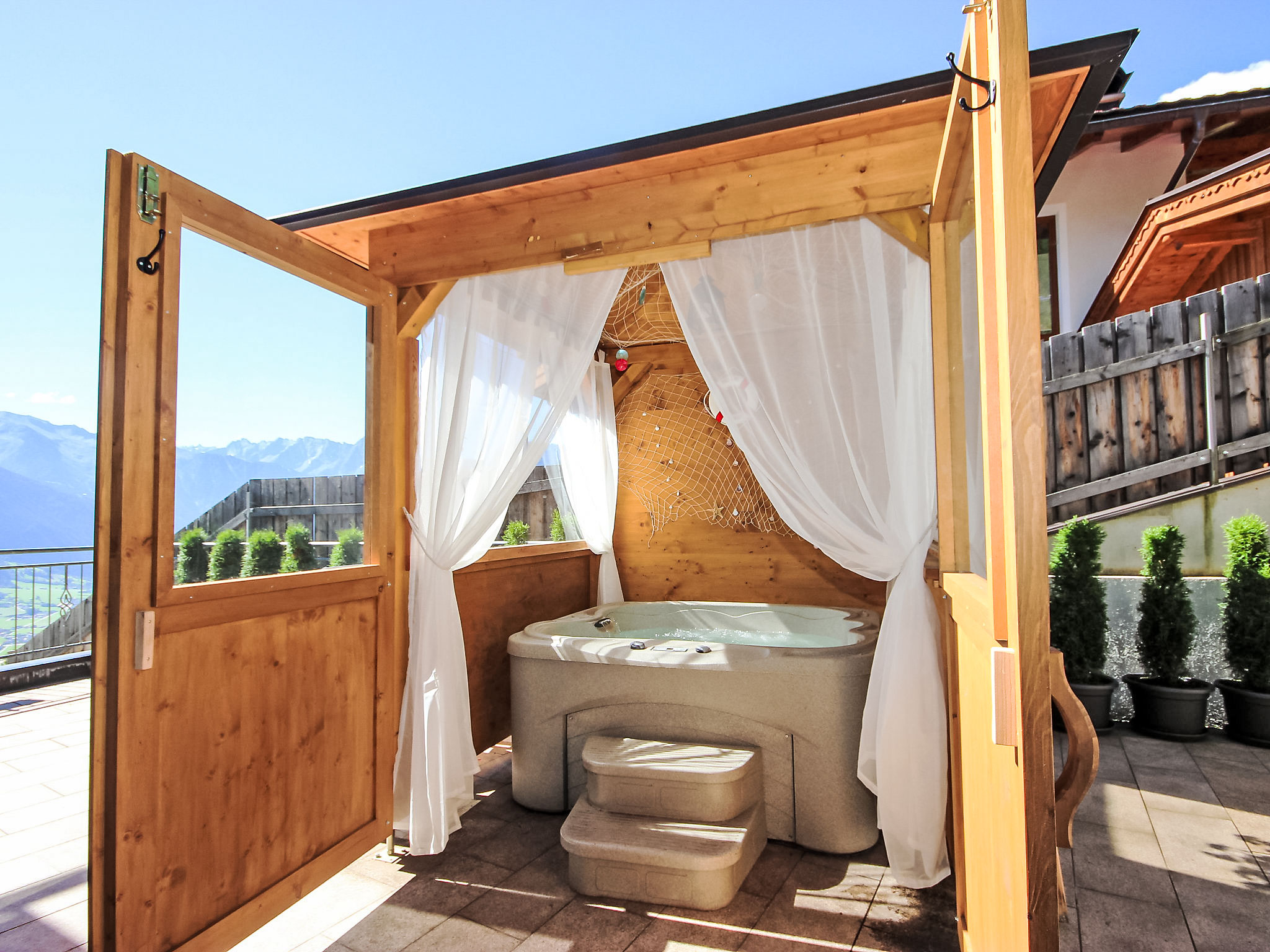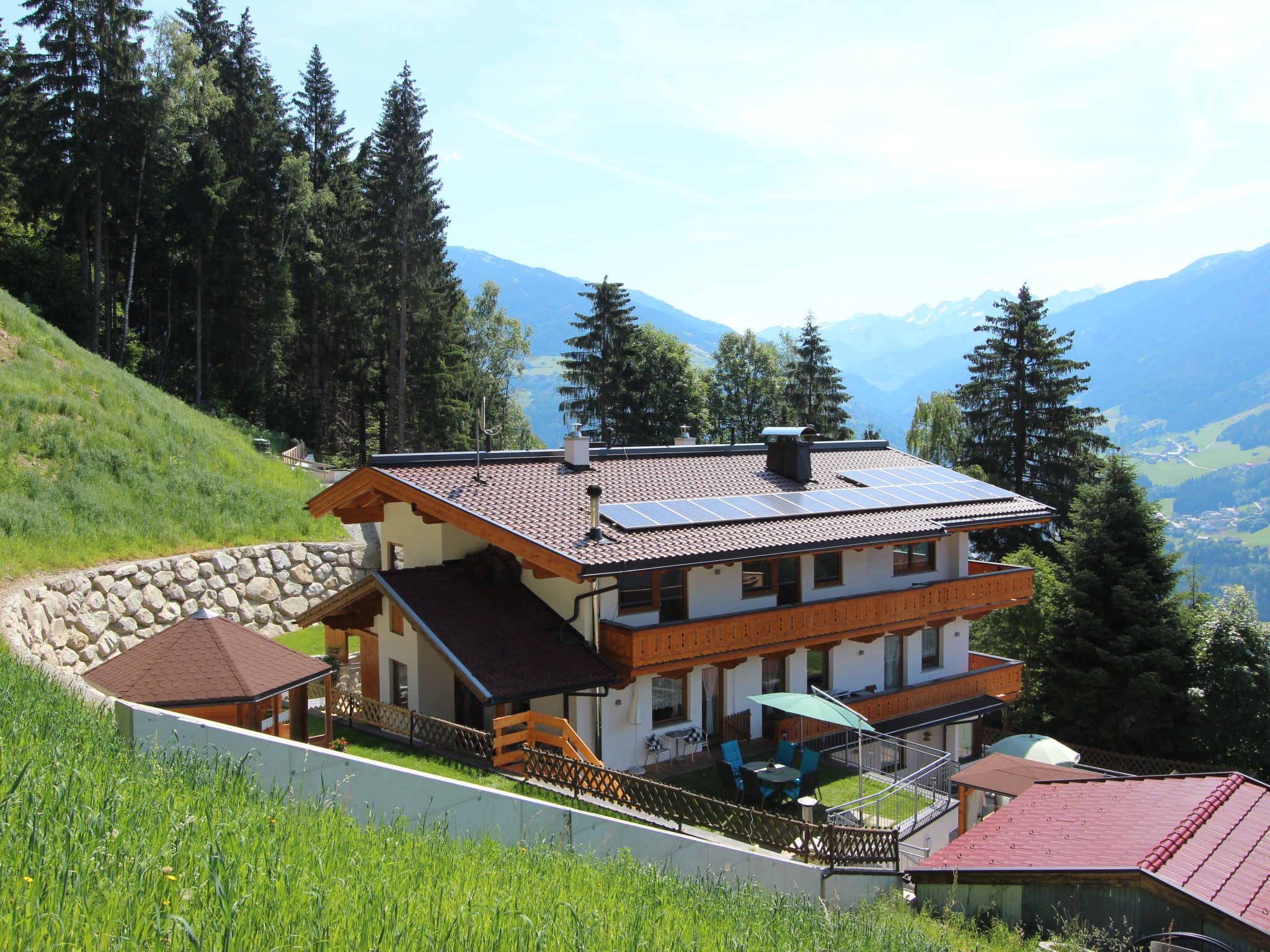 Zellberg 4 km von Zell am Ziller: In traumhafter Aussichtslage, mit einem einzigartigen Wellnessbereich ausgestattetes, kinderfreundliches, komfortables Landhaus "Anita", 960 m.ü.M.. Oberhalb von Zell am Ziller, im Ortsteil Zellberg, 4.5 km vom Zentrum, ruhige, sonnige, erhöhte Lage am Hang, 6 km vom Skigebiet. Zur Mitbenutzung: schöner, gepflegter Terrassengarten, Liegewiese. Sprudelbad, Gartenmöbel, Grill, Grillhaus, Kinderspielplatz. Im Hause: Wireless LAN, Sauna, Dampfbad, Wellnessbereich, Einstellraum für Fahrräder, Skiraum, Zentralheizung, Skischuhtrockner. Handtuchwechsel 2 mal wöchentlich. Zufahrt bis zum Haus. Im Winter bitte Schneeketten mitbringen. Parkplatz beim Haus. Supermarkt 4.5 km, Restaurant 1.3 km, Freibad 4.5 km. Gondelbahn 6 km, Skibushaltestelle 10 m. Bekannte Skigebiete sind gut erreichbar: Zillertal Arena 6 km, Ski-Zillertal-3000 8 km. Bitte beachten: Gratis Skibus. In diesem Haus sind weitere Ferienwohnungen mietbar. Die Benützung des Wellnessbereichs ist pro Wohnung täglich 2 Stunden inklusive. Ein einzigartiges Erlebnis bietet das Dampfbad "Aqua Life", eine Zedern Holzwanne, die mit reinem Quellwasser gefüllt und auf 35 - 40 Grad erwärmt wird. Badetücher, Bademäntel und Gästepantoffel stehen in jeder Wohnung für Sie kostenlos bereit. Der Gartenpavillon ist beheizt und bietet Platz für 10 Personen. Spielsachen verfügbar.