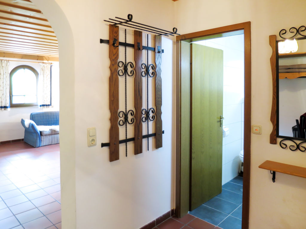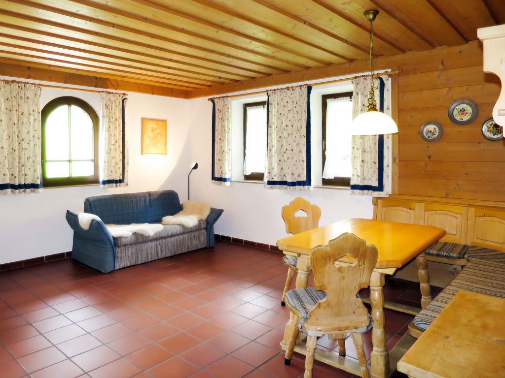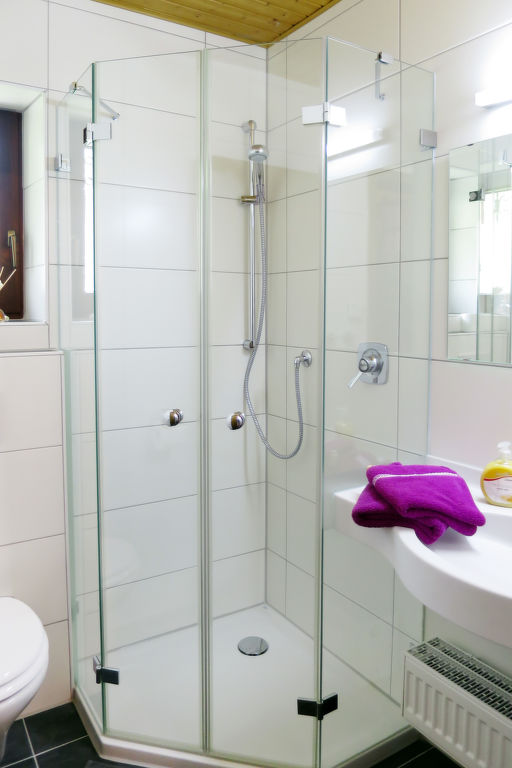 3-Zimmer-Wohnung, Erdgeschoss, ca. 50 m². Vorraum mit Garderobe. Wohn-/Schlafraum mit Bettcouch, Essplatz (Eckbank) und Küchenzeile (4 Ceranfelder, Backofen, Geschirrspüler, Kühlschrank, Kaffeemaschine, Wasserkocher, Toaster). Doppelzimmer. Kleines Doppelzimmer. Dusche/WC.