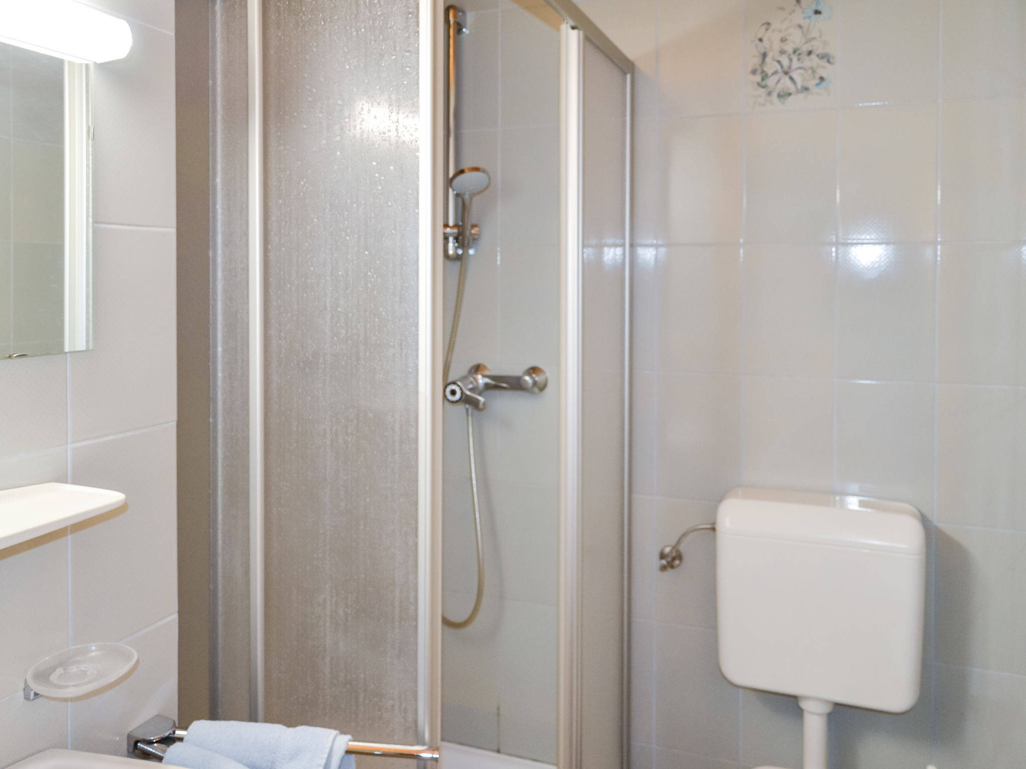 1-Zimmer-Wohnung, 2. Etage (Dachgeschoss), ca. 30 m². Wohn-/Schlafraum mit Doppelbett, Essplatz, Kochnische (2 Platten, Mikrowelle, Kühlschrank, Kaffeemaschine), Balkonausgang. Dusche/WC.
