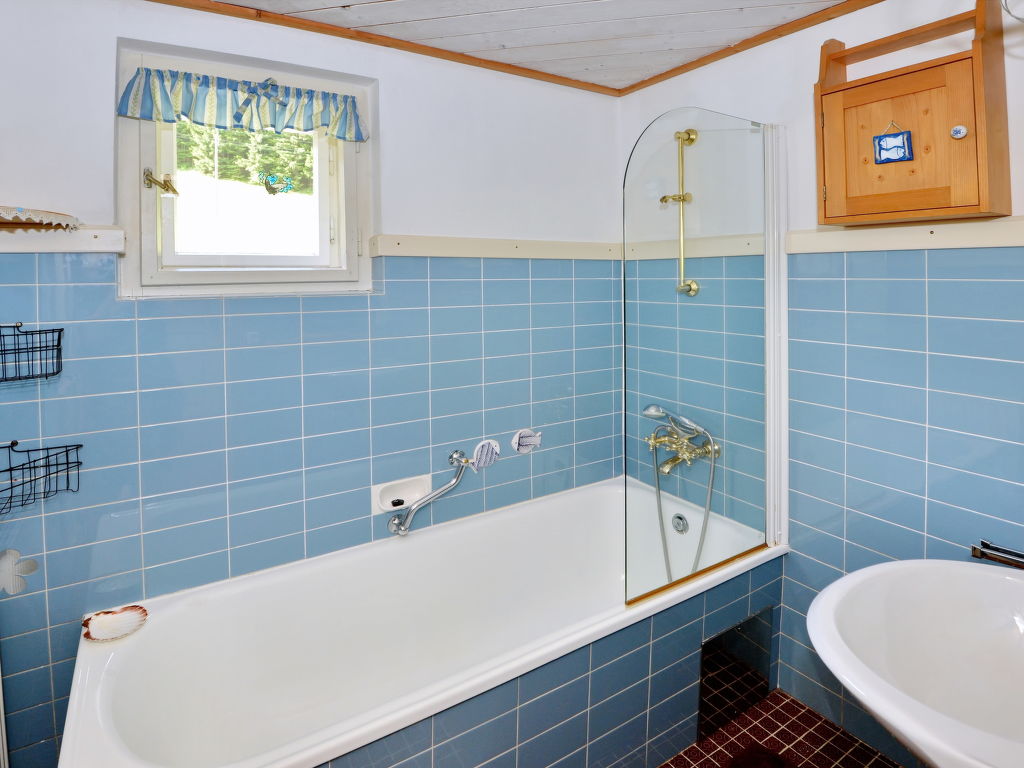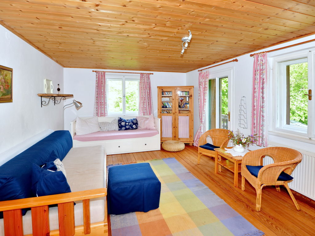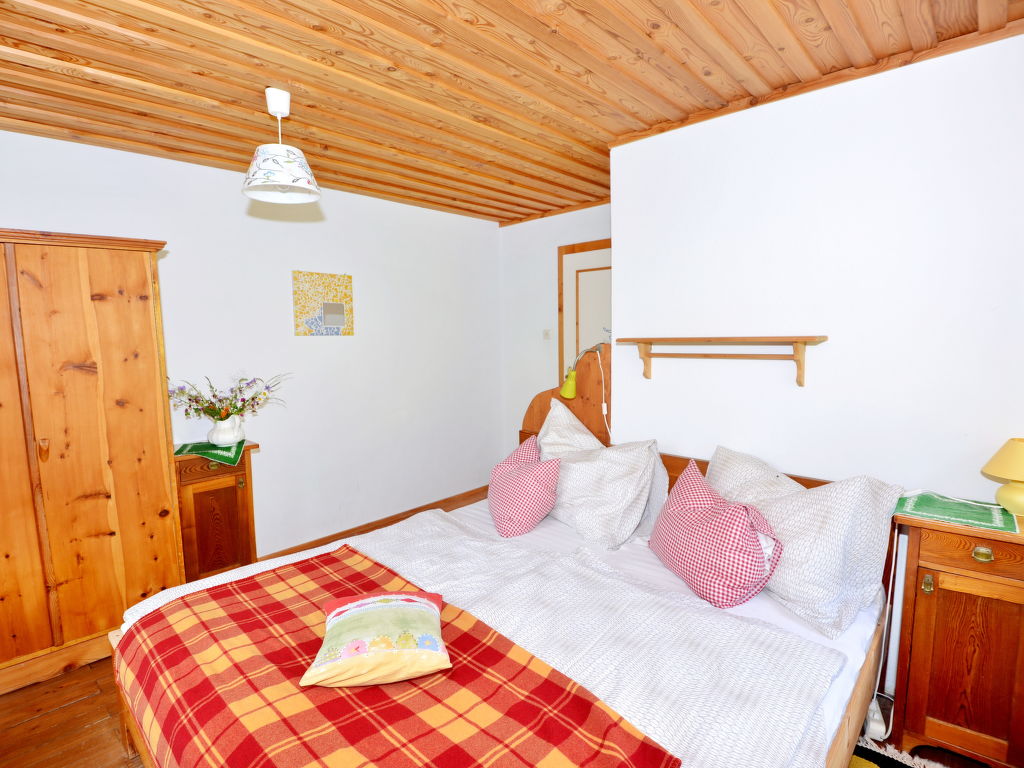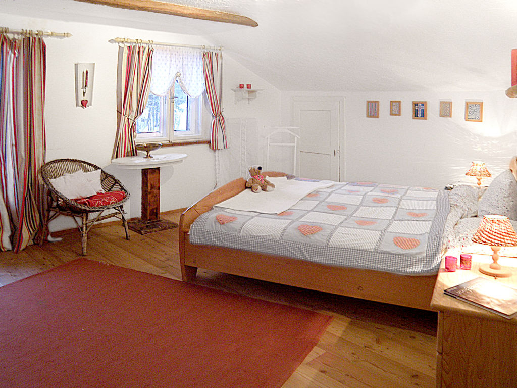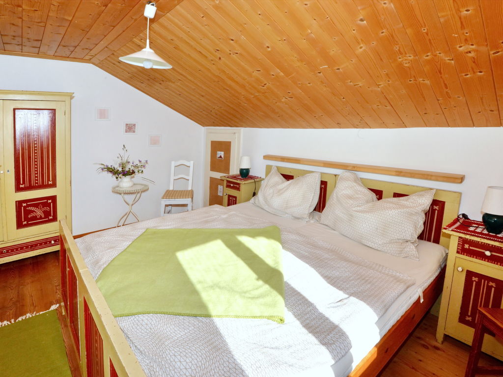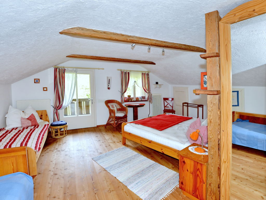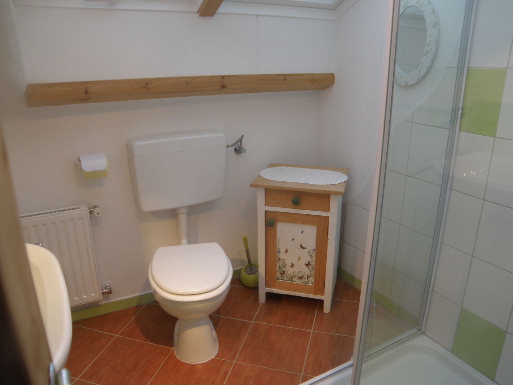 4-Zimmer-Wohnung, 2 Etagen, ca. 115 m². 1. Etage: Flur. Wohn-/Schlafraum mit 2 Einzelbetten (tagsüber als Sitzcouch verwendbar). Durch Schiebetür abgeteilte Wohnküche (4 Ceranfelder, Backofen, Mikrowelle, Geschirrspüler, Kühlschrank, Kaffeemaschine, Wasserkocher) mit Essplatz und Kachelofen. Doppelzimmer. Bad/Dusche. Sep.WC. 2. Etage (Dachschräge): Doppelzimmer mit Waschbecken. Schlafzimmer mit Doppelbett und 2 Einzelbetten. Dusche/WC (teilweise eingeschränkte Stehhöhe). Bei Belegung mit weniger Personen als der maximalen Personenzahl stehen nicht alle Wohneinheiten zur Verfügung.
