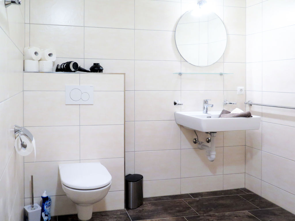 6-Zimmer-Wohnung, 1. Etage, ca. 150 m². Wohnküche (4 Ceranfelder, Backofen, Geschirrspüler, Kühl-/Gefrierkombination, Kaffeemaschine, Toaster) mit Essplatz und Ausgang ins Freie. 4 Doppelzimmer, jeweils mit Balkonausgang oder Ausgang ins Freie. Schlafzimmer mit Doppelbett und Einzelbett, Balkonausgang. Dusche/WC. Dusche/Doppelwaschbecken/WC. Bei Belegung mit weniger Personen als der maximalen Personenzahl stehen nicht alle Wohneinheiten zur Verfügung.