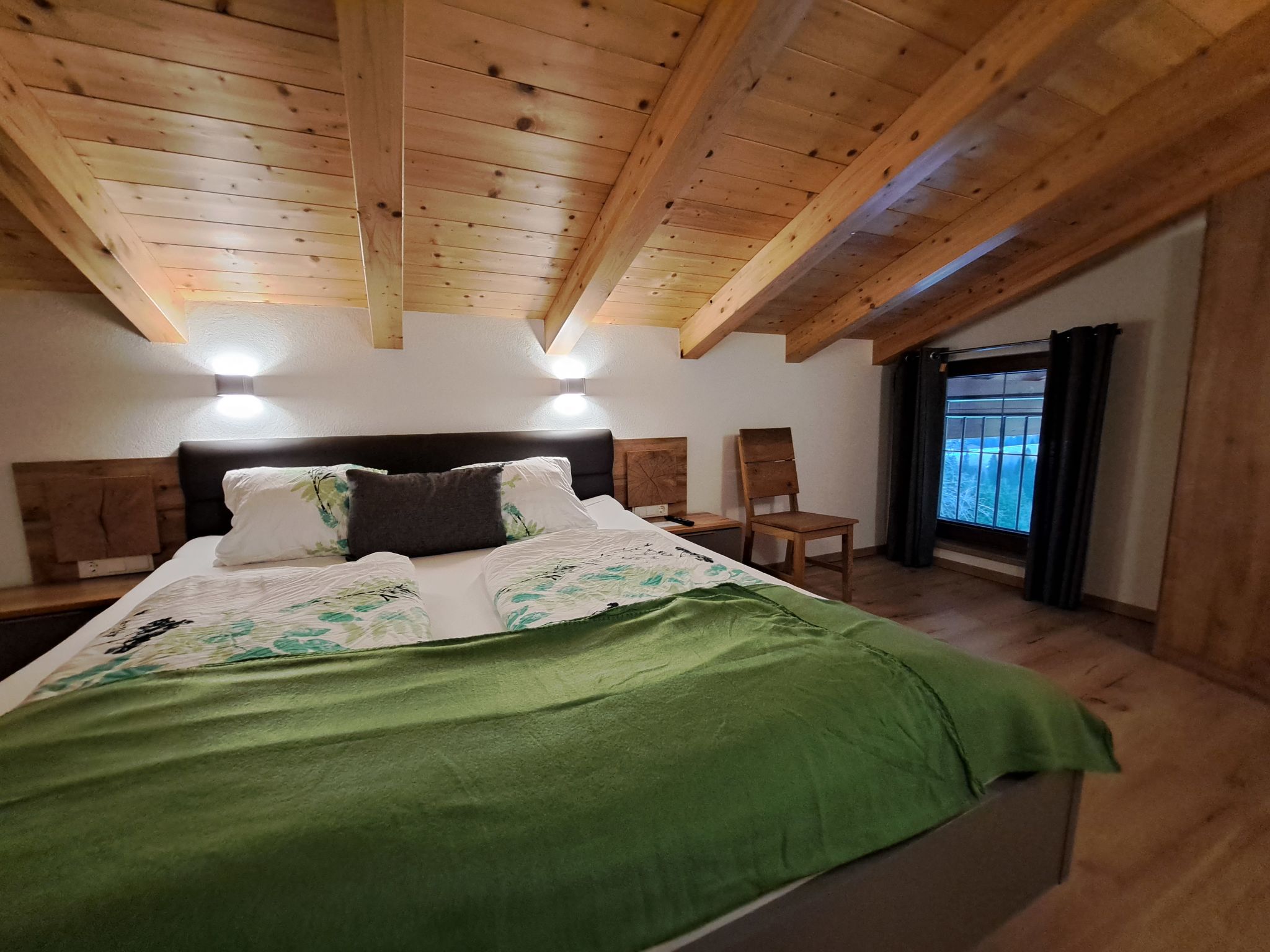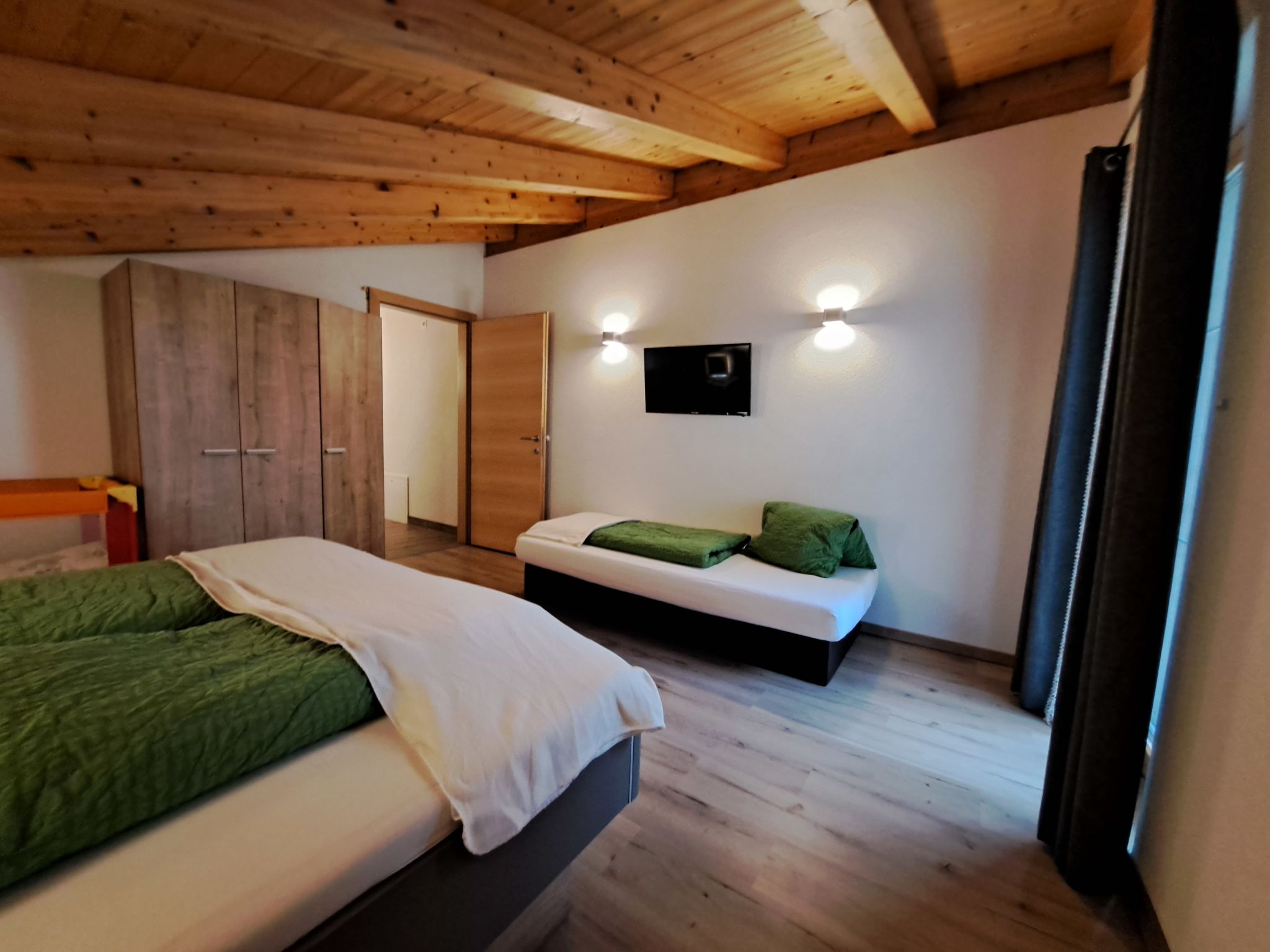 3-Zimmer-Wohnung über 2 Etagen, ca. 71 m². Zugang zur Wohnung über Treppe in die 1. Etage. 1. Etage: Vorraum mit Garderobe und Terrassenausgang. Wohnküche mit Essplatz (Eckbank), Schlafcouch und Küchenzeile (4 Ceranfelder, Backofen, Geschirrspüler, Kühl-/Gefrierkombination, Kaffeepadmaschine, Wasserkocher, Toaster). Sep.WC. Interne Treppe zur 2. Etage (Dachschräge, teils eingeschränkte Stehhöhe): Schlafzimmer mit Doppelbett und Klappbett. Doppelzimmer. Dusche/WC. Haartrockner. Empfohlene Belegung: 5 Erwachsene und 1 Kind. Bei Belegung mit weniger Personen als der maximalen Personenzahl stehen nicht alle Wohneinheiten zur Verfügung.