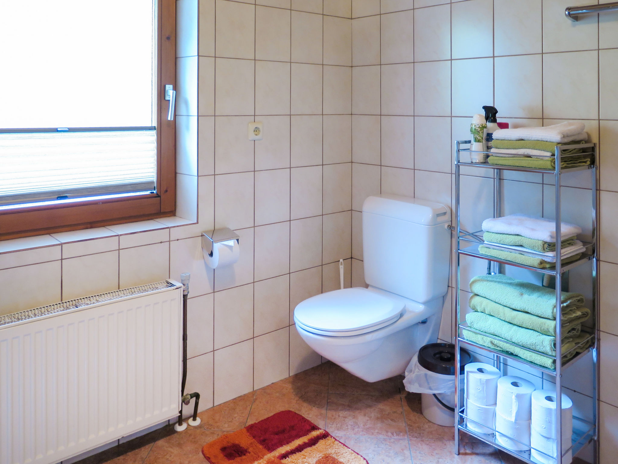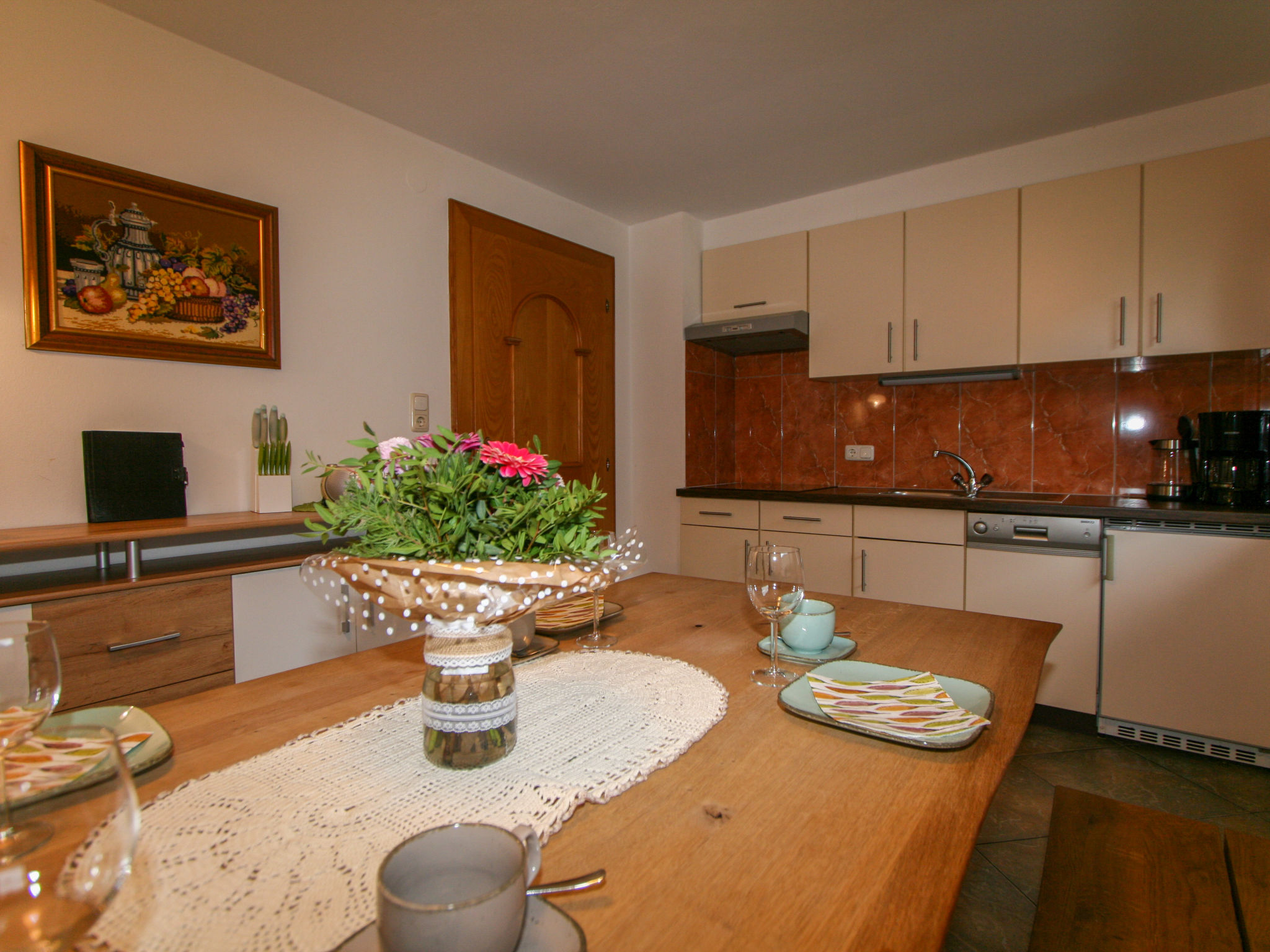 4-Zimmer-Wohnung, 1. Etage, ca. 80 m². Separater Zugang über Außentreppe: Wohnküche mit Essplatz (Eckbank), Küchenzeile (4 Ceranfelder, Mikrowelle, Geschirrspüler, Kühlschrank, Kaffeemaschine, Wasserkocher, Toaster) und Balkonausgang. 2 Doppelzimmer, jeweils mit Waschbecken und Balkonausgang. Schlafzimmer mit Etagenbett. Bad/Dusche/WC.