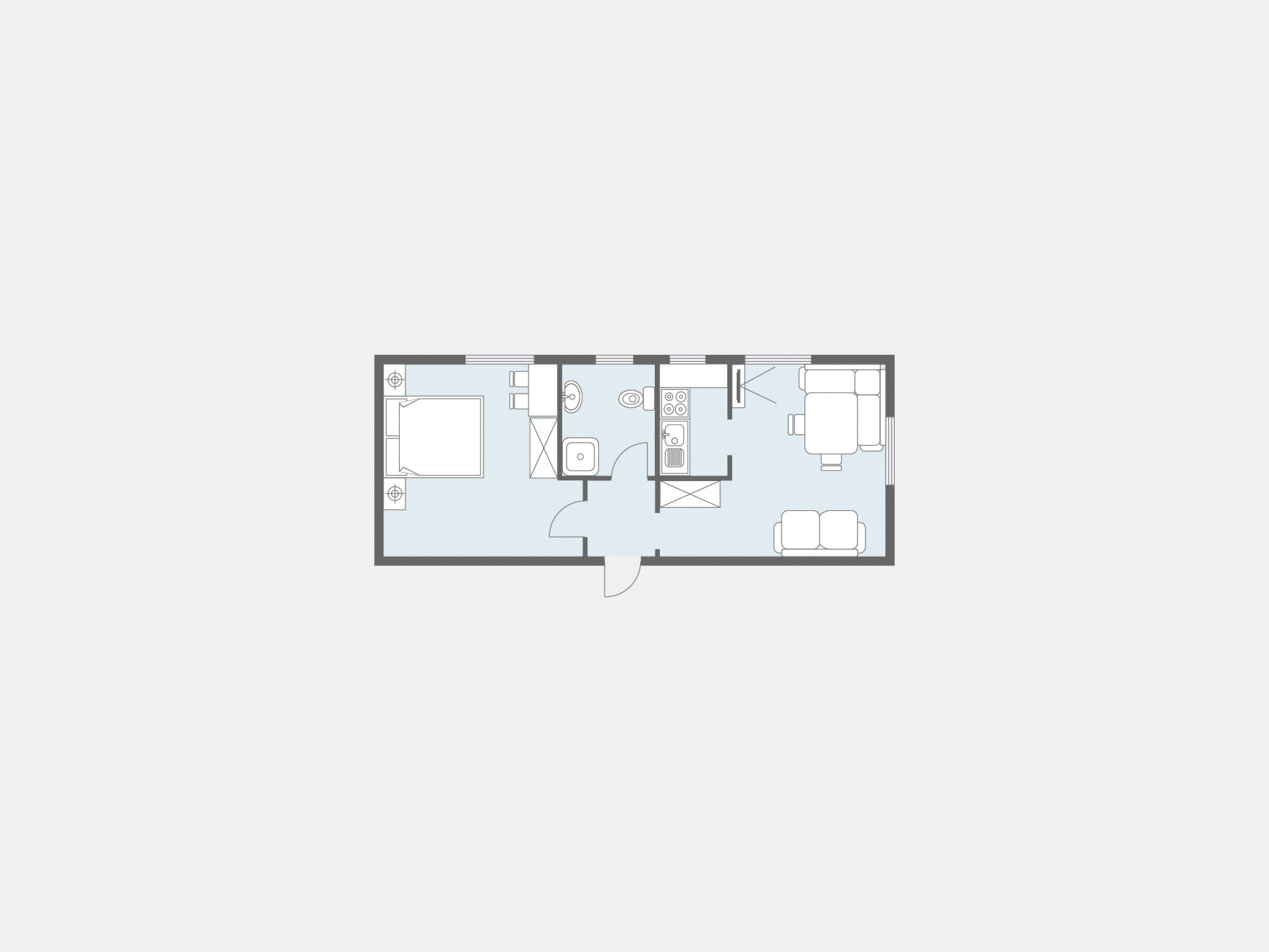 2-Zimmer Wohnung, 1. Etage, ca. 42 m². Wohn-/Schlafraum mit Doppelbettcouch und Essplatz (Eckbank). Zum Wohnraum offene Küche (4 Platten, Backofen, Kühlschrank, Kaffeemaschine, Wasserkocher). Doppelzimmer. Dusche/WC. Bei Belegung mit weniger Personen als der maximalen Personenzahl stehen nicht alle Wohneinheiten zur Verfügung.