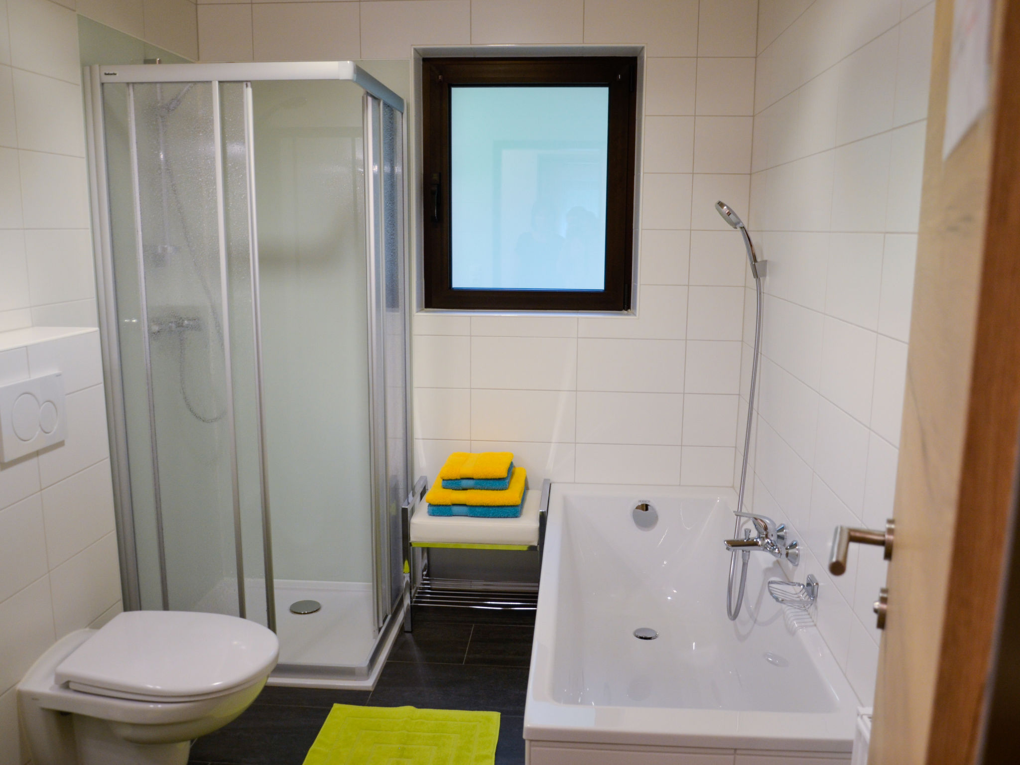 5-Zimmer Wohnung, 2. Etage, ca. 90 m². Wohnküche (4 Ceranfelder, Backofen, Geschirrspüler, Kühlschrank, Kaffeemaschine, Wasserkocher, Toaster) mit Essplatz (Eckbank) und Balkonausgang. 3 Doppelzimmer mit Waschbecken und Balkonausgang. Doppelzimmer. Bad/Dusche/WC. Dusche/WC.