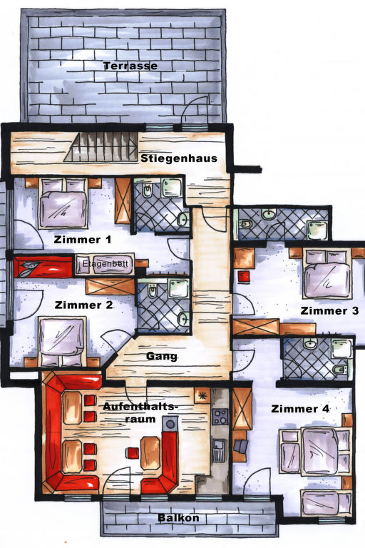 Dieses Angebot setzt sich aus den Wohnungen KPL 170 und KPL 175 (keine interne Verbindung) zusammen.3-Zimmer-Wohnung, Erdgeschoss, ca. 60 m². Abgeschlossene Wohnung: Flur mit Garderobe. Schlafzimmer mit Doppelbett, Bettcouch und Dusche/WC. Doppelzimmer mit Dusche. Dusche/WC. Unmittelbar neben der abgeschlossenen Wohnung: Wohnküche (4 Ceranfelder, Backofen, Mikrowelle, Geschirrspüler, Kühlschrank, Kaffeemaschine, Wasserkocher, Toaster) mit Essplatz (Eckbank) und Bettcouch.5-Zimmer-Wohnung, 3. Etage, ca. 130 m². Flur mit Garderobe. Großer Wohn-/Aufenthaltsraum mit 3 Sitz- und Essecken für ca. 20 Personen, offene Küche (4 Ceranfelder, Backofen, Mikrowelle, Geschirrspüler, Kühlschrank, kleiner Gefrierschrank, Kaffeemaschine, Wasserkocher, Toaster), Balkonausgang. Schlafzimmer mit Doppelbett, Einzelbett und Dusche/WC. Schlafzimmer mit Doppelbett, Einzelbett, Zustellbett, Balkonausgang und Dusche/WC. Schlafzimmer mit Doppelbett, Bettcouch, Dusche/WC und Balkonausgang. Schlafzimmer mit Doppelbett, Etagenbett, Dusche/WC und Balkonausgang.