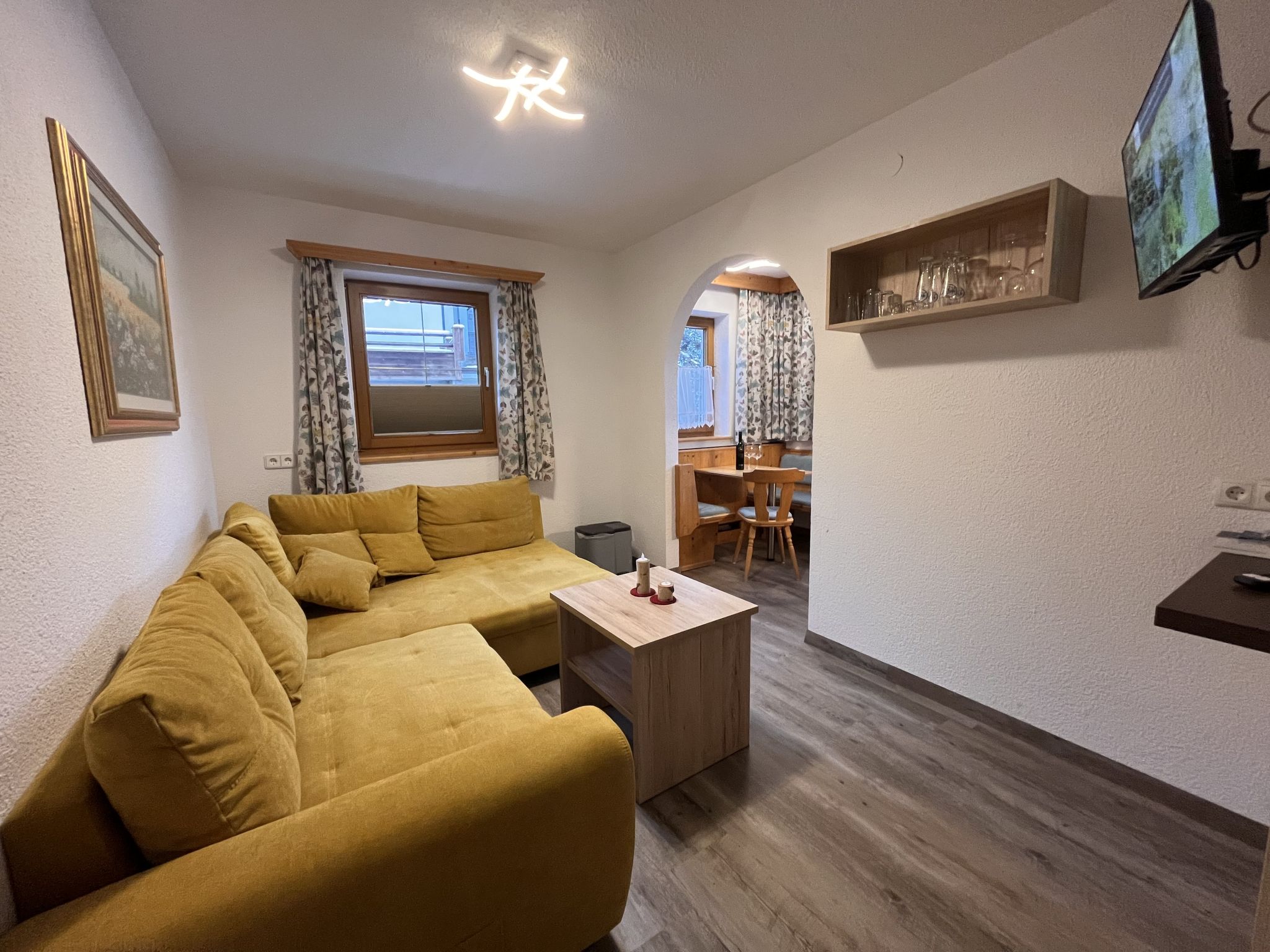 2-Zimmer-Wohnung, Erdgeschoss (Hanglage), ca. 31 m². Separater Zugang. Wohn-/Schlafraum mit Doppelbettcouch, Essplatz, durch Rundbogen abgeteilte Küche (4 Ceranfelder, Mikrowelle, Kühlschrank, Kaffeemaschine) mit Essplatz für 3 Personen. Doppelzimmer mit Dusche/WC. Bei Belegung mit weniger Personen als der maximalen Personenzahl stehen nicht alle Wohneinheiten zur Verfügung.