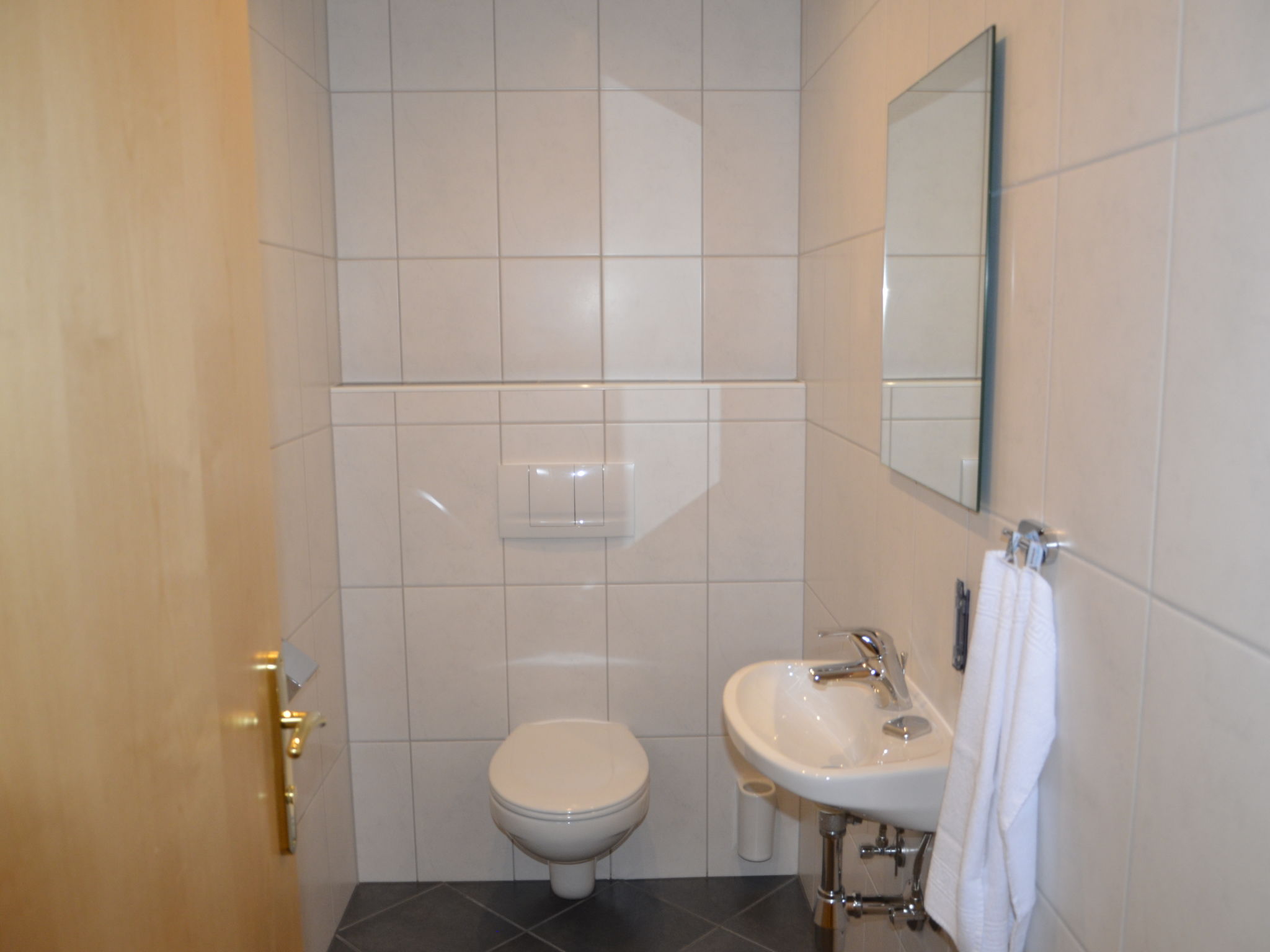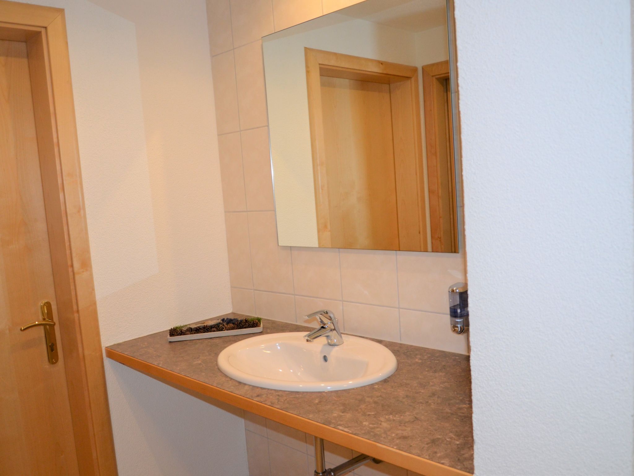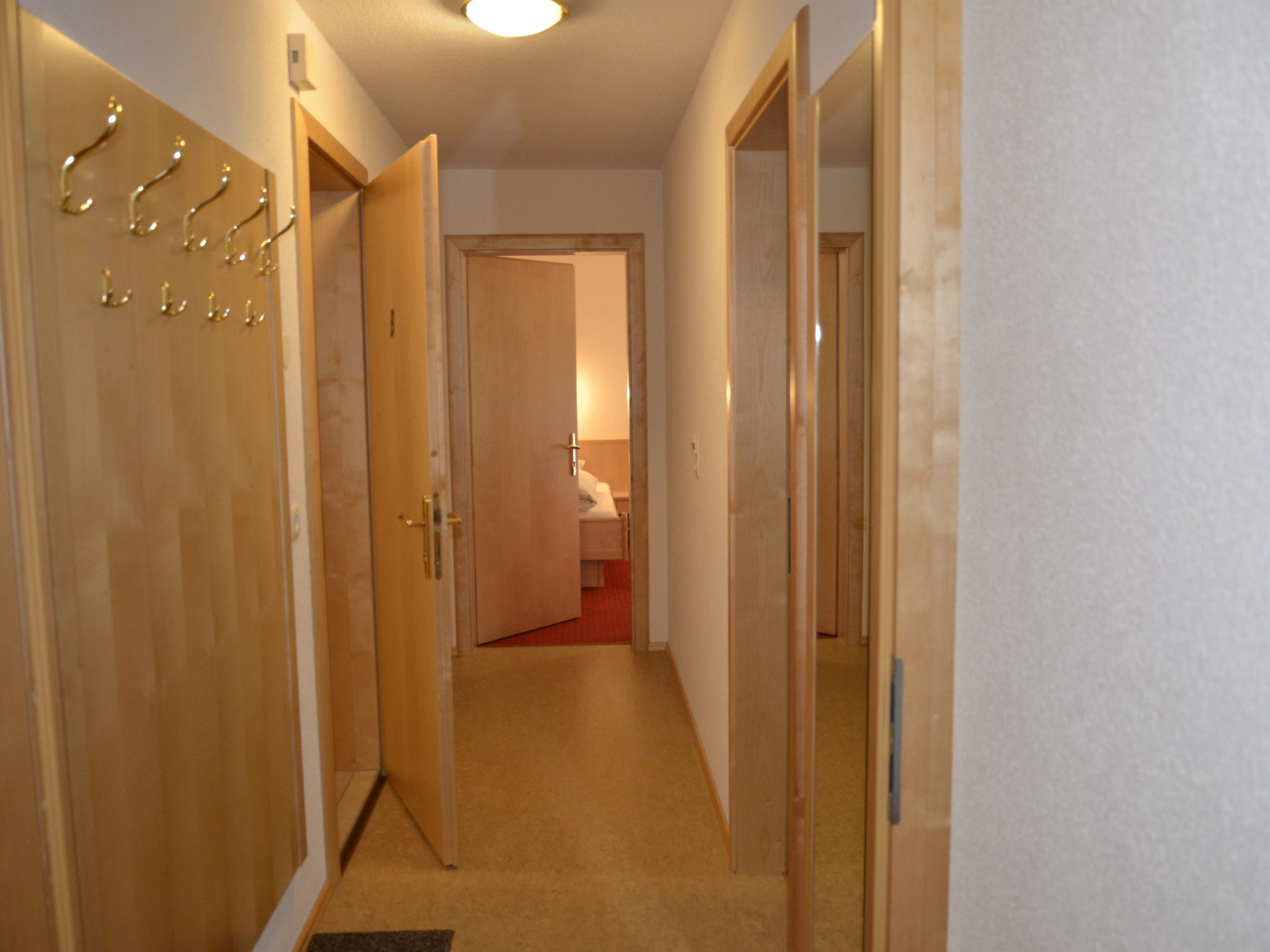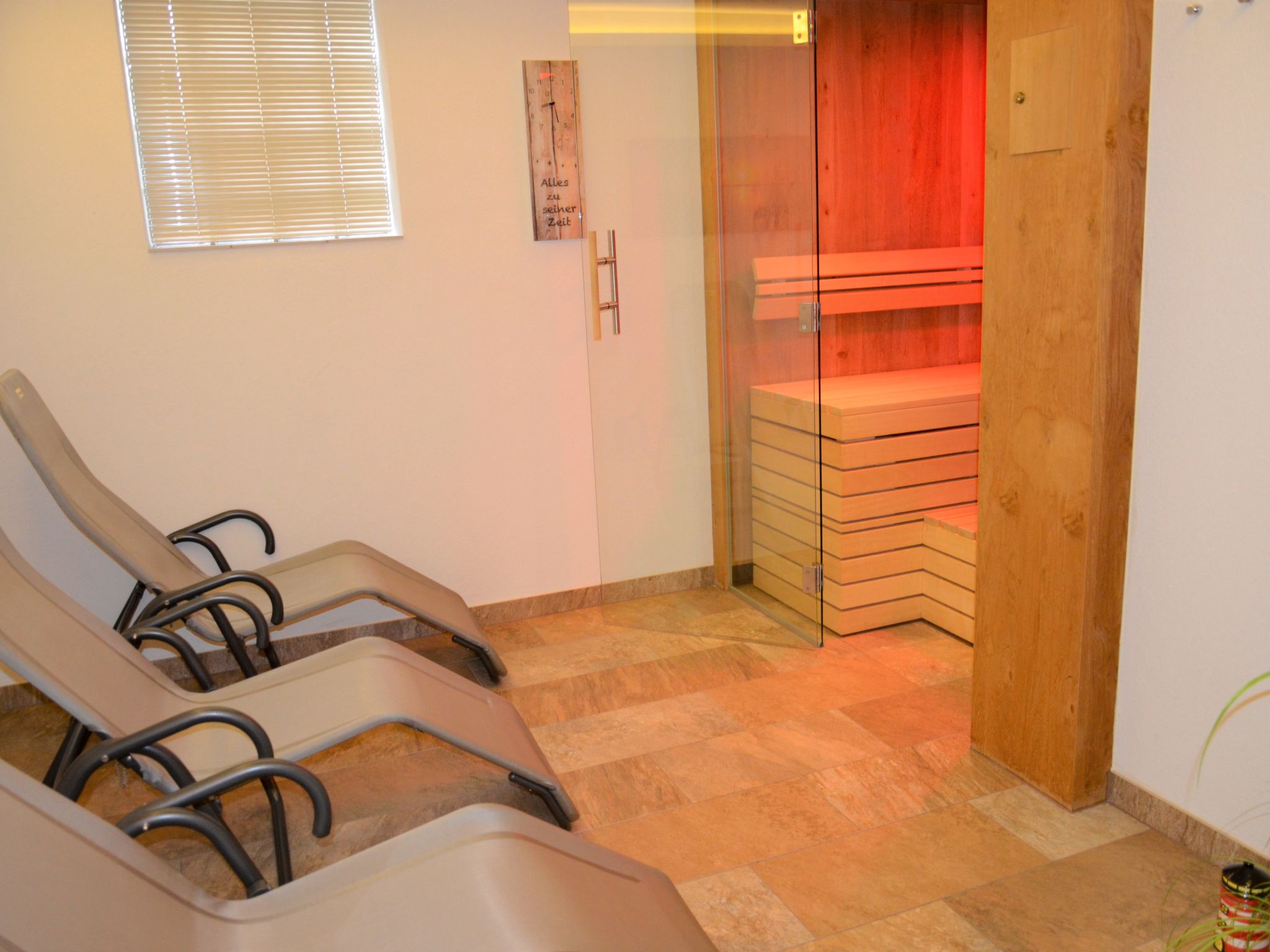 6-Zimmer-Wohnung, 2 Etagen (Hanglage), ca. 130 m². Separater Eingang über Außentreppe ins Untergeschoss (Hanglage): Wohn-/Schlafraum mit Doppelbettcouch, Essplatz für 13 Personen und Küchenzeile (4 Ceranfelder, Backofen, Mikrowelle, Geschirrspüler, Kühlschrank, Kaffeemaschine, Wasserkocher, Toaster), Balkonausgang. 2 Doppelzimmer. Schlafzimmer mit Doppelbett, Einzelbett und Dusche/WC. Dusche/WC. 2. Untergeschoss (Hanglage): Flur. Wohn-/Schlafraum mit Doppelbettcouch, Essplatz für 6 Personen. Durch Schiebetür vom Wohnraum abgeteilte Küche (4 Ceranfelder, Backofen, Mikrowelle, Geschirrspüler, Kühlschrank, Kaffeemaschine, Wasserkocher). Doppelzimmer. Dusche/WC.