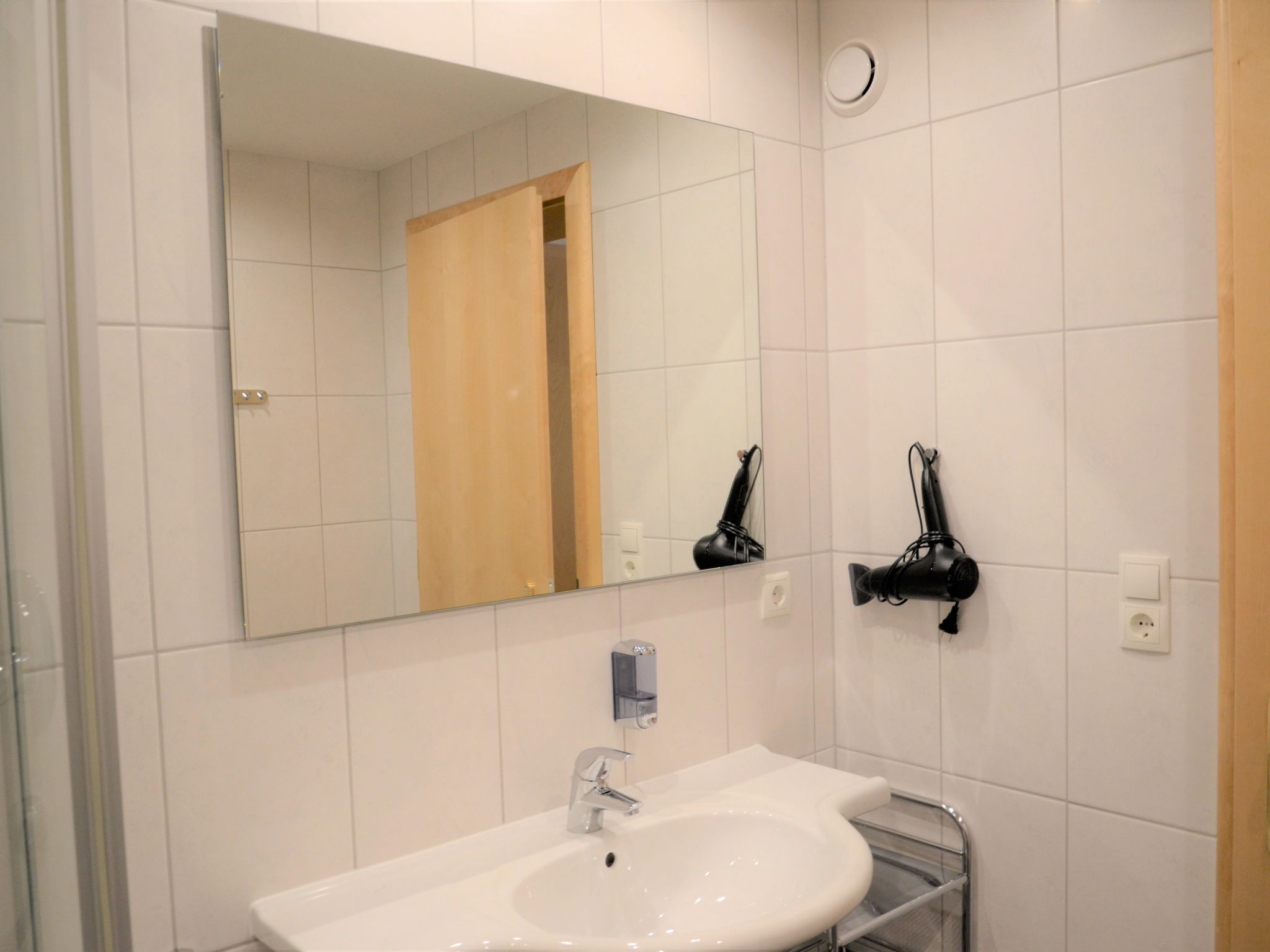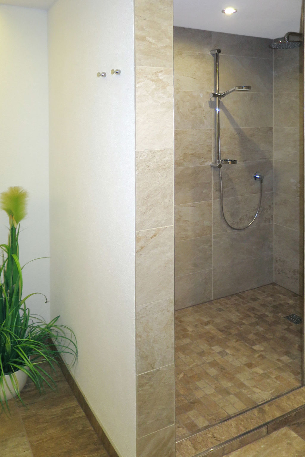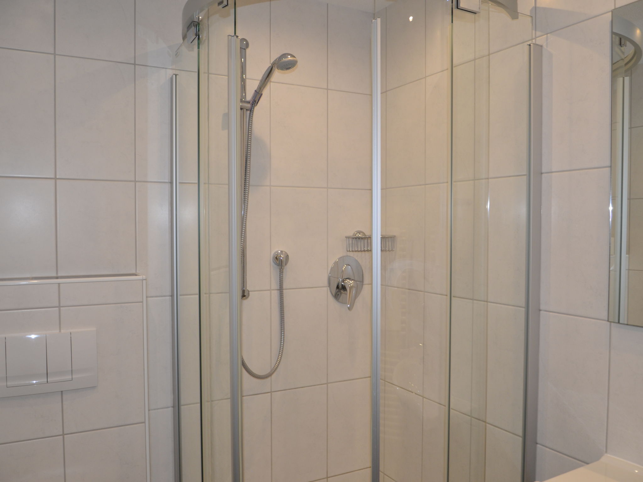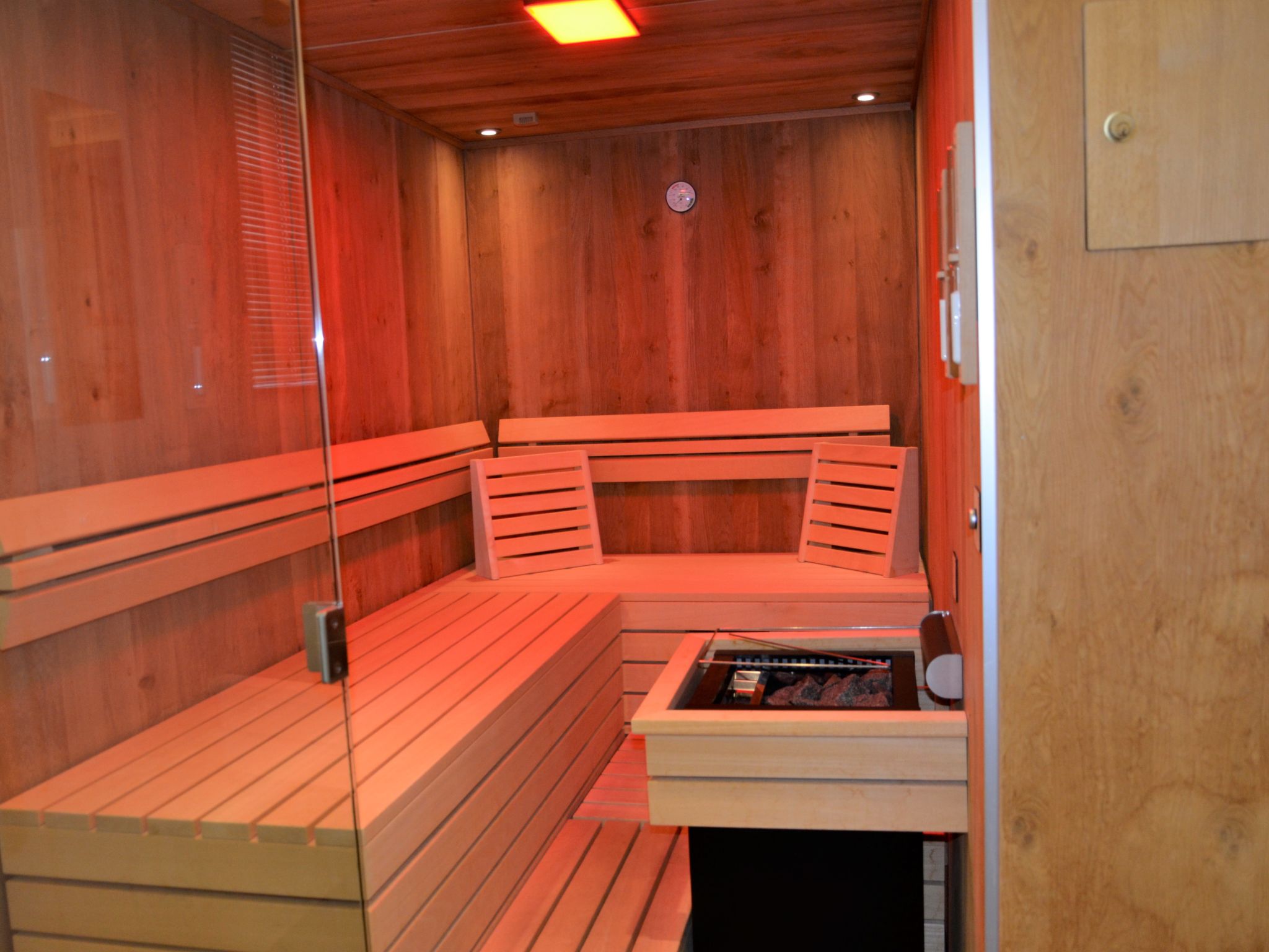 6-Zimmer-Wohnung, 2 Etagen (Hanglage), ca. 130 m². Separater Eingang über Außentreppe ins Untergeschoss (Hanglage): Wohn-/Schlafraum mit Doppelbettcouch, Essplatz für 13 Personen und Küchenzeile (4 Ceranfelder, Backofen, Mikrowelle, Geschirrspüler, Kühlschrank, Kaffeemaschine, Wasserkocher, Toaster), Balkonausgang. 2 Doppelzimmer. Schlafzimmer mit Doppelbett, Einzelbett und Dusche/WC. Dusche/WC. 2. Untergeschoss (Hanglage): Flur. Wohn-/Schlafraum mit Doppelbettcouch, Essplatz für 6 Personen. Durch Schiebetür vom Wohnraum abgeteilte Küche (4 Ceranfelder, Backofen, Mikrowelle, Geschirrspüler, Kühlschrank, Kaffeemaschine, Wasserkocher). Doppelzimmer. Dusche/WC.