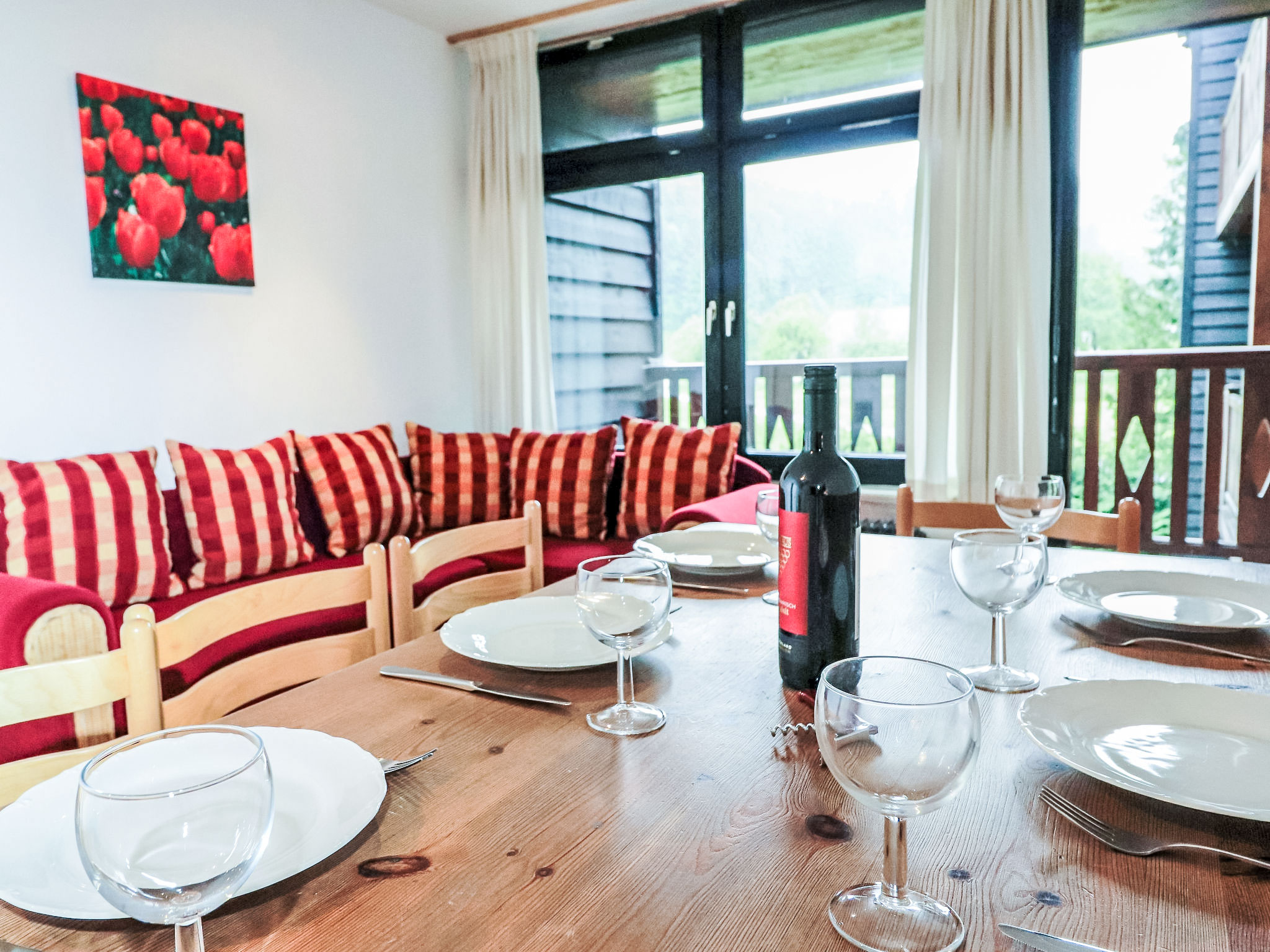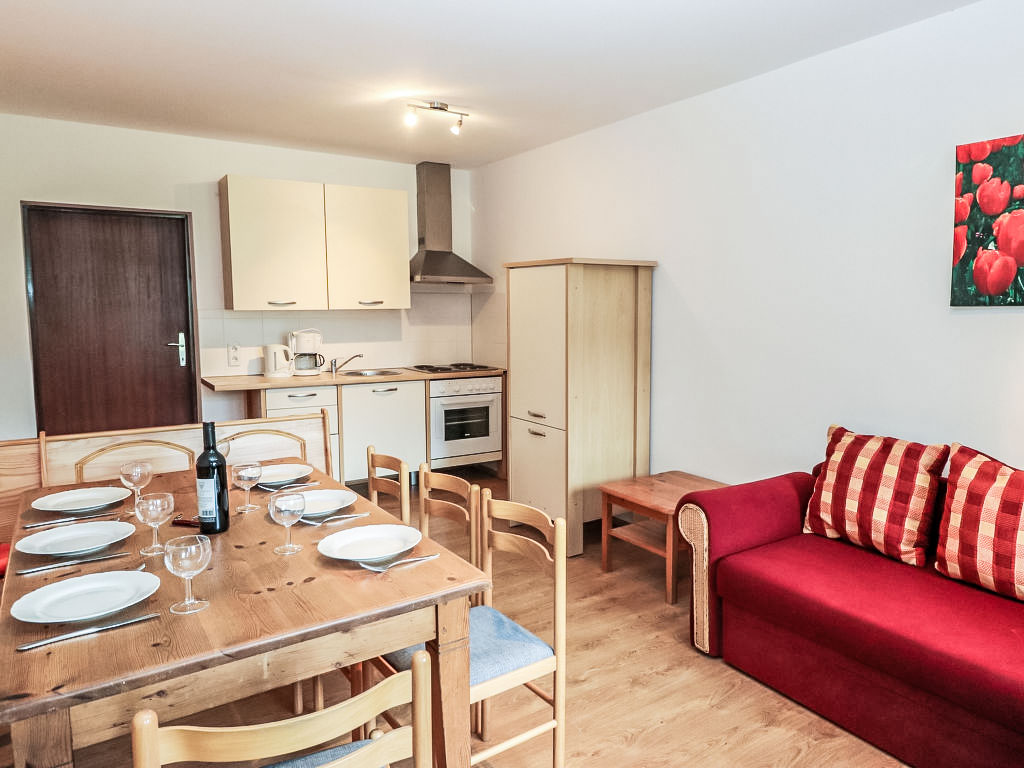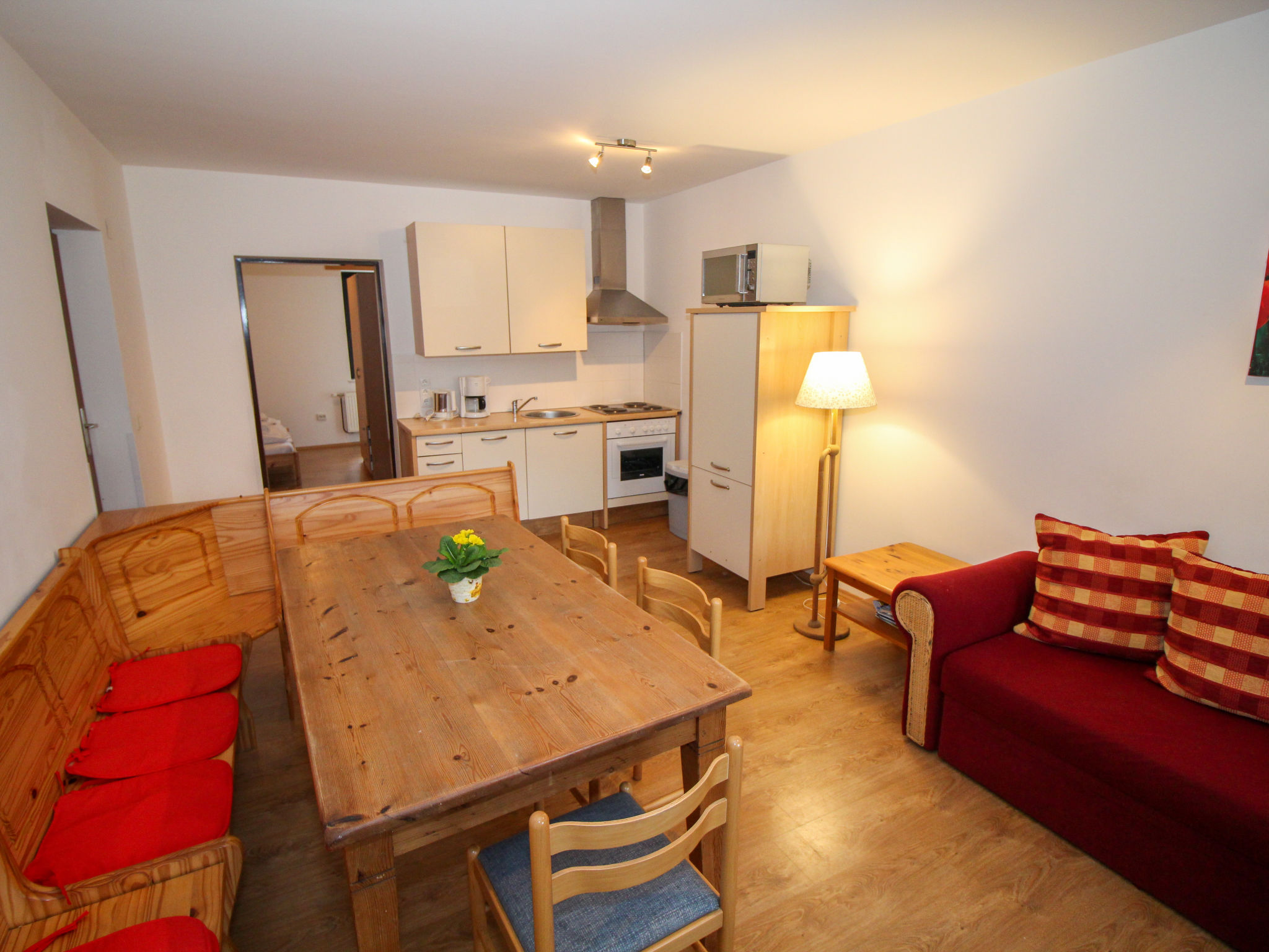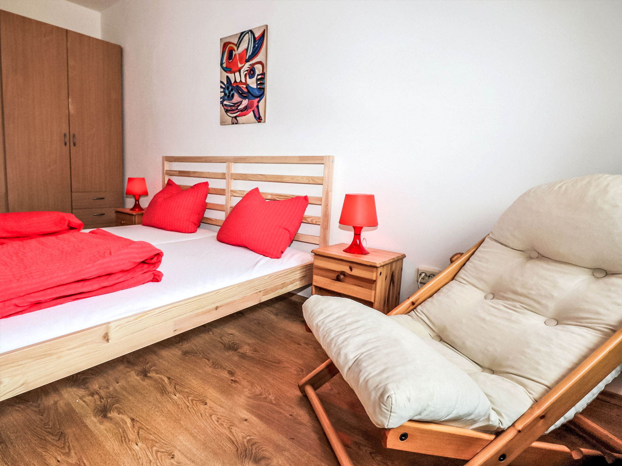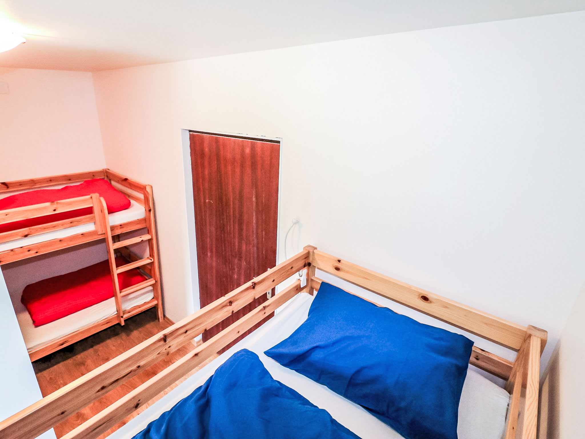 "Taubenschlag", 4-Zimmer-Wohnung 74 m2 im 1. Stock. Objekt geeignet für 4 Erwachsene + 4 Kinder. Hell, zweckmässig und gemütlich eingerichtet: grosses Wohn-/Esszimmer mit Essecke, Küchenblock und Sat-TV. 1 Zimmer mit 1 Doppelbett (160 cm, Länge 200 cm), Dusche/WC. 1 grosses Zimmer mit 1 Doppelbett (160 cm, Länge 200 cm). 1 kleines Kinderzimmer mit 2 x 2 Etagenbetten (Länge 180 cm). Offene Küche (4 Kochplatten, Backofen, Geschirrspüler, Mikrowelle, elektrische Kaffeemaschine). Dusche/WC. Grosser Balkon. Balkonmöbel. Sicht auf die Berge und die Ortschaft. Zur Verfügung: Internet (Wireless LAN, gratis). Bitte beachten: geeignet für Familien. Nichtraucher-Unterkunft. Rauchmelder, Feuerlöscher.