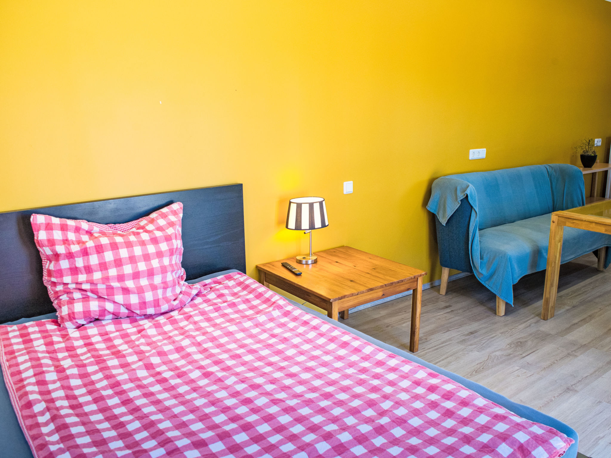 1-Zimmer-Wohnung 25 m2, im Erdgeschoss. Gemütlich eingerichtet: grosses Wohn-/Schlafzimmer mit 1 franz. Bett (140 cm, Länge 200 cm), Esstisch und Sat-TV (Flachbildschirm). Ausgang zur Terrasse. Offene Küche (Backofen, 4 Glaskeramikplatten, Toaster, Wasserkocher, elektrische Kaffeemaschine). Dusche/WC. G-Heizung. Kleine Terrasse. Zur Verfügung: Internet (Wireless LAN, gratis). Maximal 1 Haustier/Hund erlaubt.