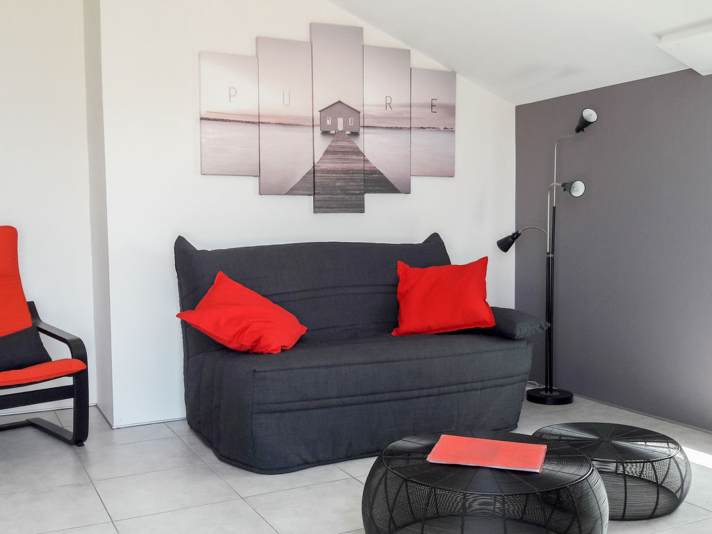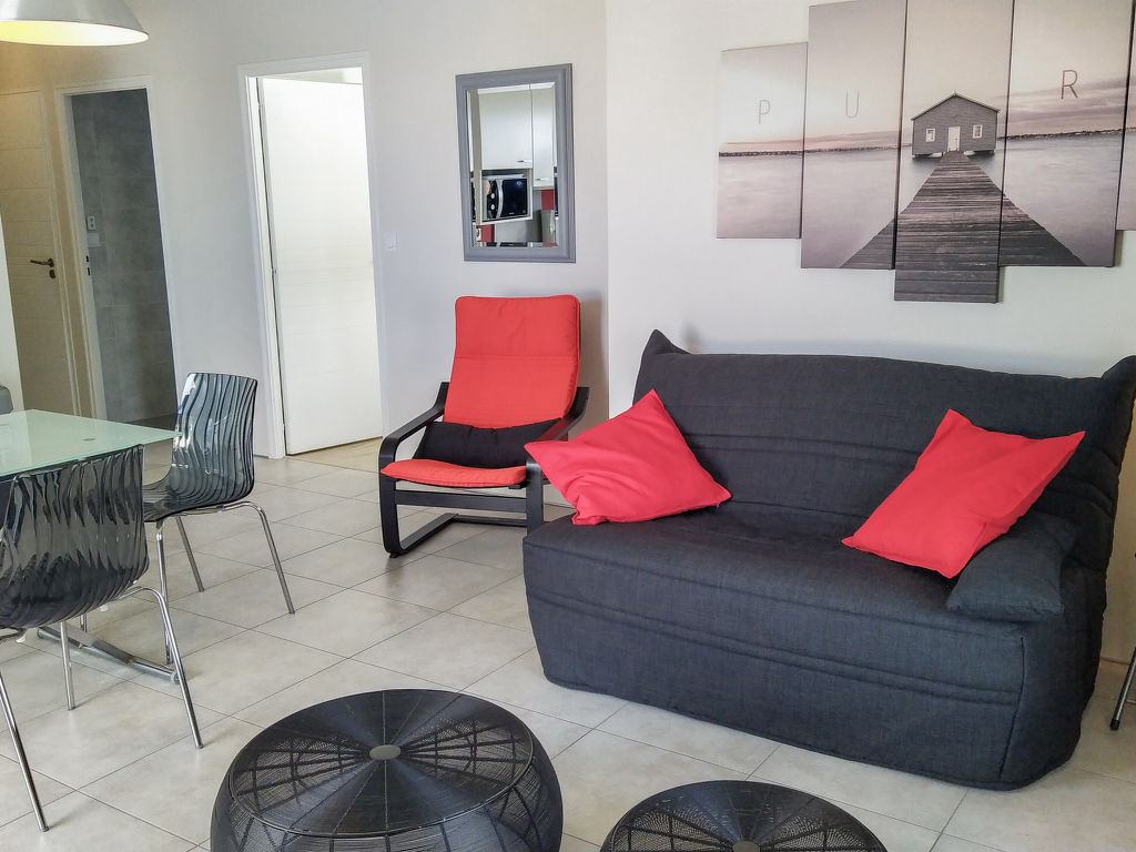 3-Zimmer-Wohnung, Obergeschoss, ca. 50 m². Separater Zugang über Außentreppe: Wohn-/Schlafraum mit Doppelbettcouch, Essplatz, Küchenzeile (2 Induktionsfelder, Mikrowelle, Geschirrspüler, Kühlschrank, Kaffeemaschine, Wasserkocher, Toaster), Terrassenausgang. Schlafzimmer mit franz. Bett. Zweibettzimmer (Betten 0,80 m breit). Dusche. Sep.WC. Flexibilität bei der Bettenaufteilung: Es stehen mehr Schlafmöglichkeiten zur Verfügung als die maximal zugelassene Personenzahl, diese darf dennoch nicht überschritten werden. Inserat einer Privatperson nach Artikel 155, IV, CGI.