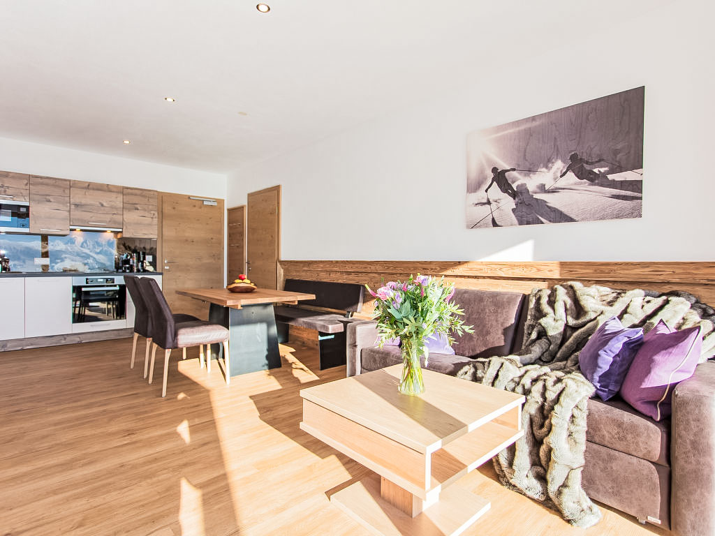 "Kitzsteinhorn", 2-Zimmer-Wohnung 48 m2, im ebenerdigen Untergeschoss. Objekt geeignet für 4 Erwachsene. Hell, modern und gemütlich eingerichtet: 1 Doppelzimmer mit Sat-TV (Flachbildschirm). Ausgang zum Balkon. Grosses Wohn-/Schlafzimmer mit 1 Doppeldiwanbett, Esstisch und Sat-TV (Flachbildschirm). Ausgang zum Balkon. Offene Küche (Backofen, Geschirrspüler, 2 Glaskeramikherd Platten, Mikrowelle, Tiefkühler, elektrische Kaffeemaschine). Dusche/WC. Grosser Balkon 19 m2. Balkonmöbel. Sehr schöne Panoramasicht auf die Berge und die Landschaft. Zur Verfügung: Haartrockner. Internet (Wireless LAN, gratis). Parkplatz (überdacht, 1 Auto). Bitte beachten: geeignet für Familien. Nichtraucher-Unterkunft. 1 Haustier/Hund erlaubt. 50628-001444-2020