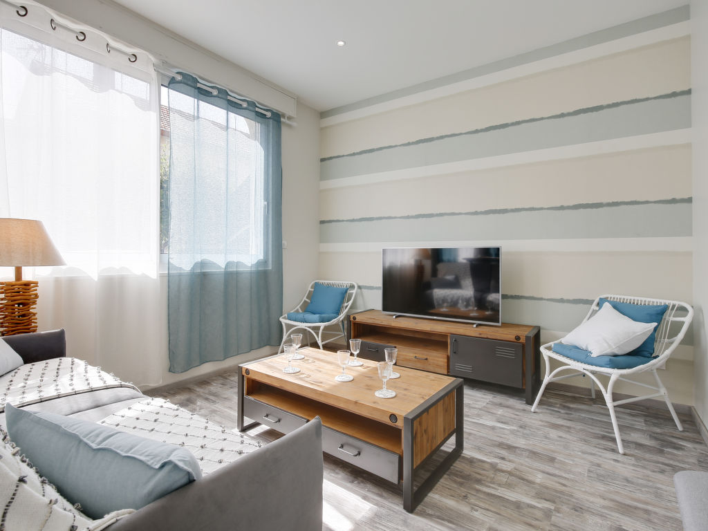 3-Zimmer-Wohnung 90 m2 auf 2 Stockwerken, im Erdgeschoss. Komfortabel und schön eingerichtet: Wohn-/Esszimmer mit 1 Doppeldiwanbett (1 x 160 cm, Länge 190 cm), TV (Flachbildschirm), Klimaanlage. Offene Küche (Backofen, Geschirrspüler, 3 Induktionskochplatten, Toaster, Wasserkocher, Mikrowelle, Tiefkühler, elektrische Kaffeemaschine) mit Bar. Dusche/WC. Unteres Geschoss: (steile Treppe) 1 Zimmer mit 1 franz. Bett (1 x 160 cm, Länge 190 cm), TV (Flachbildschirm). 1 Zimmer mit 1 x 1 Etagenbetten (90 cm, Länge 190 cm), 1 Doppelbett (1 x 140 cm, Länge 190 cm). Dusche, sep. WC, Doppelwaschbecken. E-Heizung. Zur Verfügung: Waschmaschine, Wäschetrockner, Bügeleisen, Haartrockner. Internet (Wireless LAN, gratis). Bitte beachten: Wohnung auf Strassenseite. Nichtraucher-Unterkunft. 1 Haustier/Hund erlaubt. Rauchmelder. Bitte beachten Sie, dass die Zimmer aus Souplex mit Fenstern bestehen. Es gibt 2 Eingänge für den Zugang zur Wohnung. Inserat einer Privatperson nach Artikel 155, IV, CGI.