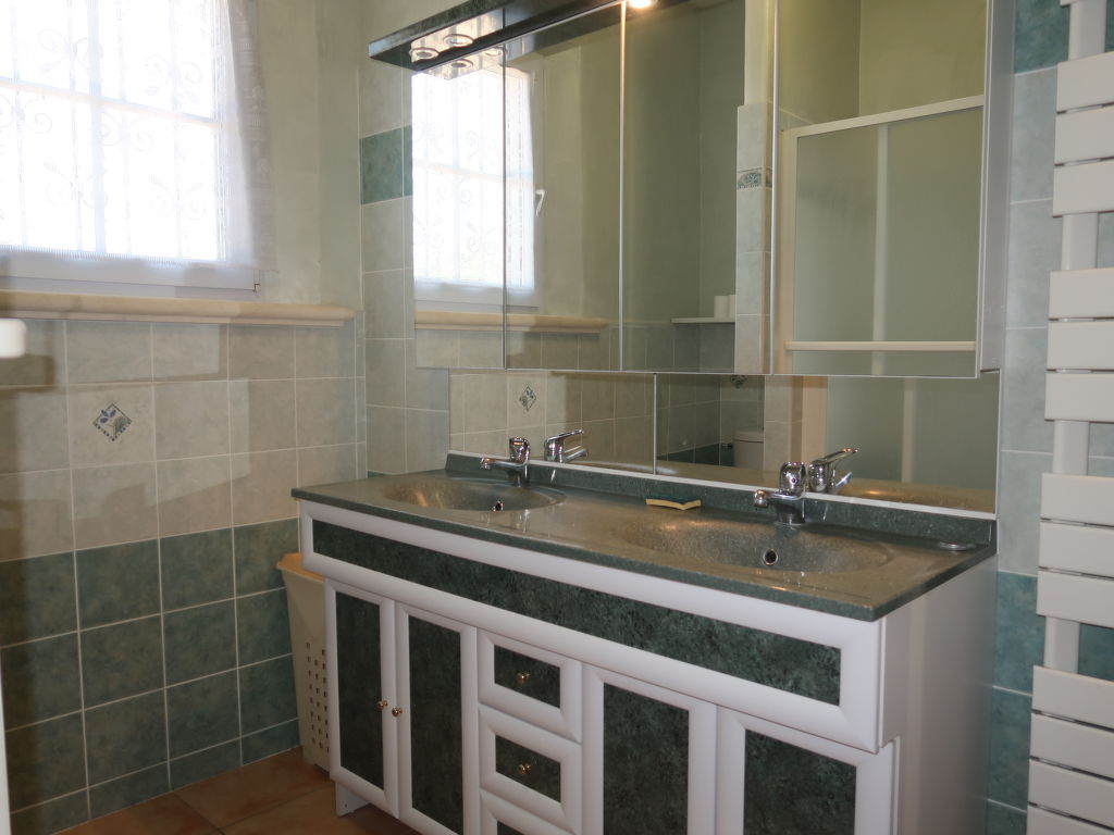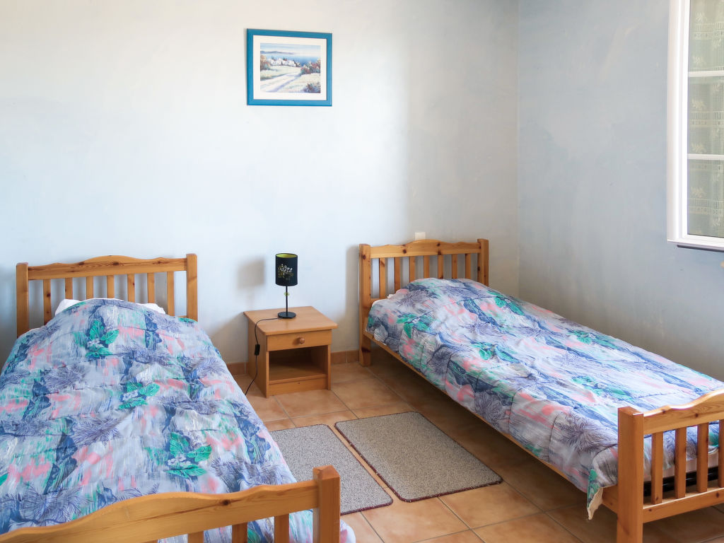 5-Zimmer-Haus, 2 Etagen, ca. 135 m². Erdgeschoss: Wohnraum mit Sitzgruppe, Kamin (nur Dekoration), Essplatz, Terrassenausgang. Küche (3 Flammen, 1 Platte, Backofen, Mikrowelle, Geschirrspüler, Kühlschrank, Gefrierschrank, Kaffeemaschine, Wasserkocher, Toaster). Sep.WC. Zugang zur Garage und von hier zu großer, heller Dusche. Obergeschoss: 2 Zweibettzimmer. 2 Schlafzimmer, jeweils mit franz. Bett. Bad/WC.Hinweis: Bei Buchung zum Preis für 6 Personen steht ein Schlafzimmer nicht zur Verfügung. Inserat einer Privatperson nach Artikel 155, IV, CGI.