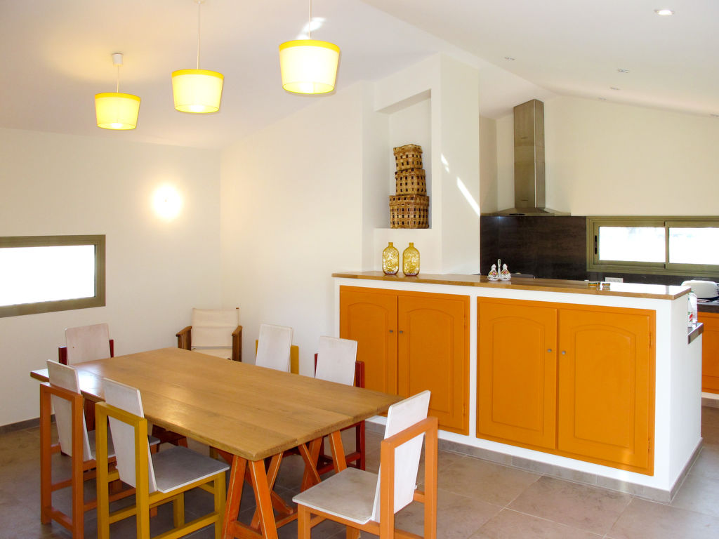 4-Zimmer-Haus, ca. 170 m². Wohnraum mit Sitzgruppe, Kamin (Einsatz), Terrassenausgang. Zum Wohnraum offener Essbereich. Zum Essbereich offene, durch Theke abgeteilte Küche (4 Induktionsfelder, Backofen, Mikrowelle, Geschirrspüler, Kühl-/Gefrierkombination, Kaffeemaschine, Wasserkocher, Toaster). Zweibettzimmer mit Terrassenausgang. Schlafzimmer mit franz. Bett (1,60 m breit) und Bad/Doppelwaschbecken/WC, Terrassenausgang. Schlafzimmer mit franz. Bett (1,60 m breit) und Terrassenausgang. Dusche/Doppelwaschbecken. Sep.WC. Bei Belegung mit weniger Personen als der maximalen Personenzahl stehen nicht alle Schlafzimmer zur Verfügung. Inserat einer Privatperson nach Artikel 155, IV, CGI.