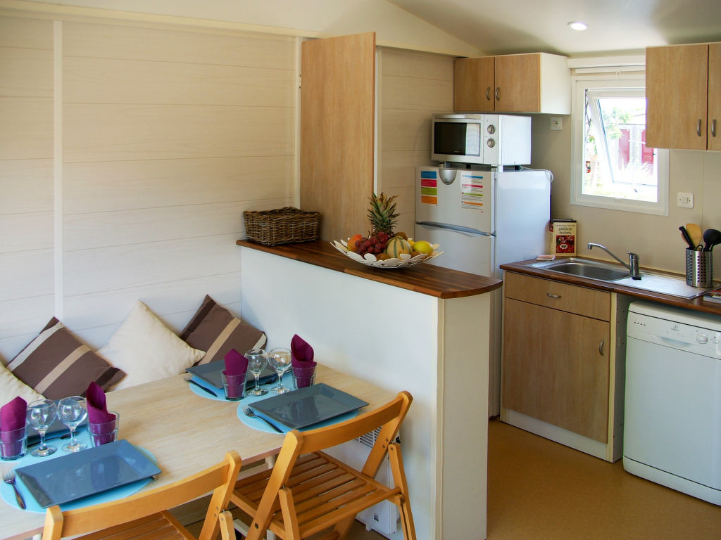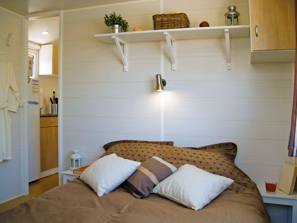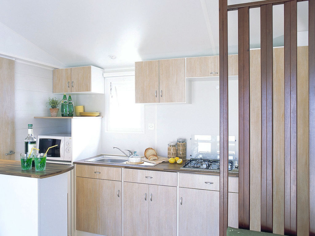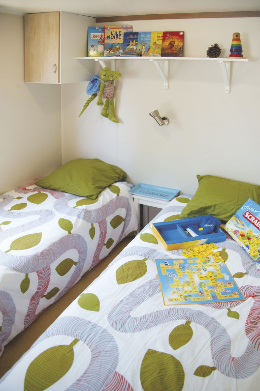 3-Zimmer-Mobilhome, ca. 30 m². Wohnraum mit Sitzcouch, Essplatz, Kochnische. Schlafzimmer mit franz. Bett, Dusche/WC. Zweibettzimmer, Dusche. Sep.WC.