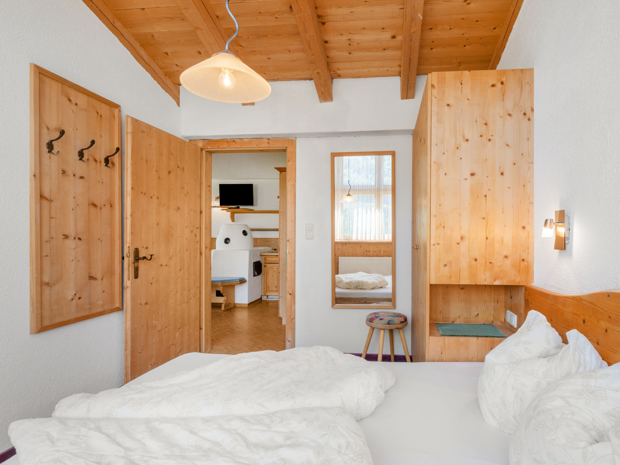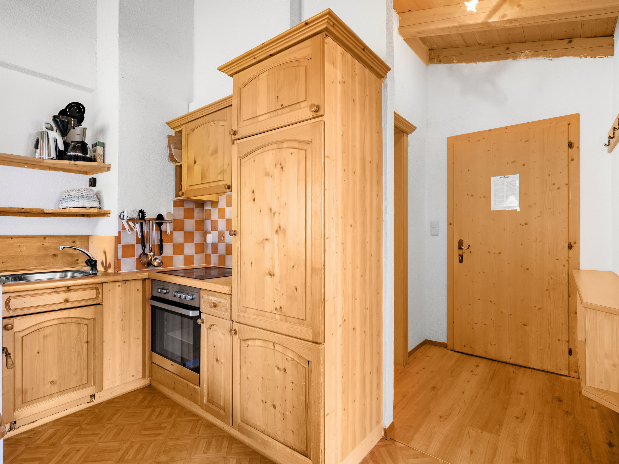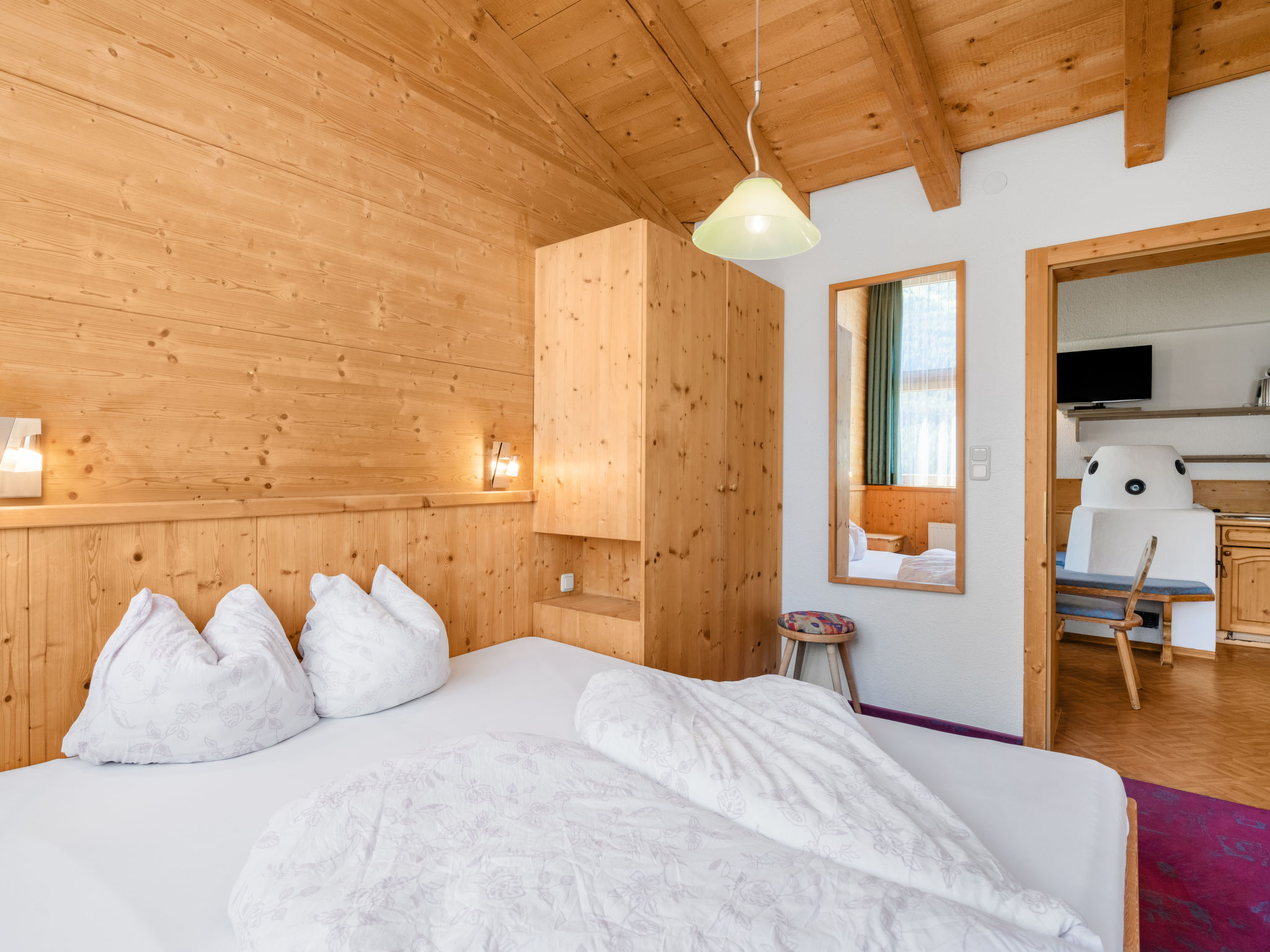 3-Zimmer-Wohnung, Dachgeschoss, ca. 45 m². Wohnküche (4 Ceranfelder, Backofen, Geschirrspüler, Kühlschrank, Kaffeemaschine) mit Essplatz und Kachelofen. 2 Doppelzimmer. Dusche/WC.