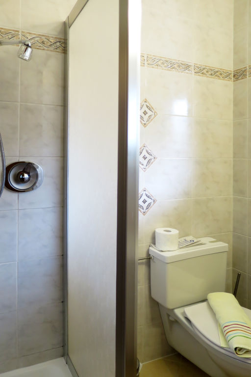 6-Zimmer-Wohnung, 2 Etagen, ca. 190 m². Über 6 Stufen ins Hochparterre, von hier über 10 Stufen ins Untergeschoss: Flur. Doppelzimmer mit Waschbecken und Dusche. Sep.WC. Küche (4 Platten, Backofen, Mikrowelle, Geschirrspüler, Kühlschrank, Kaffeemaschine, Wasserkocher, Toaster) mit Essplaz für 5 Personen. Großer Wohnraum mit mehreren Tischen und Eckbänken für 20 Personen. Über Treppenhaus zur 1. Etage: Flur. Von hier zu 4 Doppelzimmern, jeweils mit Dusche/WC und Balkonausgang. Dusche. Sep.WC.