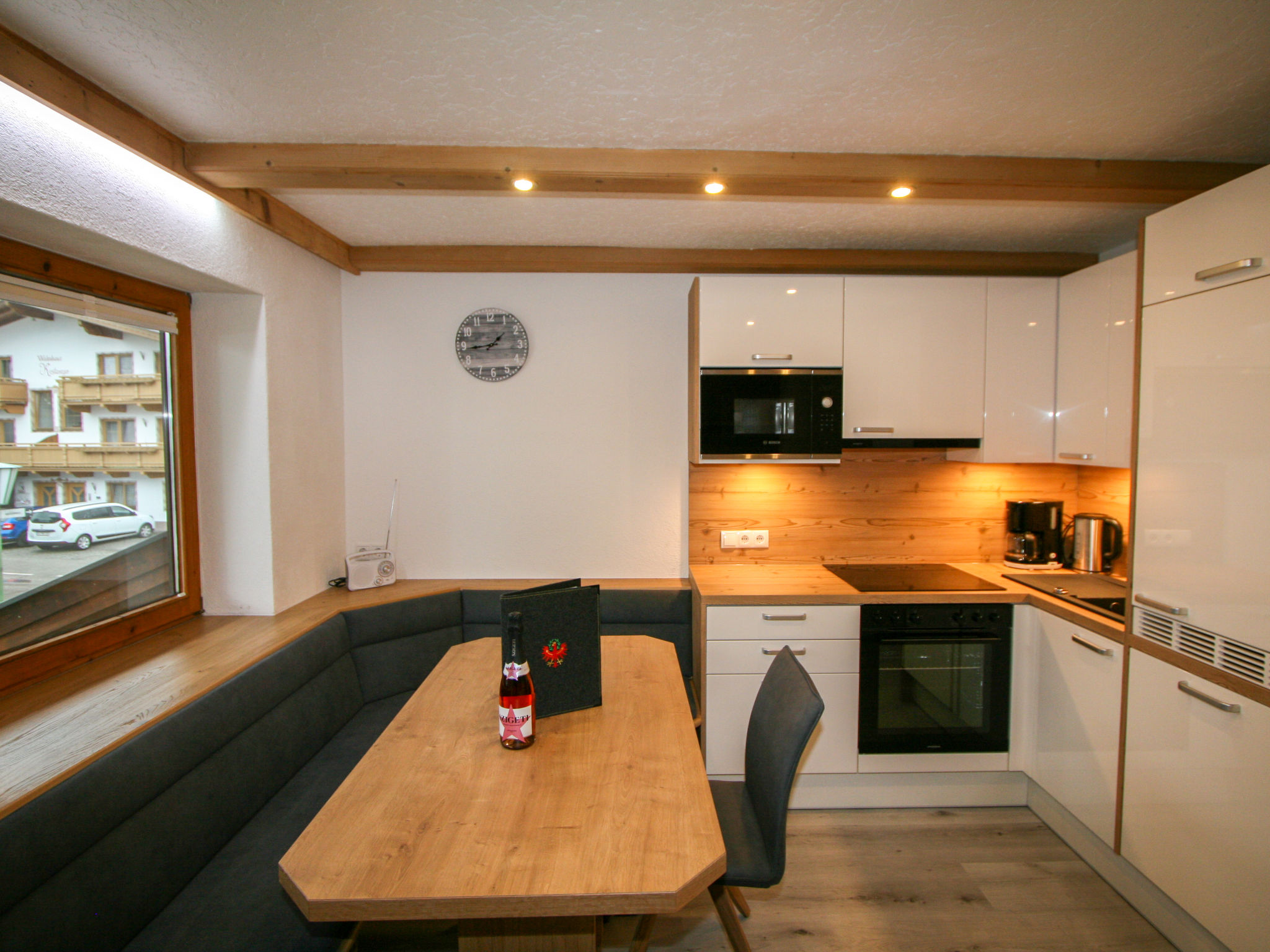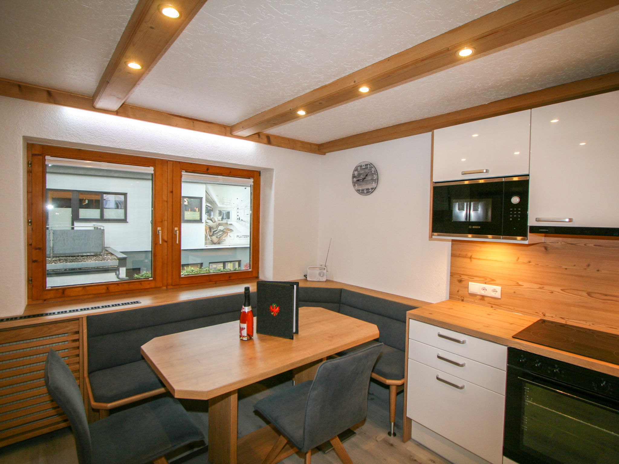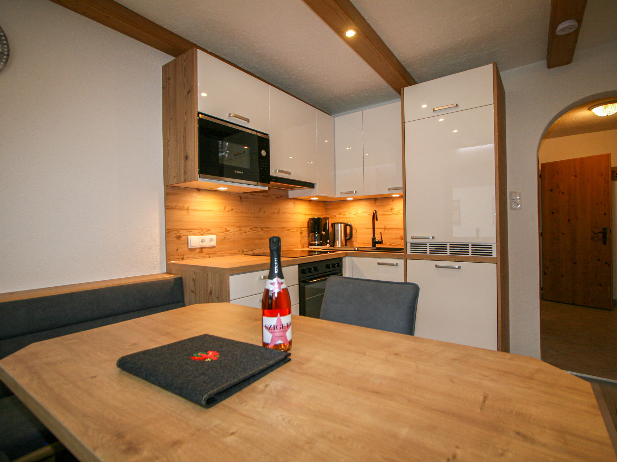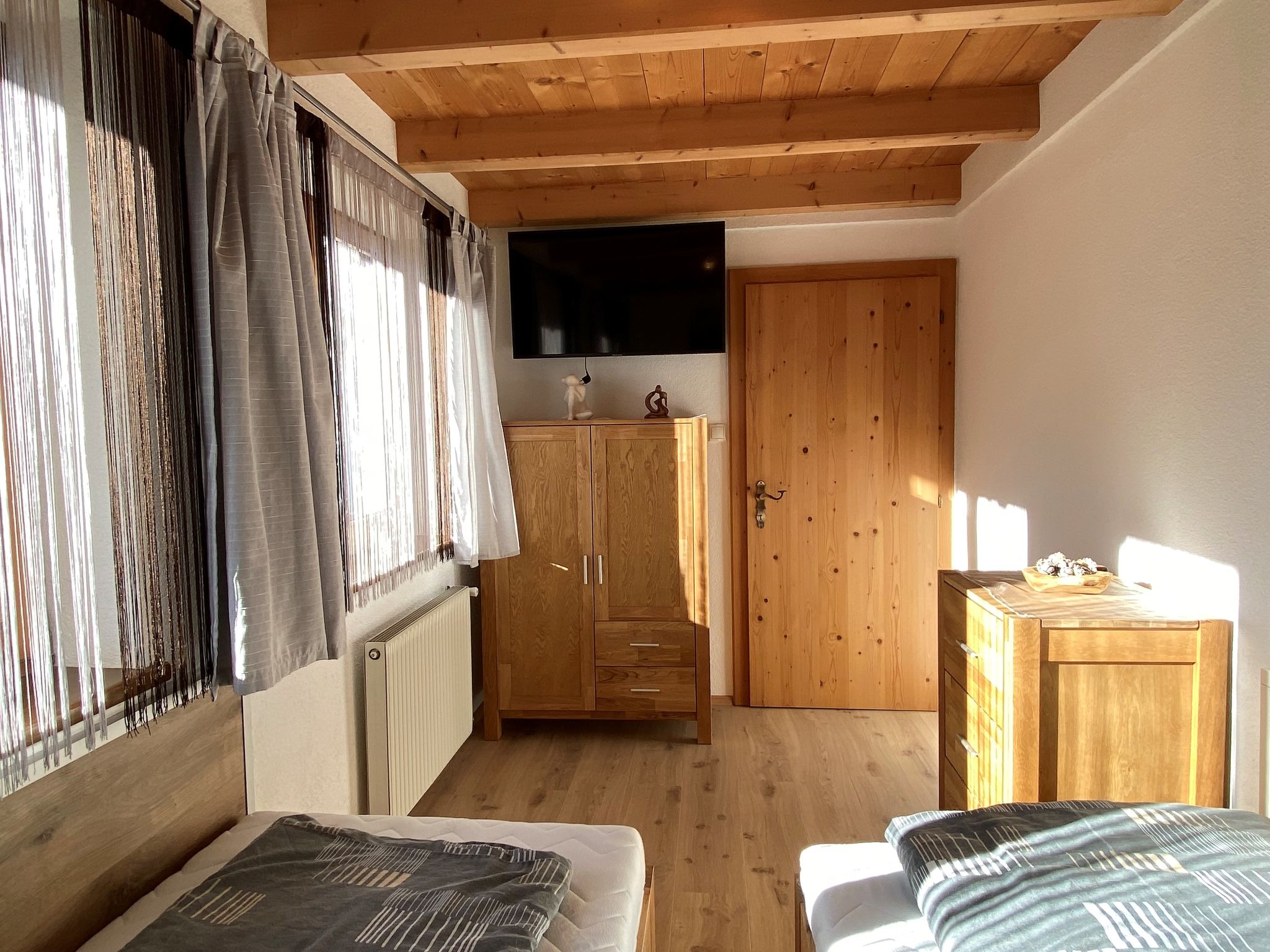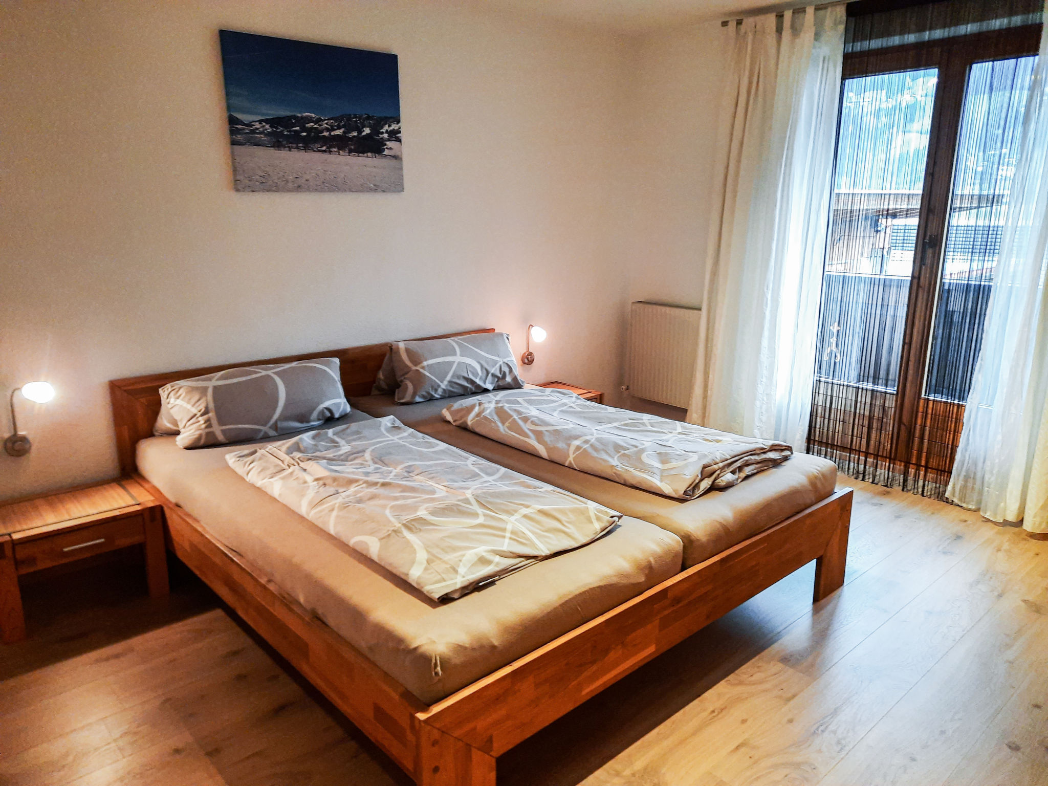 3-Zimmer-Wohnung 55 m2, im Obergeschoss. Renoviert im Jahre 2021, schön und modern eingerichtet: 1 Zimmer mit 2 Betten, Sat-TV und Flachbildschirm. 1 Doppelzimmer mit Sat-TV und Flachbildschirm. Ausgang zum Balkon. Wohnküche (Backofen, 4 Glaskeramikherd Platten, Toaster, Wasserkocher, Mikrowelle, elektrische Kaffeemaschine) mit Essecke. Dusche/WC. Holzheizung, Solarheizung. Balkon 8 m2. Sicht auf die Berge. Bitte beachten: Kühlschrank ohne Gefrierfach, Nichtraucher-Unterkunft.