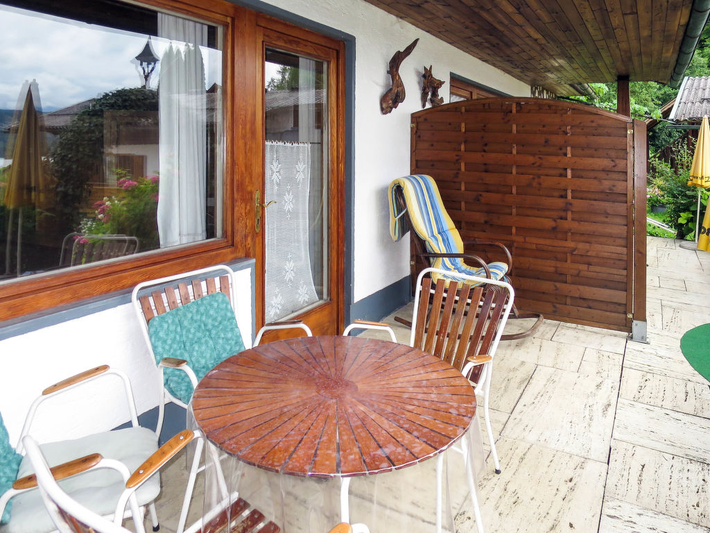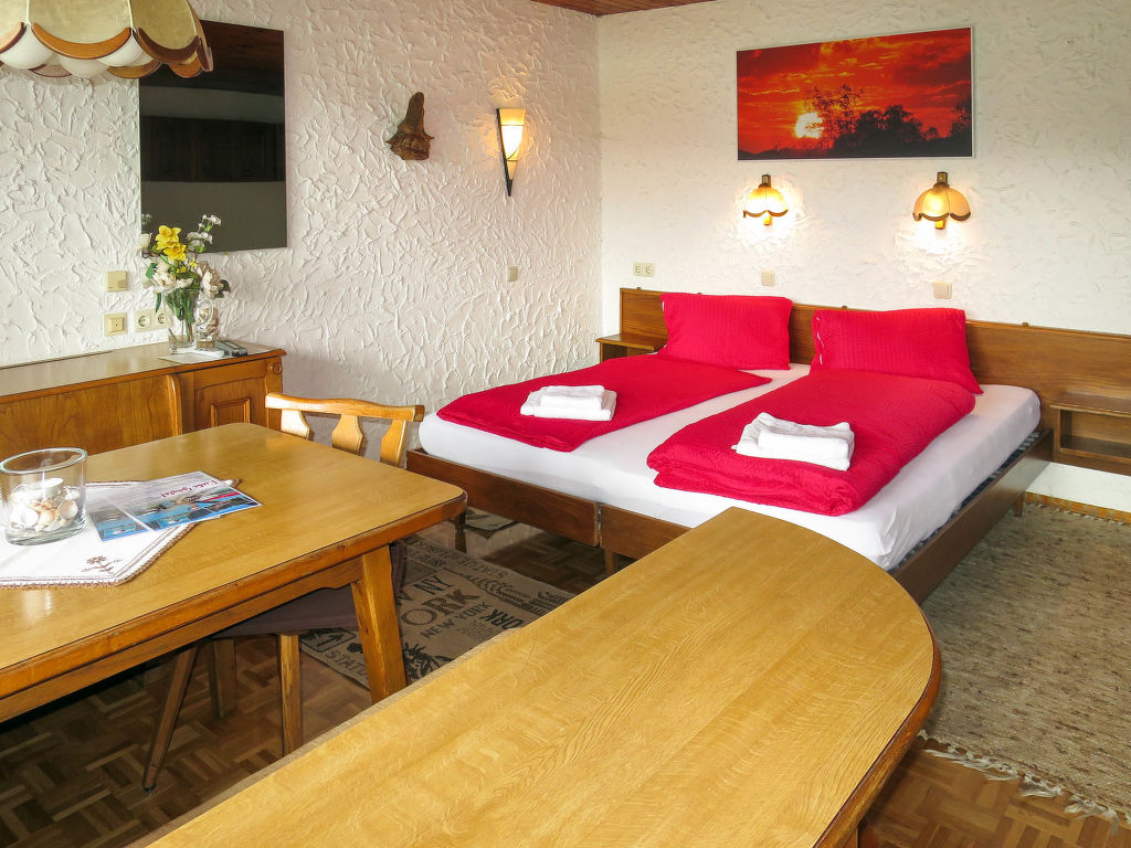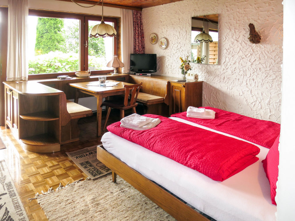 2-Zimmer-Wohnung im Bungalow, ca. 45 m². Wohn-/Schlafraum mit Doppelbett, Essplatz und Kochnische (2 Platten, Kühlschrank, Kaffeemaschine, Wasserkocher). Kleines Doppelzimmer. Dusche/WC. Möblierte Terrasse mit Seeblick.