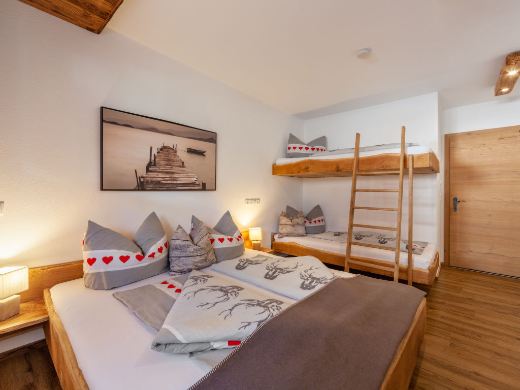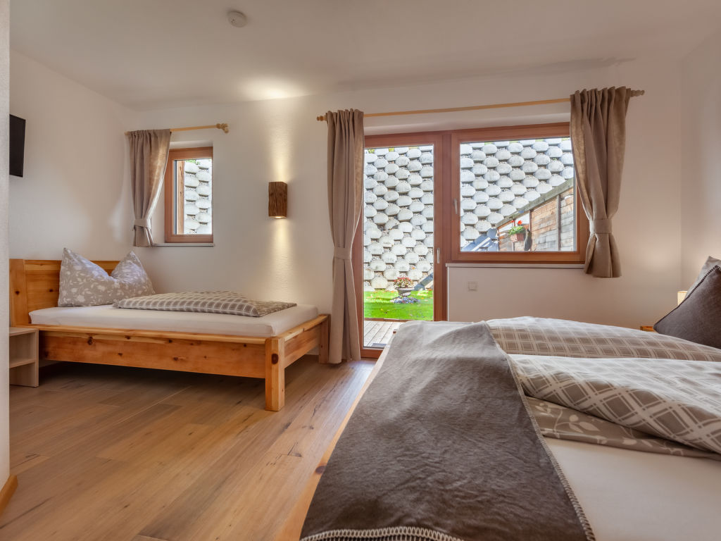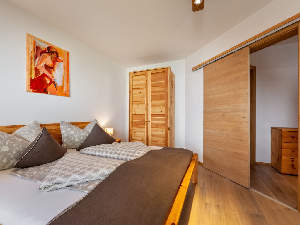 6-Zimmer-Wohnung, 2. Etage, ca. 145 m². Wohnraum mit Couch, Essplatz für 10 Personen, offene Küche (4 Ceranfelder, Backofen, Mikrowelle, Geschirrspüler, Kühl-/Gefrierkombination, Kaffeemaschine, Wasserkocher, Toaster), Balkonausgang. Schlafzimmer mit Doppelbett, Einzelbett und Wand-/Hochbett. Schlafzimmer mit 2 Einzelbetten, Wand-/Hochbett, Dusche und Balkonausgang. Doppelzimmer mit Dusche, Balkonausgang. Bad/Dusche/Doppelwaschbecken/WC. Sep.WC. Unmittelbar neben der abgeschlossenen Wohnung weitere Wohneinheit: Wohn-/Schlafraum mit Bettcouch, Essplatz für 4 Personen, offene Küche (4 Ceranfelder, Backofen, Mikrowelle, Geschirrspüler, Kühl-/Gefrierkombination, Kaffeemaschine, Wasserkocher, Toaster), Terrassenausgang. Schlafzimmer mit Doppelbett, Einzelbett und Terrassenausgang. Dusche/WC.