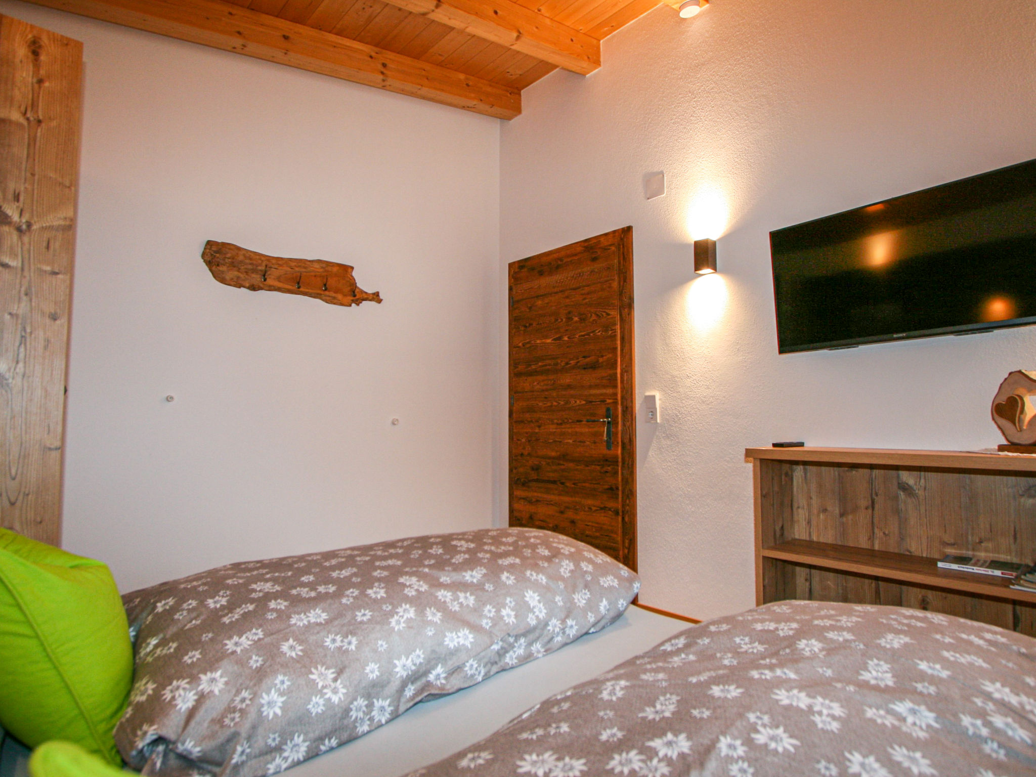 "Chalet Spatn", 3-Zimmer-Wohnung 65 m2, im Obergeschoss. Komfortabel und geschmackvoll eingerichtet: grosses Wohn-/Esszimmer mit Sat-TV. Ausgang zum Balkon. 1 Zimmer mit 2 Betten, 1 Doppelbett und Sat-TV. 1 Zimmer mit 1 Doppeldiwanbett. Wohnküche (Backofen, Geschirrspüler, 4 Glaskeramikherd Platten, Mikrowelle, Tiefkühler, elektrische Kaffeemaschine, Kapseln für die Kaffeemaschine (Cremesso) extra) mit Essecke. Ausgang zur Terrasse. 2 Duschen/WC. Fussbodenheizung. Balkon. Balkonmöbel, Elektrogrill, Abstellkammer. Panoramasicht. Zur Verfügung: Waschmaschine, Wäschetrockner, Kinderhochstuhl, Babybett. Internet (Wireless LAN, gratis). Bitte beachten: Nichtraucher-Haus. 1 kleines Haustier/Hund erlaubt. Bei Belegung mit weniger Personen als der maximalen Personenzahl stehen nicht alle Wohneinheiten zur Verfügung.