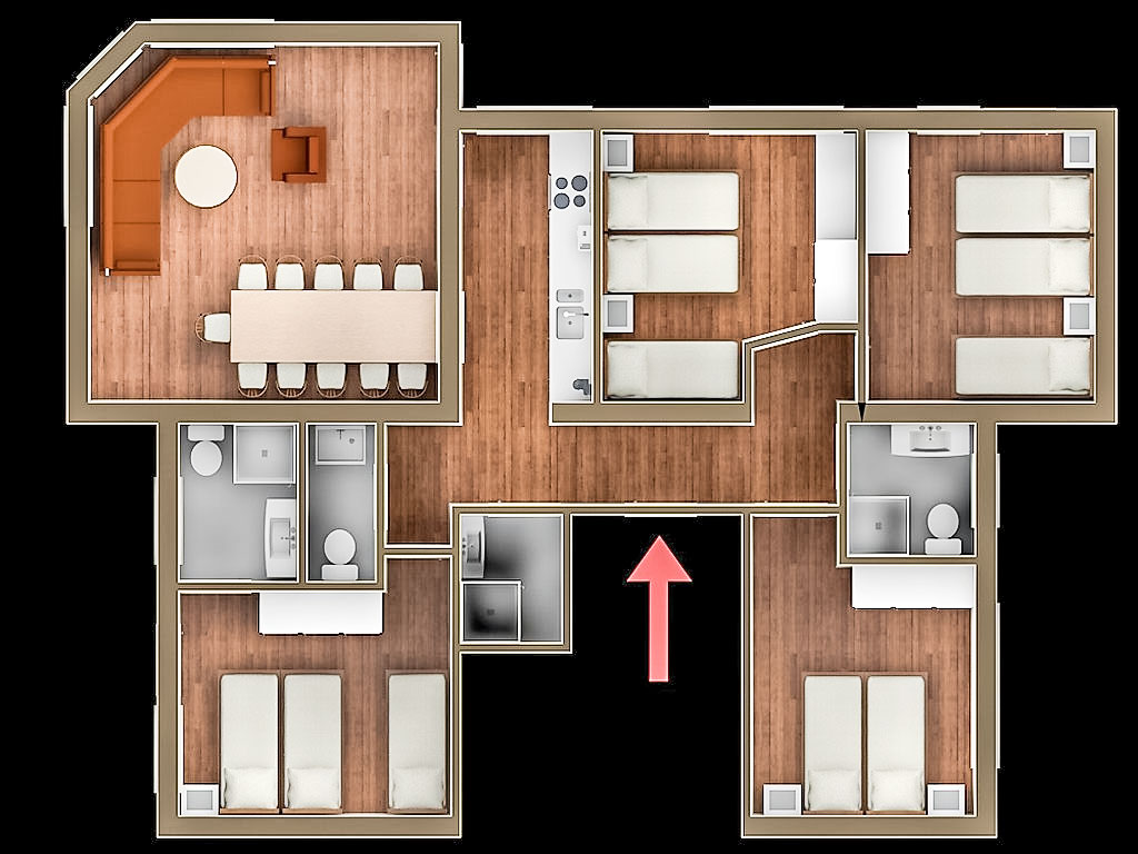5-Zimmer-Wohnung 117 m2 im 1. Stock. Geräumig, geschmackvoll eingerichtet: 1 Doppelzimmer mit Kabel-TV (Flachbildschirm). 3 Zimmer, jedes Zimmer mit 1 Bett, 1 Doppelbett und Kabel-TV (Flachbildschirm). Wohn-/Esszimmer mit Esstisch und Sat-TV (Flachbildschirm). Offene Küche (Backofen, Geschirrspüler, 4 Glaskeramikherd Platten, Mikrowelle, elektrische Kaffeemaschine). 3 Duschen/WC, sep. WC, Doppelwaschbecken. Komfortable Einrichtung im Landhausstil. 2 Balkone. Herrliche Panoramasicht auf die Berge und das Tal. Zur Verfügung: Telefon, Safe, Haartrockner. Internet (Wireless LAN, gratis). Parkplatz (3 Autos). Bitte beachten: Nichtraucher-Unterkunft. Boxspringbetten und können wahlweise als Doppel- oder Einzelbetten genutzt werden. Bei Belegung mit weniger Personen als der maximalen Personenzahl stehen nicht alle Wohneinheiten zur Verfügung.
