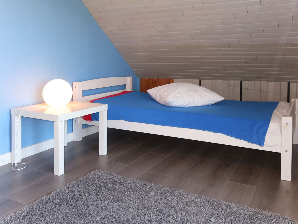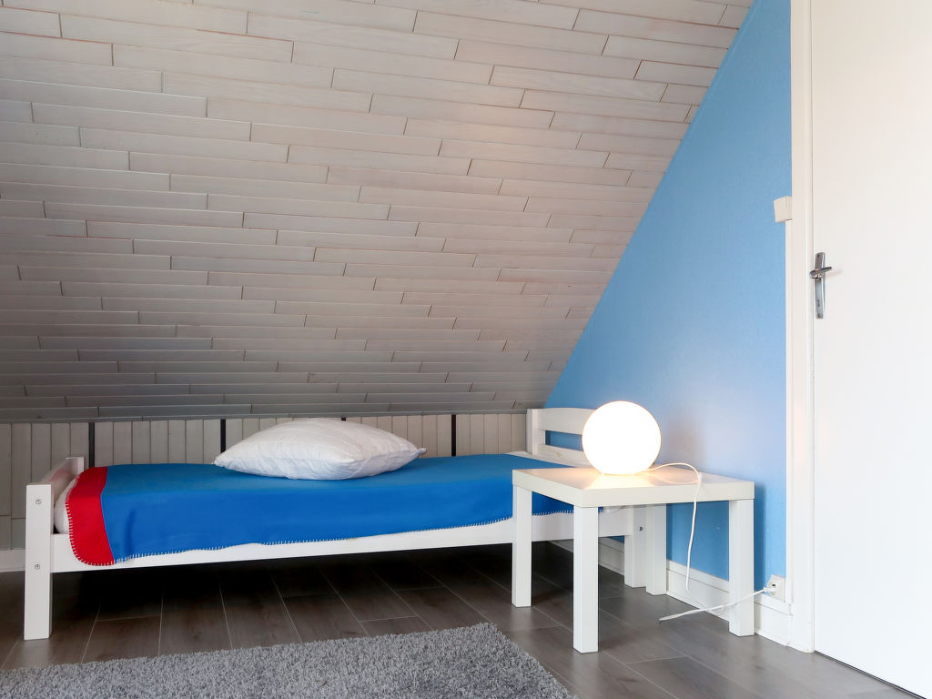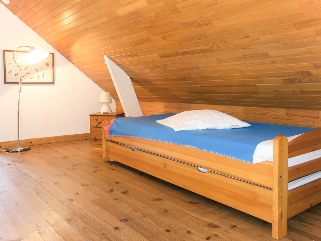 3½-Zimmer-Hausteil, 2 Etagen, ca. 60 m². Erdgeschoss: Eingang über Terrasse in Wohnraum mit Sitzgruppe und Essplatz, durch Theke abgeteilte Küche (4 Ceranfelder, Backofen, Mikrowelle, Kühl-/Gefrierkombination, Kaffeemaschine, Wasserkocher, Toaster). Schlafzimmer mit franz. Bett. Dusche/WC. Vom Wohnraum Treppe ins Obergeschoss (Dachschräge): Offene Galerie mit Einzelbett und Ausziehbett. Zweibettzimmer, Balkonausgang. Inserat einer Privatperson nach Artikel 155, IV, CGI.