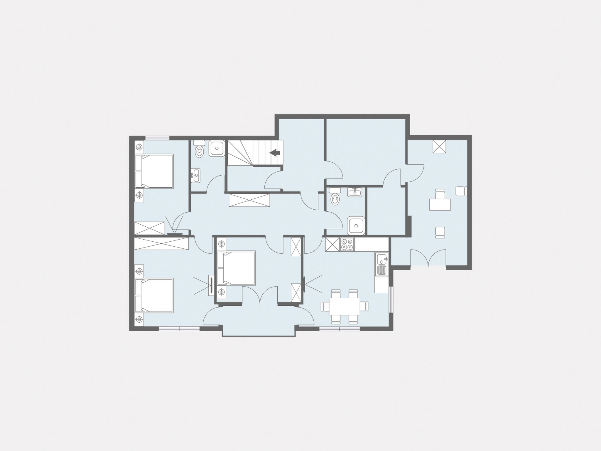 Dieses Angebot setzt sich zusammen aus den Wohnungen KPL 575 und KPL 576 (Verbindung nur über das gemeinsame Treppenhaus). Die Wohnküche im Erdgeschoss bleibt dann verschlossen.4-Zimmer-Wohnung, Erdgeschoss (Hanglage), ca. 72 m². Flur mit Garderobe. Wohnküche (4 Ceranfelder, Backofen, Mikrowelle, Geschirrspüler, Kühl-/Gefrierkombination, Kaffeemaschine, Wasserkocher, Toaster) mit Essplatz (Eckbank) und Terrassenausgang. 3 Doppelzimmer, zwei davon mit Terrassenausgang. 2x Dusche/WC.5-Zimmer-Wohnung, 1. Etage, ca. 90 m². Flur mit Garderobe. Wohnküche (4 Ceranfelder, Backofen, Mikrowelle, Geschirrspüler, Kühl-/Gefrierkombination, Kaffeemaschine, Wasserkocher, Toaster) mit Essplatz (Eckbank) und Balkonausgang. 3 Doppelzimmer, zwei davon mit Balkonausgang. Schlafzimmer mit Doppelbett und Einzelbett. Dusche/Doppelwaschbecken/WC. Dusche/WC.