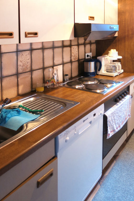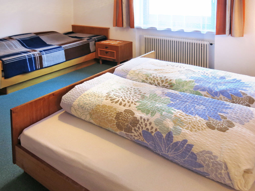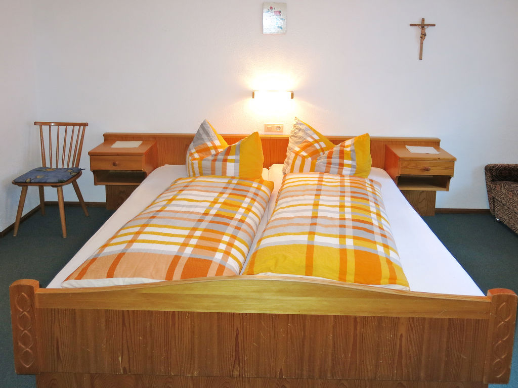 5-Zimmer Wohnung, 2 Etagen, ca. 120 m². 2. Etage (abgeschlossene Wohnung): Flur mit Garderobe und Balkonausgang. Schlafzimmer mit Doppelbett, Einzelbett und Dusche/WC. Doppelzimmer mit Dusche/WC. Doppelzimmer mit Waschbecken. Zweibettzimmer mit Waschbecken. 2x Dusche. Sep.WC. Erdgeschoss: Aufenthaltsraum (ca. 40 m²) mit Essplätzen und Sat-TV. Küche (4 Platten, Backofen, Geschirrspüler, Kühlschrank, Kaffeemaschine, Wasserkocher). Sep.WC. Nebenkosten am Ort € 18 pro Person und Aufenthalt (je nach Belegung) plus Kurtaxe. Wäsche vorhanden. Kaution € 250 (in bar). Haustier nicht erlaubt.