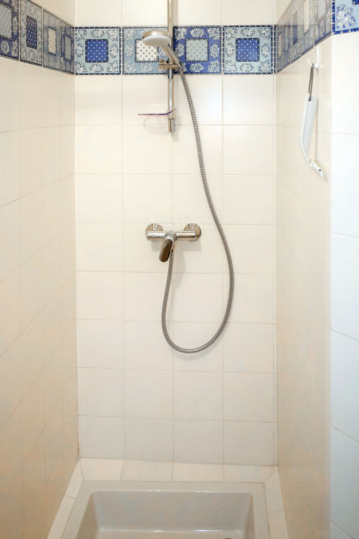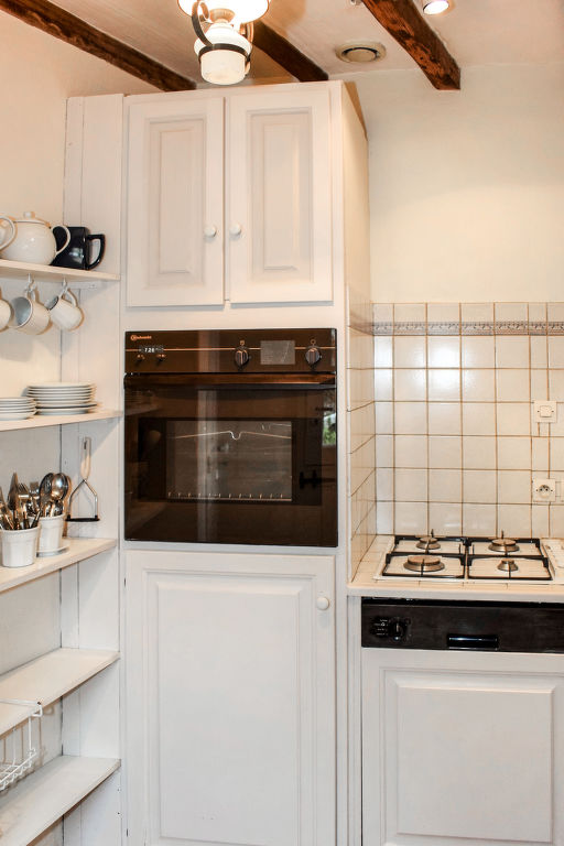 1½-Zimmer-Haus, 2 Etagen, ca. 60 m². Erdgeschoss: Wohnraum mit Sitzcouch, Essplatz, Gartenausgang. Kleine Küche (4 Flammen, Backofen, Mikrowelle, Geschirrspüler, Kühlschrank, Kaffeemaschine), Gartenausgang. Kleine Dusche. Sep.WC. Vom Wohnraum schmale Treppe zur großen, offenen Galerie (Dachschräge, Fenster) mit franz. Bett (1,60 m breit), Waschbecken.