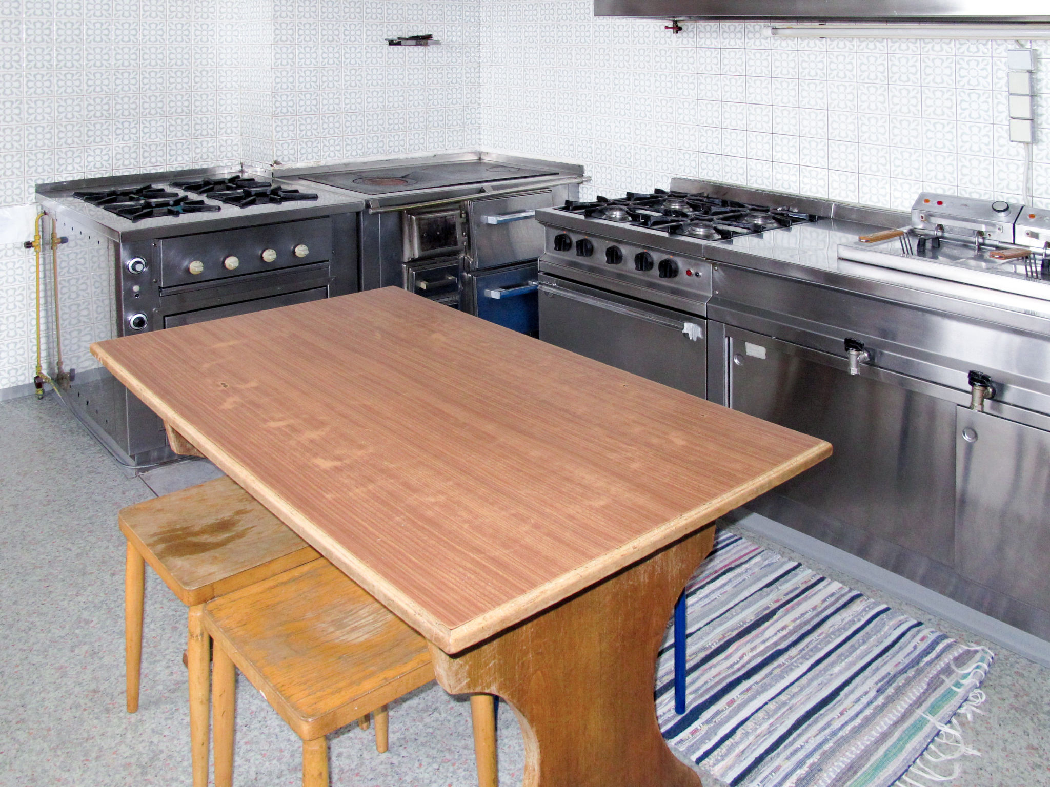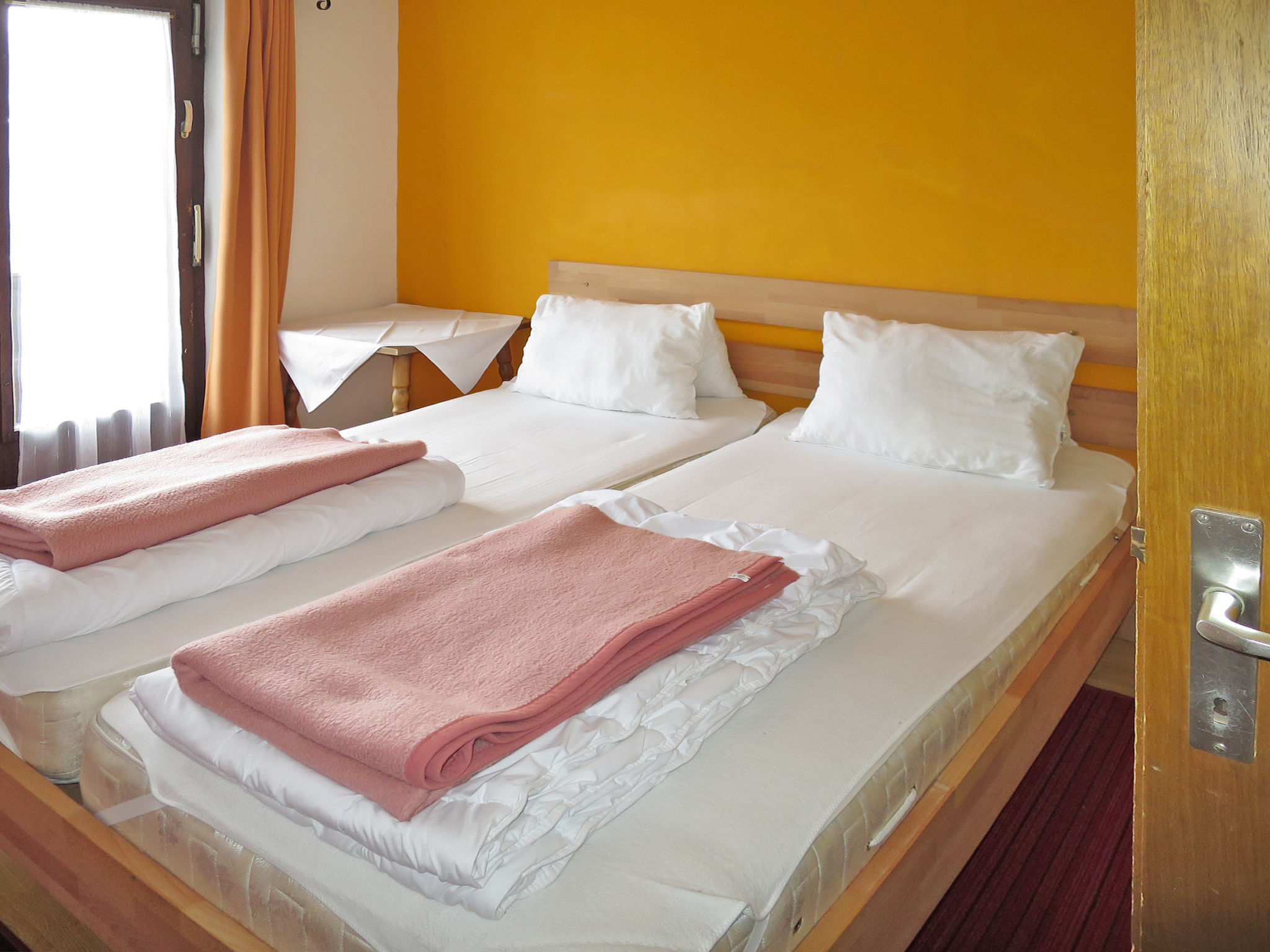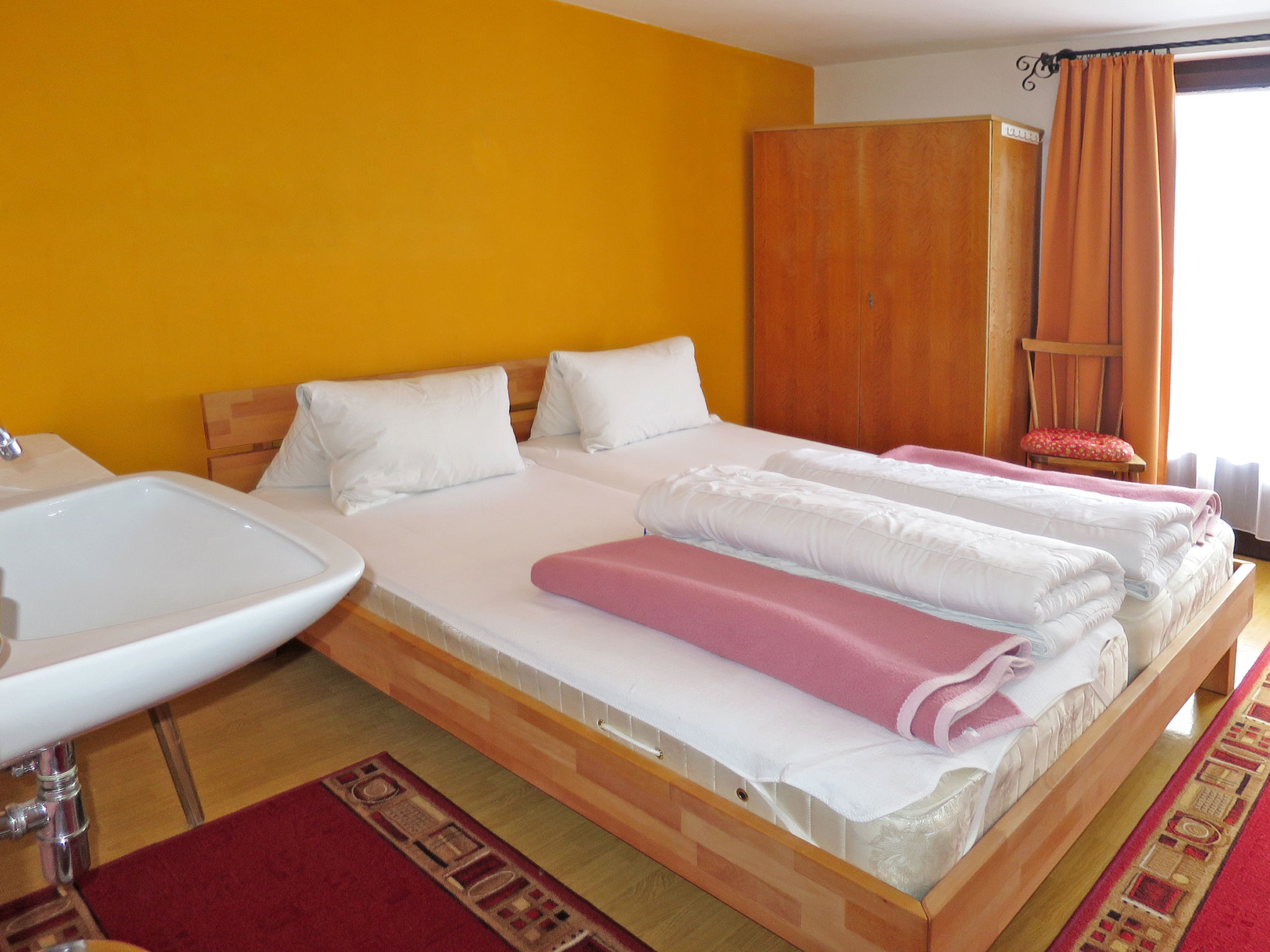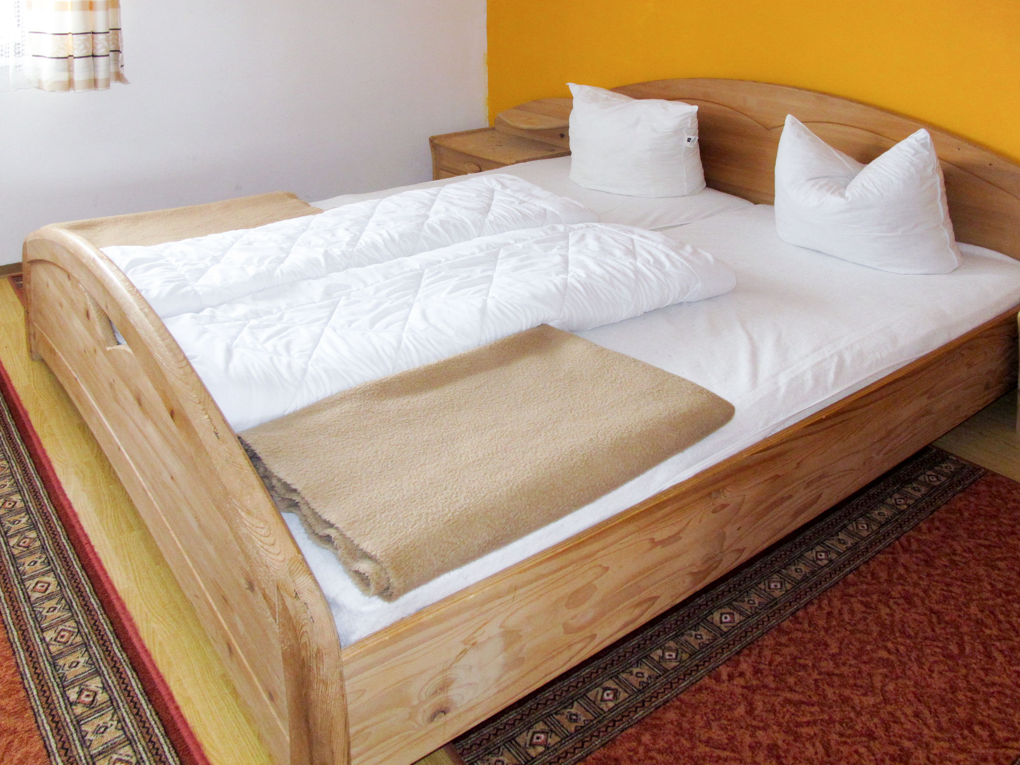 12-Zimmer-Haus, 3 Etagen, ca. 400 m². Erdgeschoss: Eingang ins Treppenhaus und Zugang zu: Aufenthaltsraum mit Essplätzen (Eckbänke) und Theke. Gut eingerichtete Gastroküche (2x Gasherd mit jeweils 4 Flammen, Holzherd, 2x Backofen, Grillplatte, Mikrowelle, Kühlschrank, Gefriertruhe, 2x Kaffeemaschine, Wasserkocher, Friteuse, Brot-/Wurstschneidemaschine) mit kleinem Vorraum (dort Geschirr- und Gläserspüler). 3x sep.WC. 1 Zimmer auf dieser Etage wird von den Vermietern privat genutzt. 1. Etage: Flur. 4 Dreibettzimmer (Doppelbett und Einzelbett), jeweils mit Waschbecken und Balkonausgang. 2 Doppelzimmer, jeweils mit Waschbecken und Balkonausgang. Zweibettzimmer. 2x Dusche. 2x sep.WC. 2. Etage (Dachgeschoss): Flur. 2 Dreibettzimmer (Doppelbett und Einzelbett) und 2 Doppelzimmer, jeweils mit Waschbecken. Sep.WC. Bei Belegung mit weniger Personen als der maximalen Personenzahl stehen nicht alle Wohneinheiten zur Verfügung.