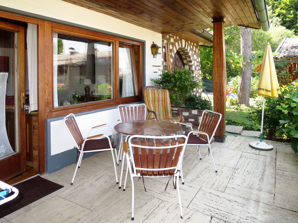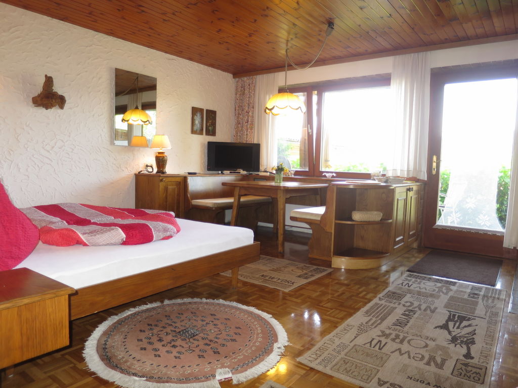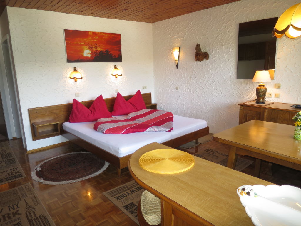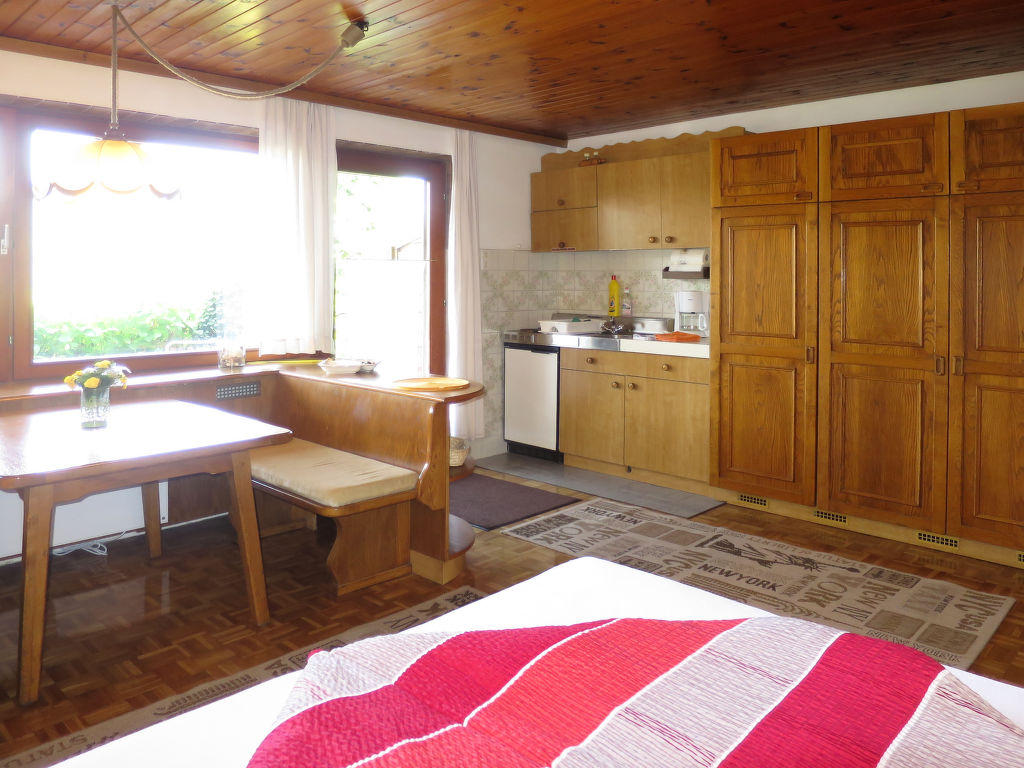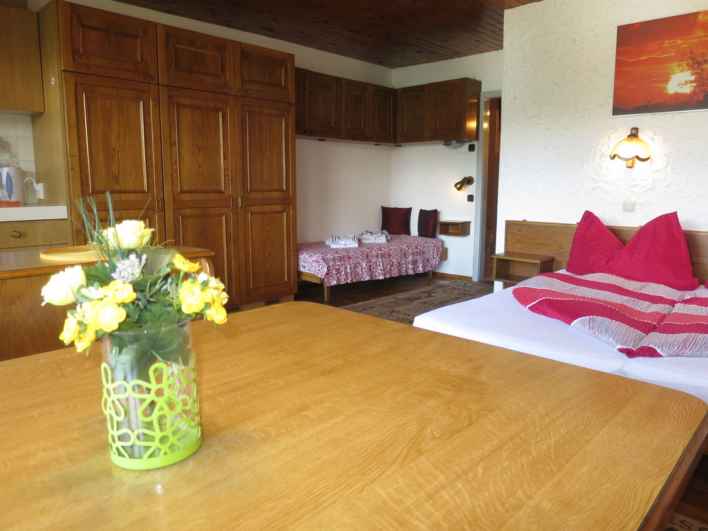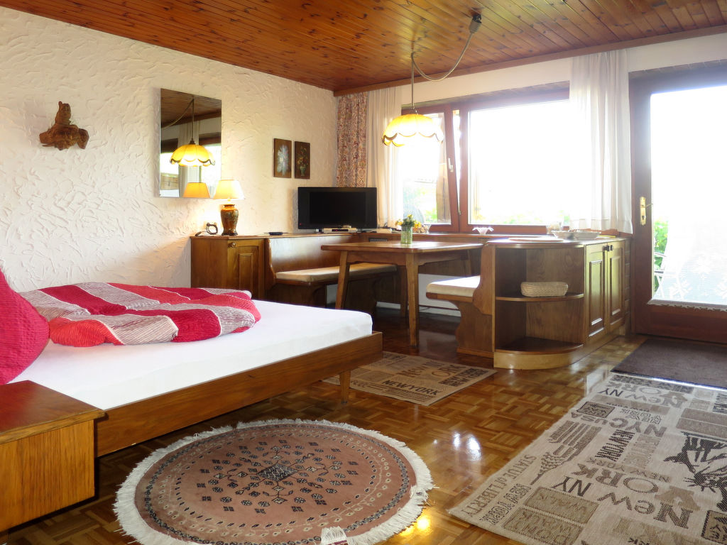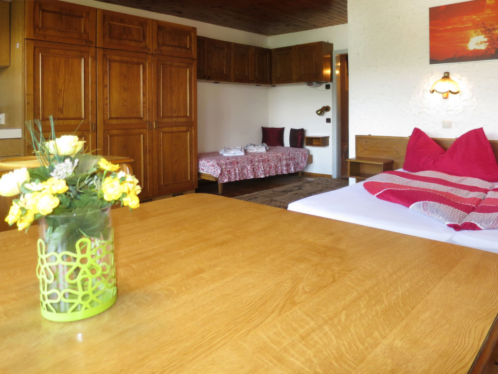 2-Zimmer-Wohnung im Bungalow, ca. 45 m². Wohn-/Schlafraum mit Doppelbett, Essplatz und Kochnische (2 Platten, Kühlschrank, Kaffeemaschine, Wasserkocher). Kleines Doppelzimmer. Dusche/WC. Möblierte Terrasse mit Seeblick.