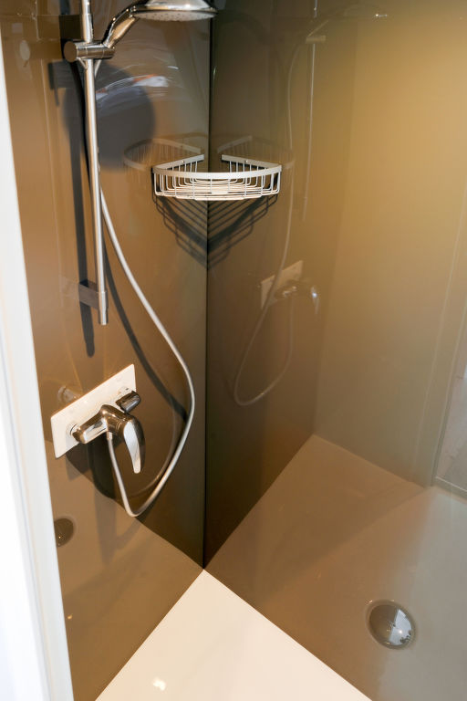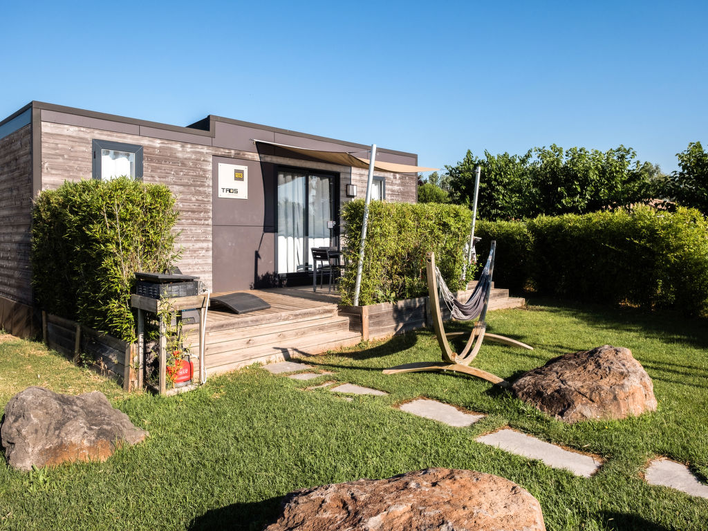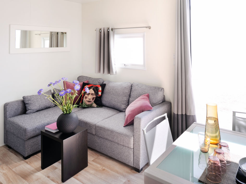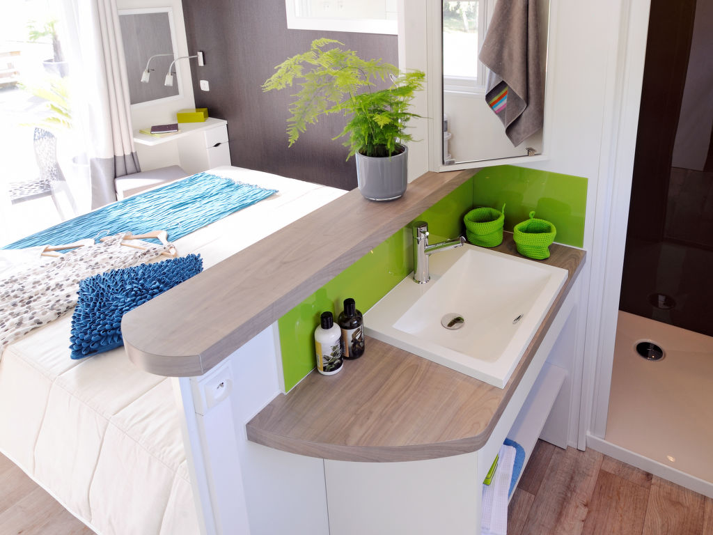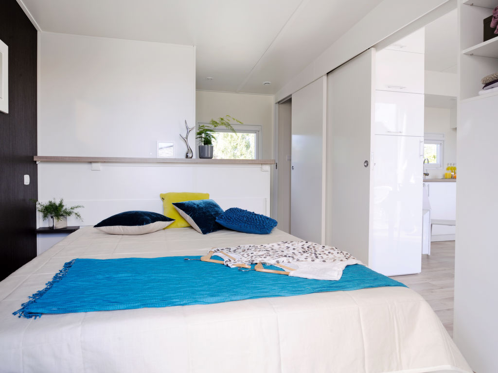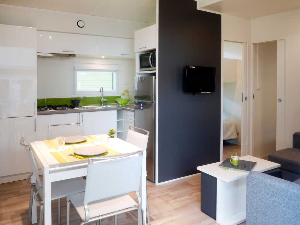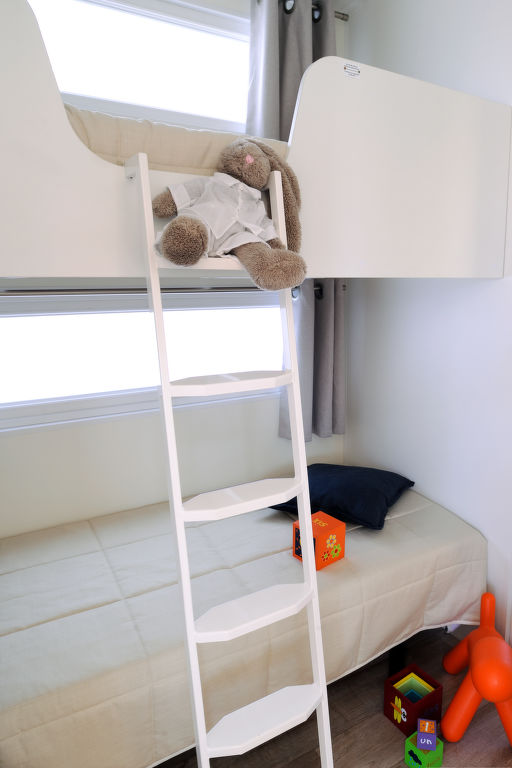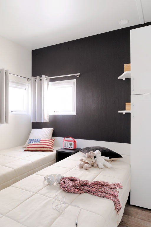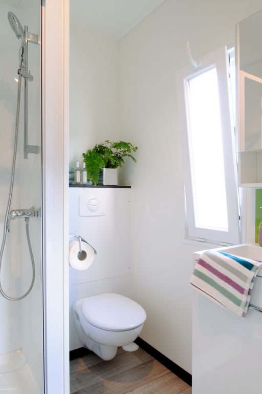 4-Zimmer-Mobilhome, ca. 40 m². Wohnraum mit Essplatz, Kochnische. Schlafzimmer mit franz. Bett (1,60 m breit), Dusche/WC. Zweibettzimmer. Schlafzimmer mit Etagenbett (0,80 m breit). Dusche/WC.