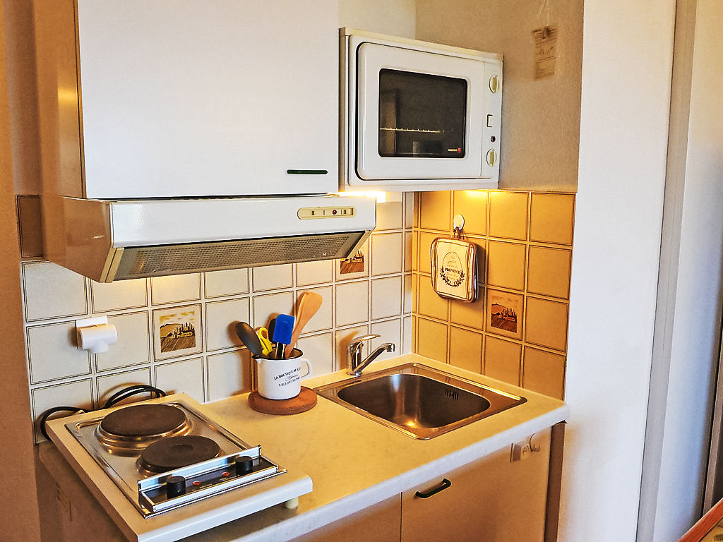 2-Zimmer-Wohnung 28 m2 im 1. Stock. Zweckmässig und schön eingerichtet: Wohn-/Esszimmer mit 1 Doppeldiwanbett (1 x 140 cm, Länge 200 cm), TV, Flachbildschirm und Ventilator. Ausgang zur Terrasse. 1 Zimmer mit 1 franz. Bett (1 x 140 cm, Länge 190 cm). Kochnische (Backofen, 1 Induktionskochplatten, Toaster, Wasserkocher, elektrische Kaffeemaschine, Kapseln für die Kaffeemaschine (Senseo) extra, Kombinationsmikrowelle). Bad, Dusche, sep. WC. E-Heizung, Boiler (100 Liter). Terrasse 10 m2, Südlage. Terrassenmöbel. Panoramasicht auf das Meer. Zur Verfügung: Waschmaschine, Haartrockner. Internet (Wireless LAN). Parkplatz Nr. 10. Bitte beachten: Rauchmelder. Inserat einer Privatperson nach Artikel 155, IV, CGI.
