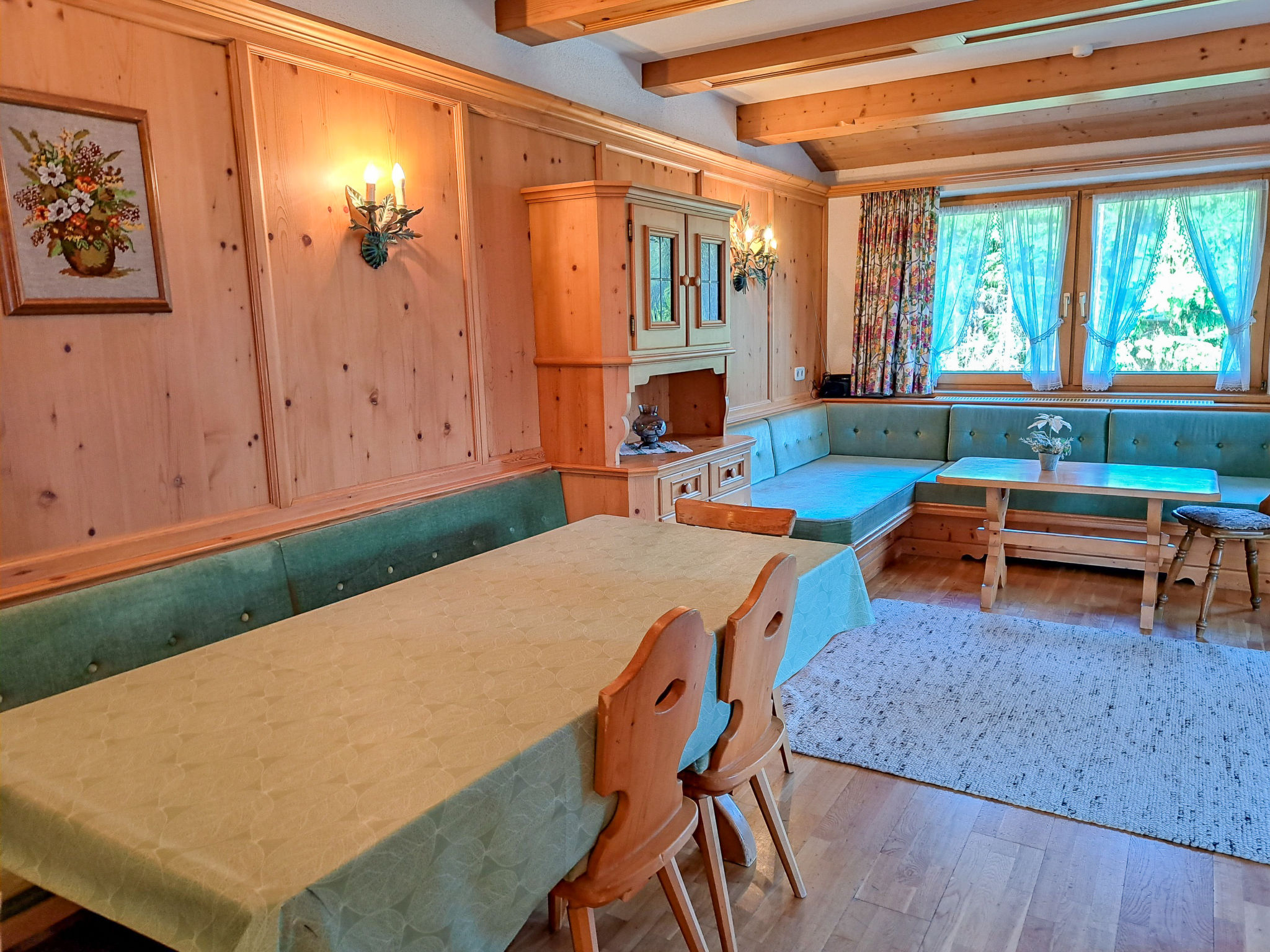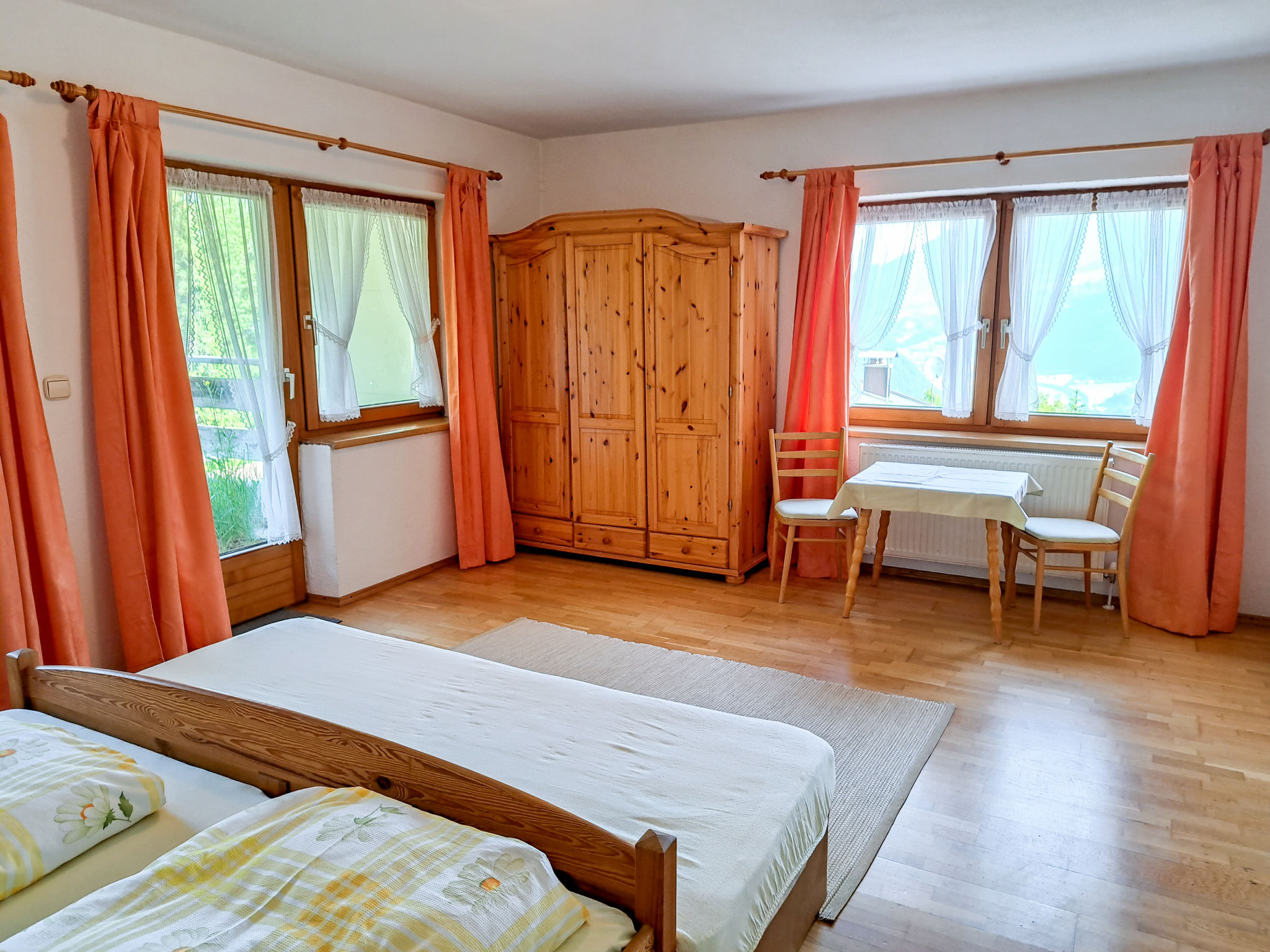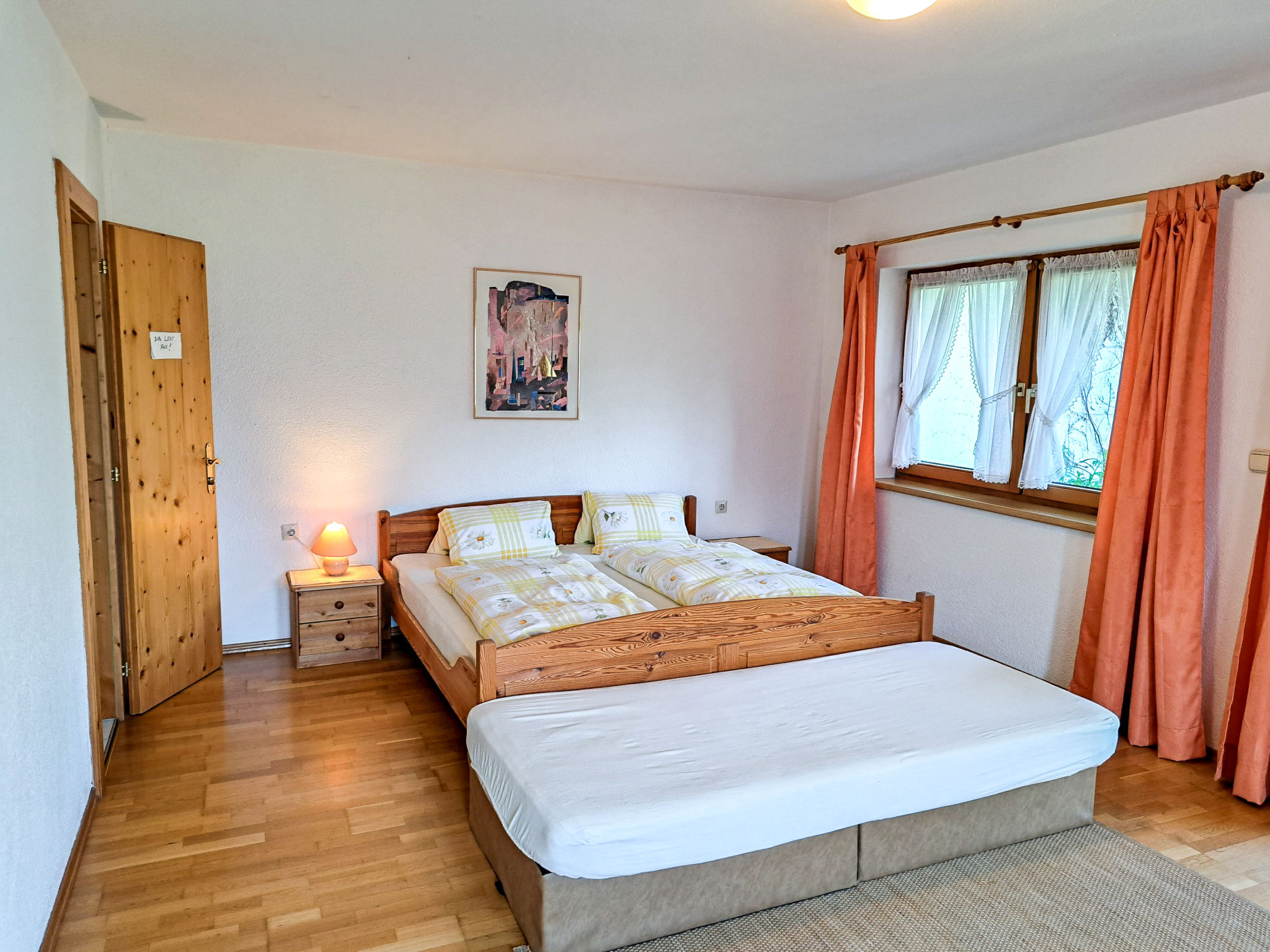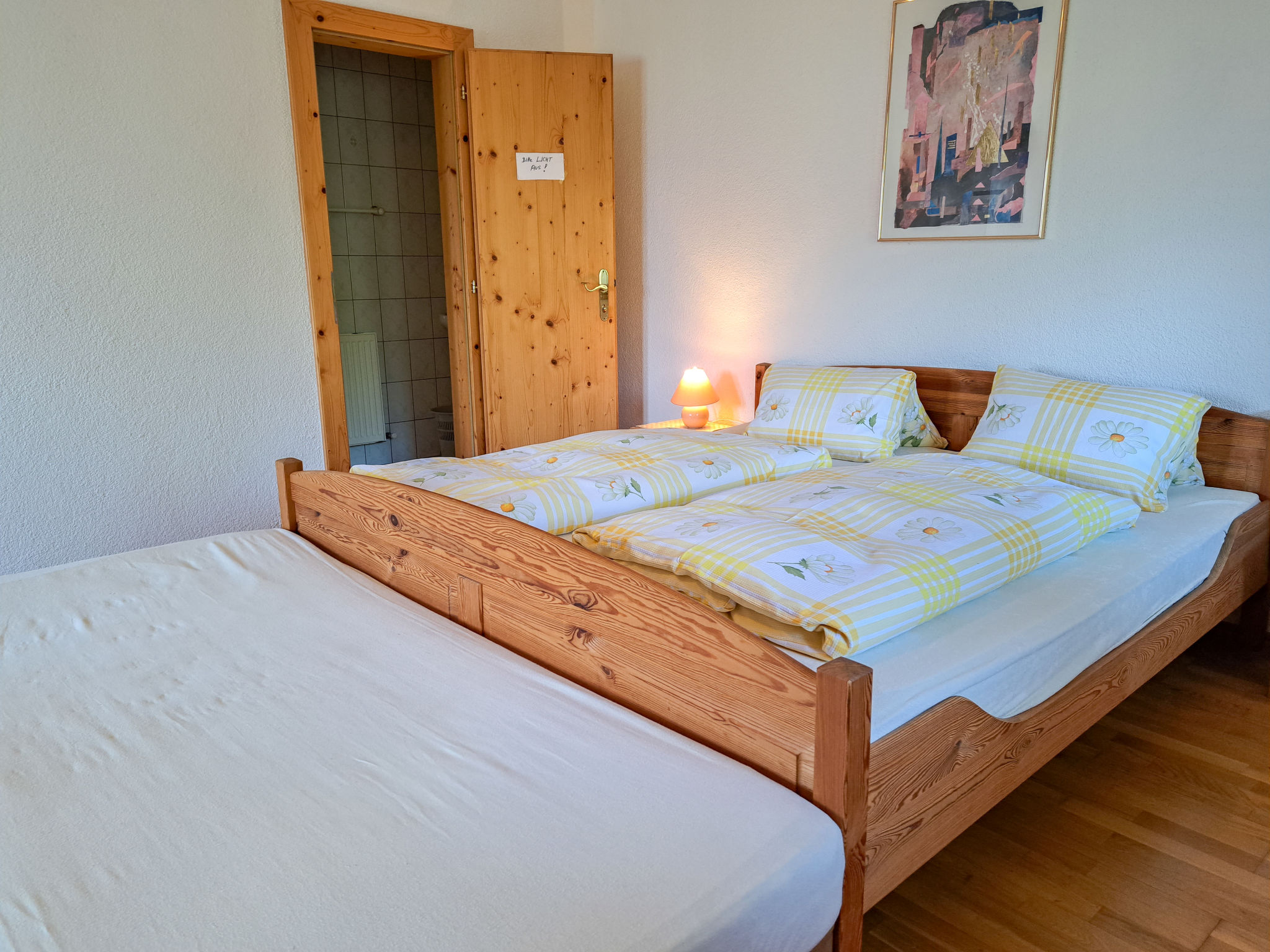 6-Zimmer-Haus, 3 Etagen, ca. 160 m². Zugang über Außentreppe in die 1. Etage (Hanglage): Schlafzimmer mit Doppelbett, Einzelbett, Dusche, Waschbecken und Balkonausgang. Zweibettzimmer mit Dusche und Waschbecken. Sep.WC. 2. Etage: Wohnraum mit Sitzgruppe, Kachelofen (Holz inklusive), Essplatz (Eckbank) für 8 Personen und Balkonausgang. Durch offenen Rundbogen in die Küche (4 Ceranfelder, Backofen, Geschirrspüler, Kühlschrank, Kaffeemaschine, Wasserkocher, Toaster) mit Essplatz für 5 Personen und Balkonausgang. Schlafzimmer mit Doppelbettcouch und Balkonausgang. 3. Etage (Dachschräge, nicht störend): Schlafzimmer mit Doppelbett, Einzelbett und Zugang zu sep.WC. Zweibettzimmer mit Zugang zu sep.WC. Bad/Dusche/Doppelwaschbecken.