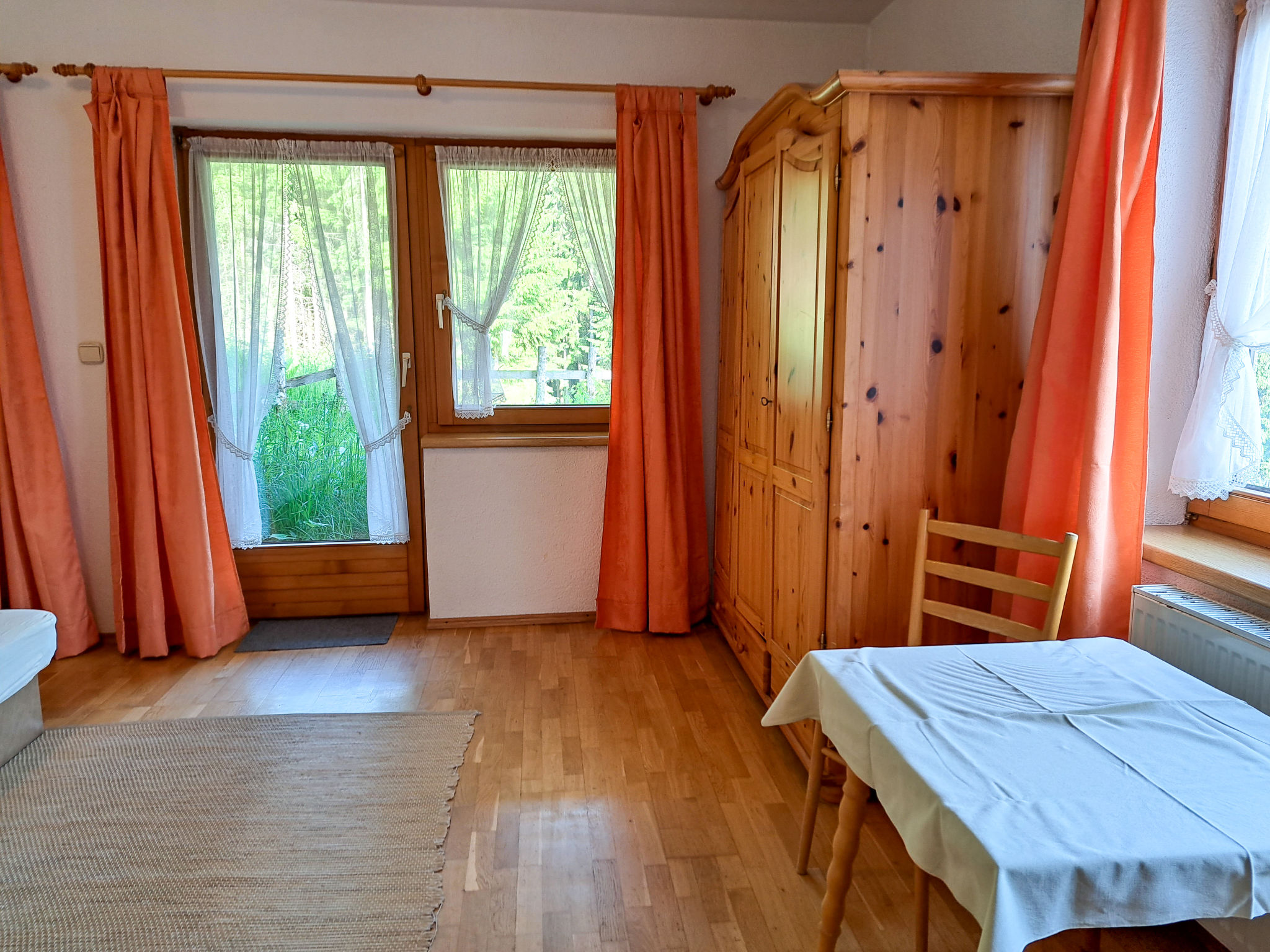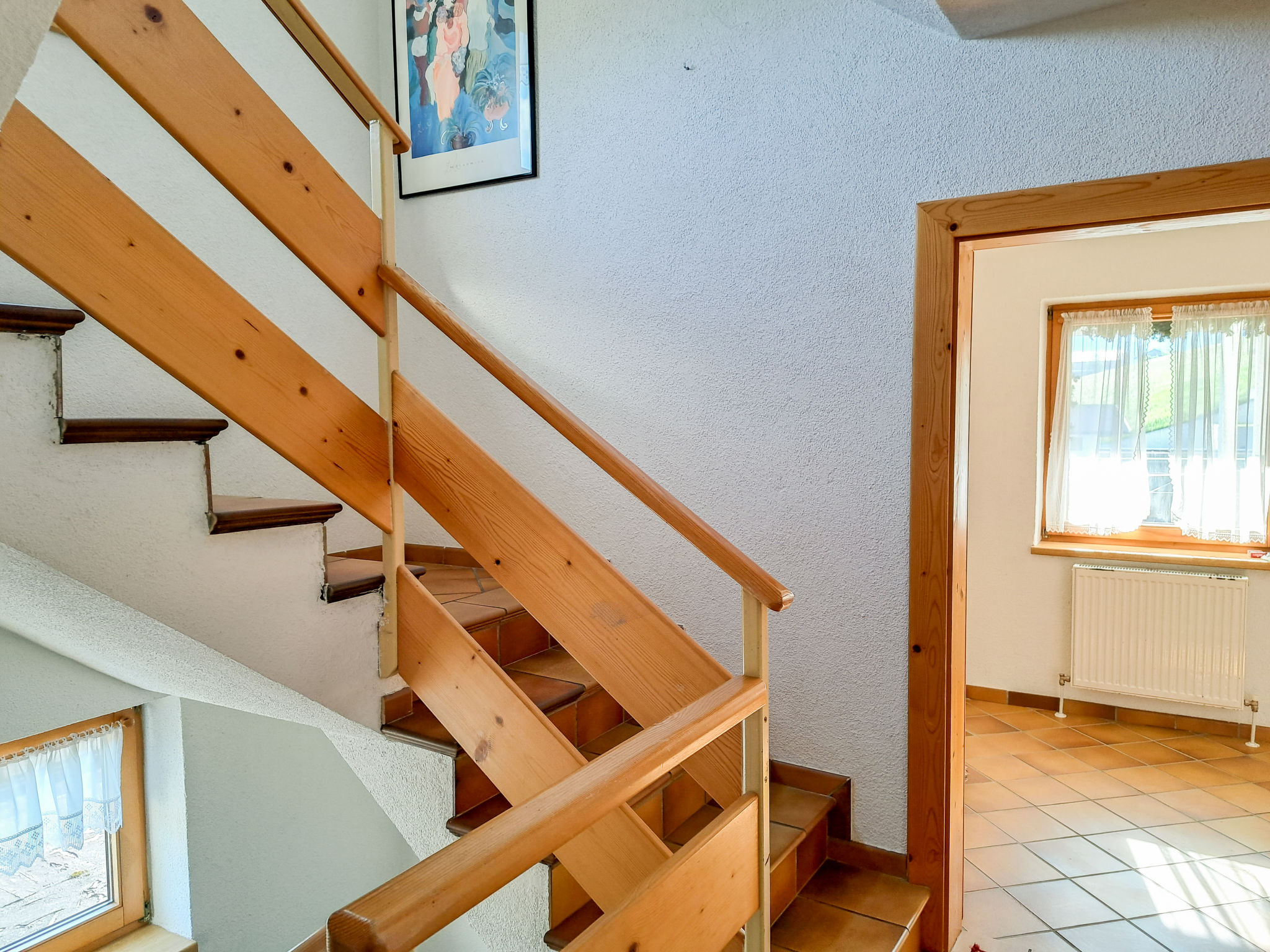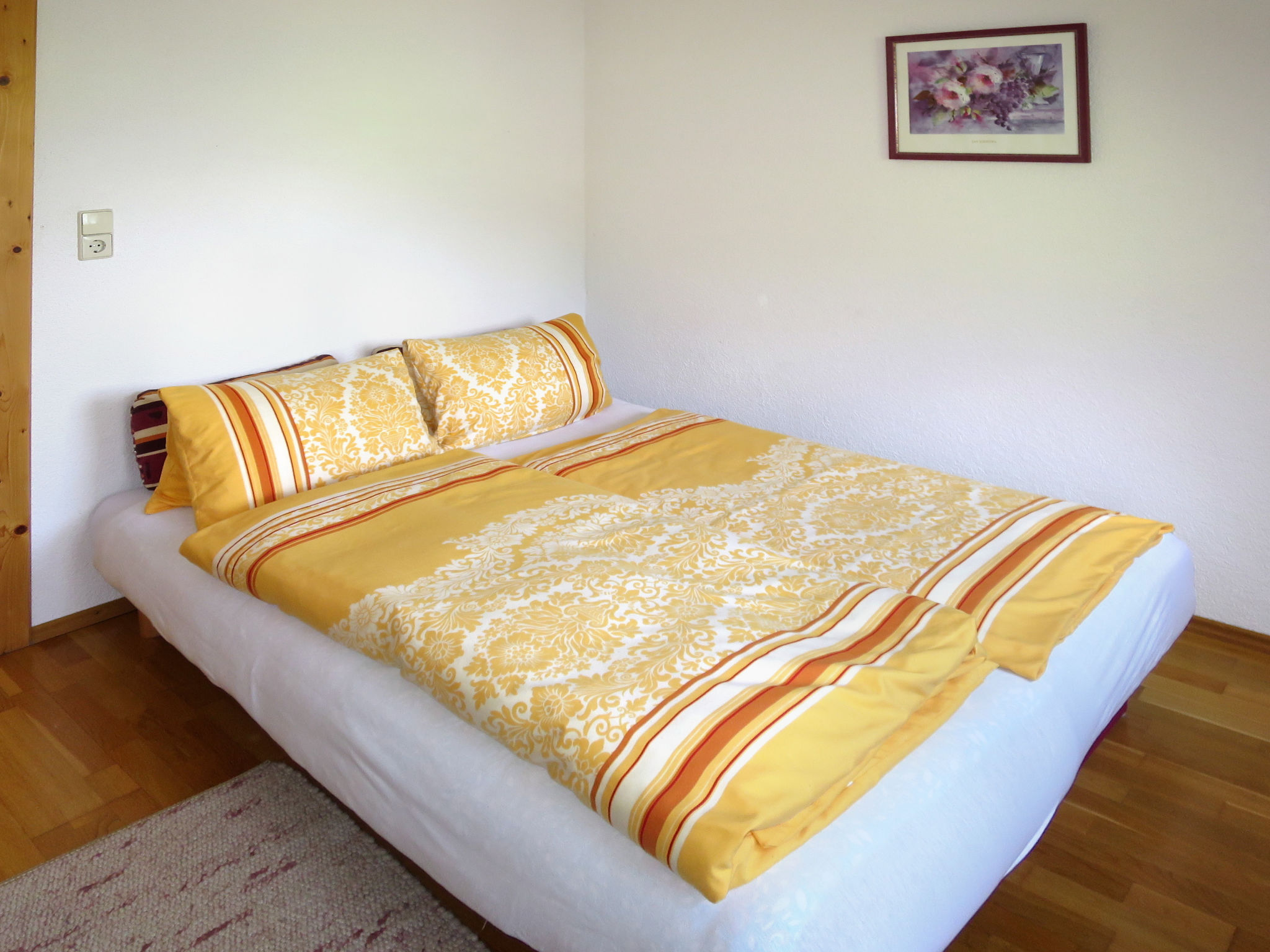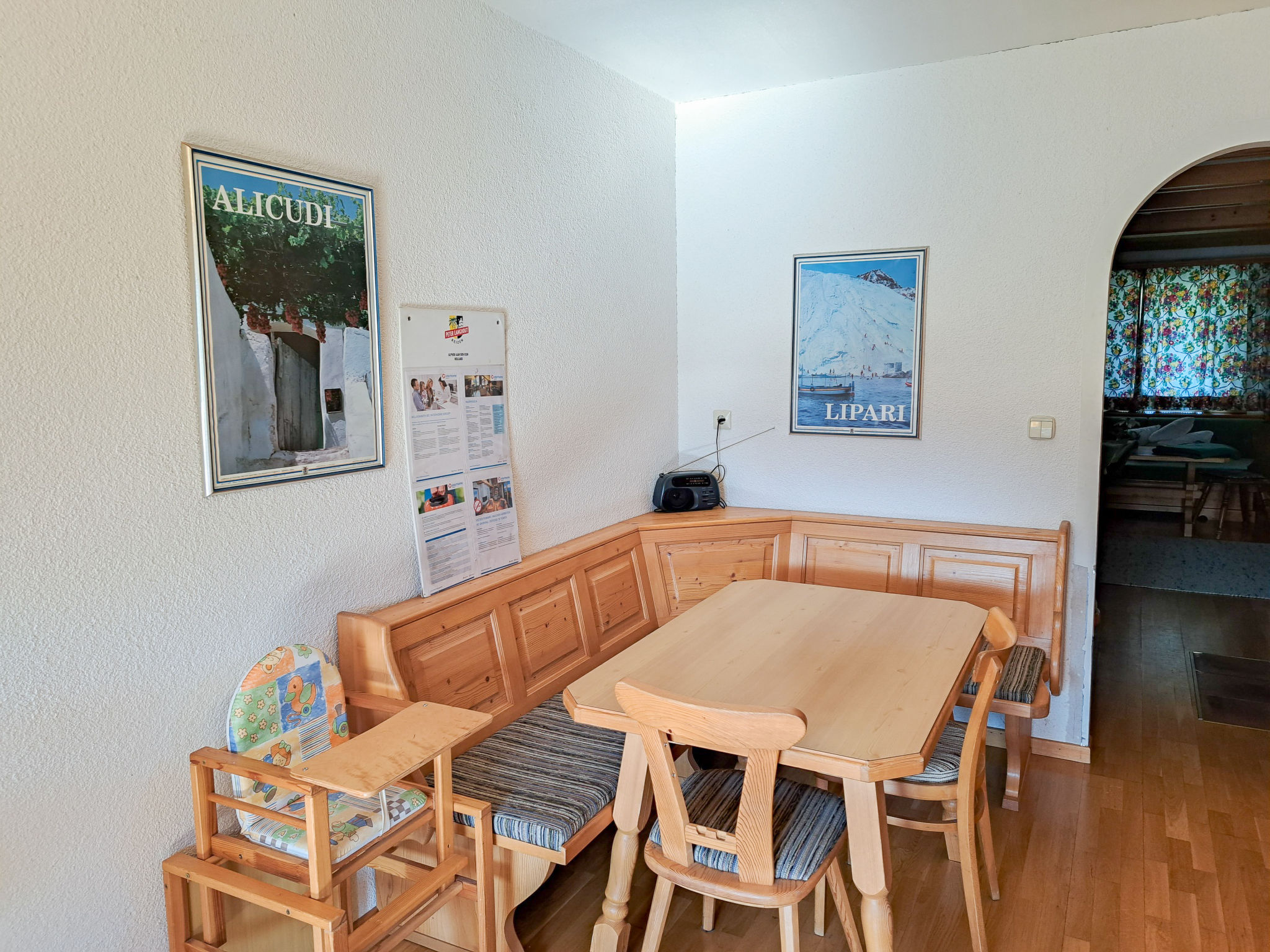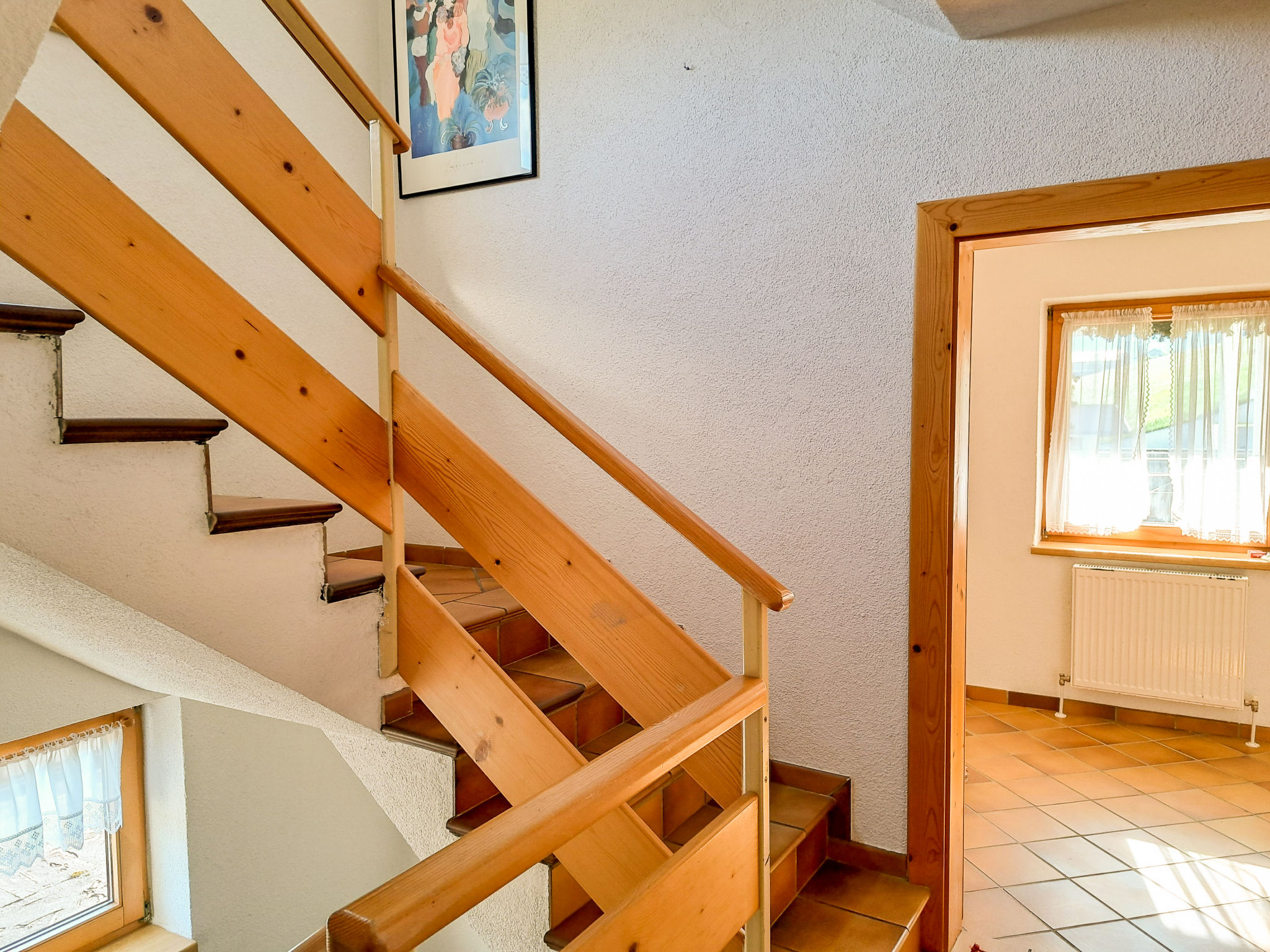 6-Zimmer-Haus, 3 Etagen, ca. 160 m². Zugang über Außentreppe in die 1. Etage (Hanglage): Schlafzimmer mit Doppelbett, Einzelbett, Dusche, Waschbecken und Balkonausgang. Zweibettzimmer mit Dusche und Waschbecken. Sep.WC. 2. Etage: Wohnraum mit Sitzgruppe, Kachelofen (Holz inklusive), Essplatz (Eckbank) für 8 Personen und Balkonausgang. Durch offenen Rundbogen in die Küche (4 Ceranfelder, Backofen, Geschirrspüler, Kühlschrank, Kaffeemaschine, Wasserkocher, Toaster) mit Essplatz für 5 Personen und Balkonausgang. Schlafzimmer mit Doppelbettcouch und Balkonausgang. 3. Etage (Dachschräge, nicht störend): Schlafzimmer mit Doppelbett, Einzelbett und Zugang zu sep.WC. Zweibettzimmer mit Zugang zu sep.WC. Bad/Dusche/Doppelwaschbecken.