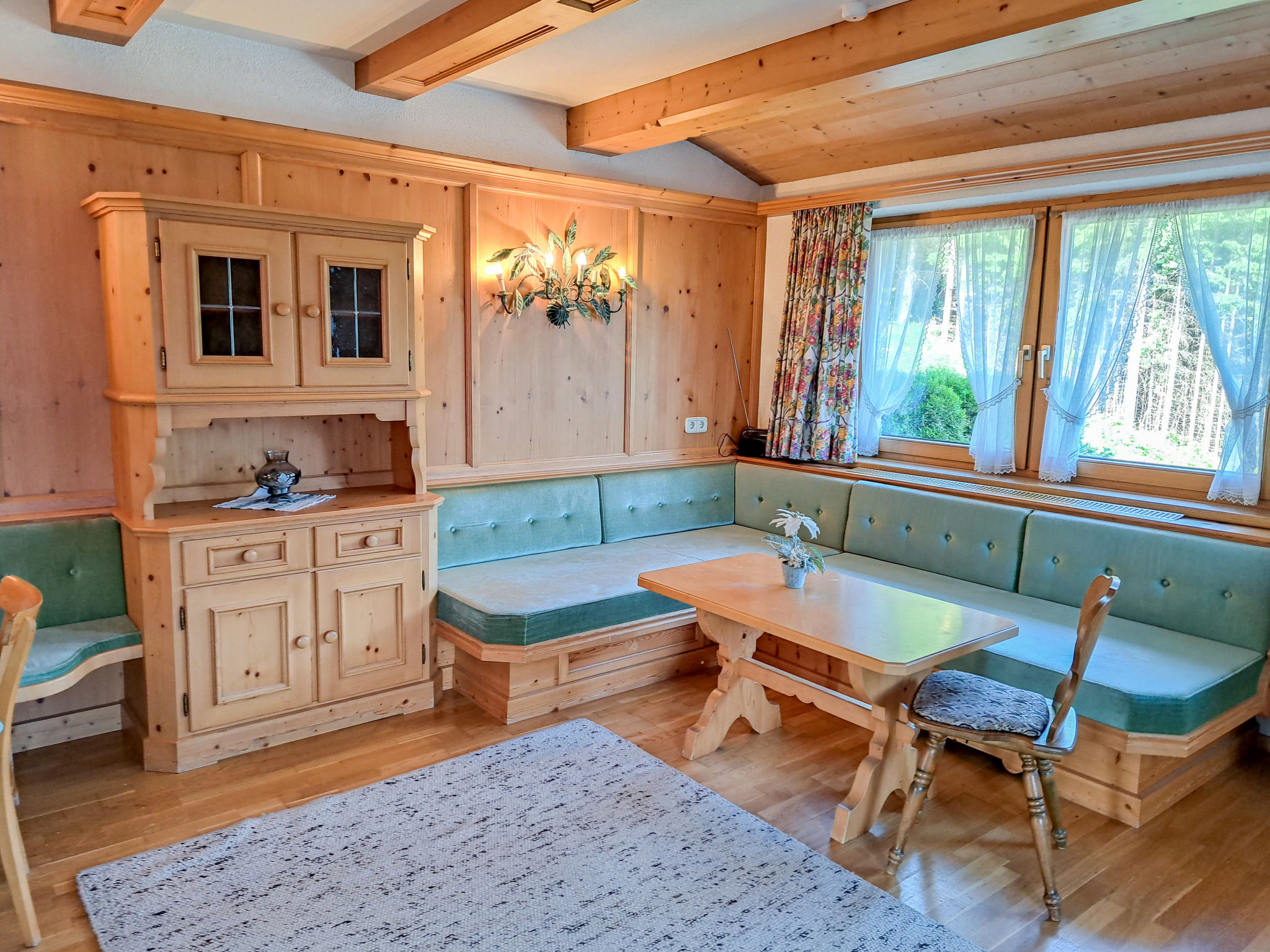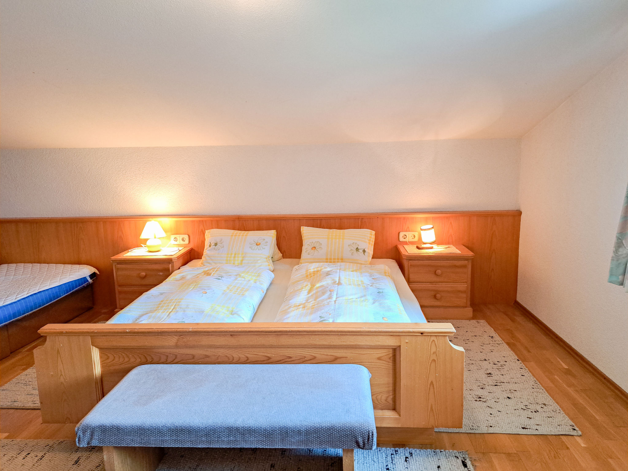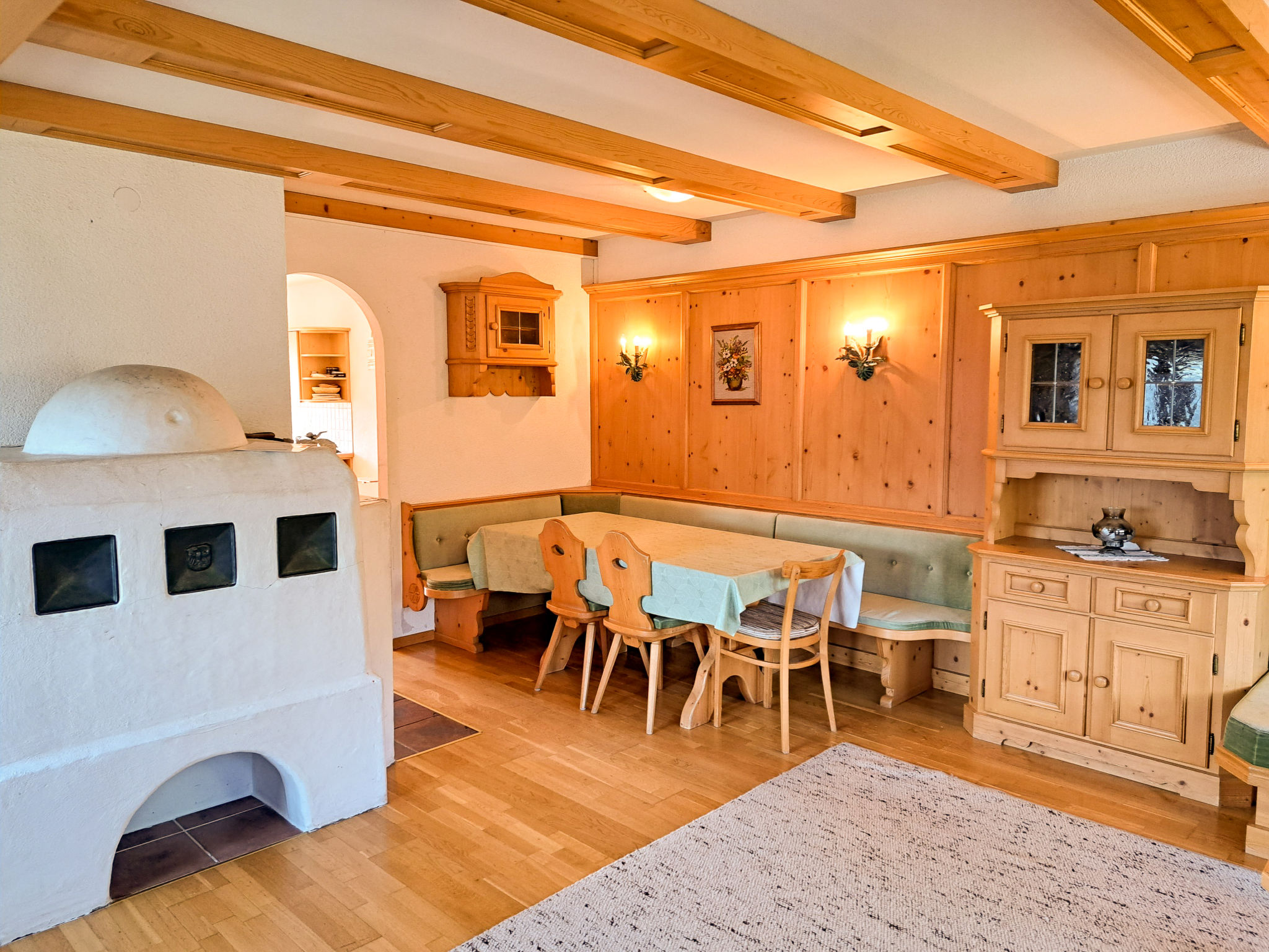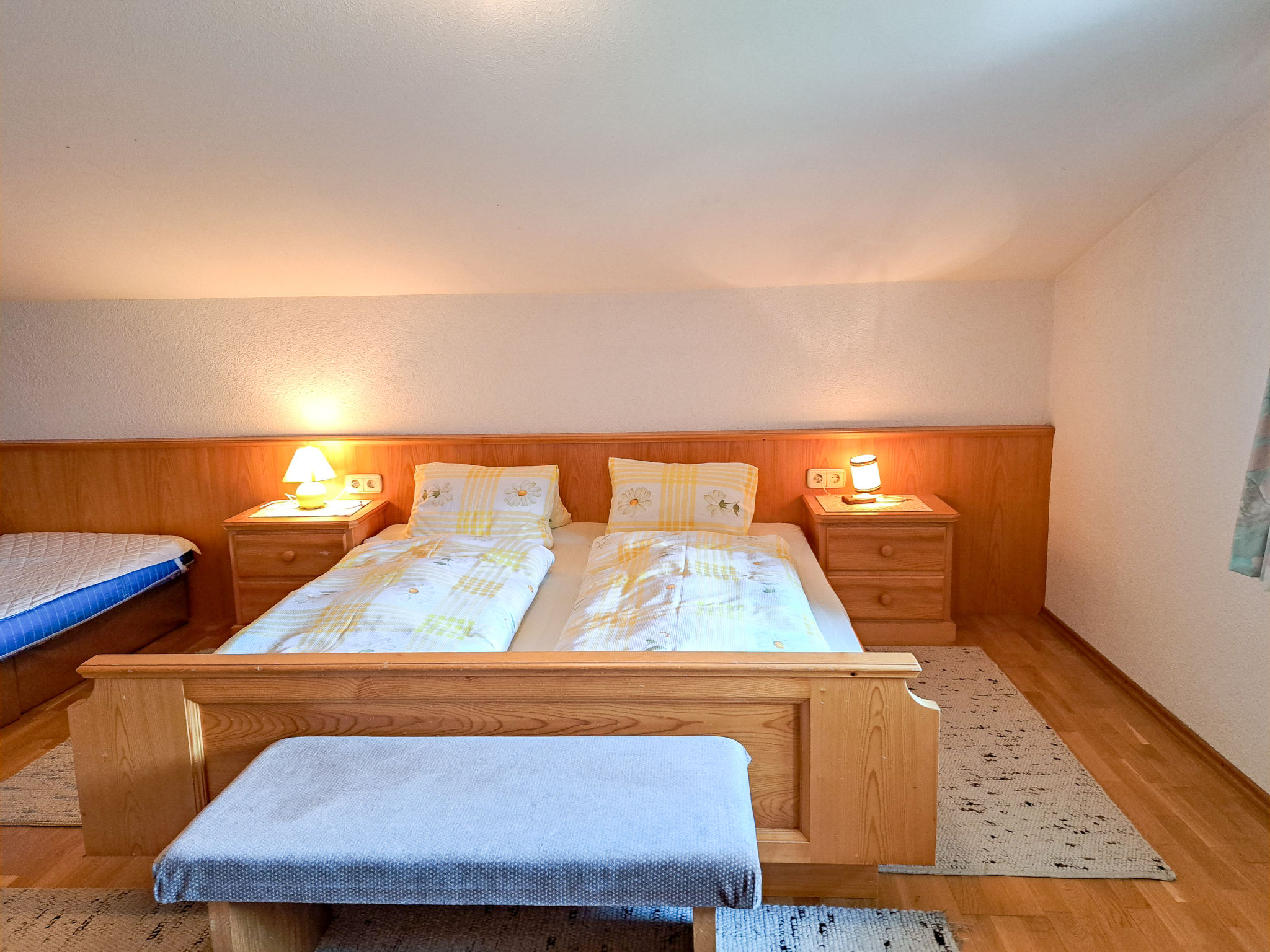 6-Zimmer-Haus, 3 Etagen, ca. 160 m². Zugang über Außentreppe in die 1. Etage (Hanglage): Schlafzimmer mit Doppelbett, Einzelbett, Dusche, Waschbecken und Balkonausgang. Zweibettzimmer mit Dusche und Waschbecken. Sep.WC. 2. Etage: Wohnraum mit Sitzgruppe, Kachelofen (Holz inklusive), Essplatz (Eckbank) für 8 Personen und Balkonausgang. Durch offenen Rundbogen in die Küche (4 Ceranfelder, Backofen, Geschirrspüler, Kühlschrank, Kaffeemaschine, Wasserkocher, Toaster) mit Essplatz für 5 Personen und Balkonausgang. Schlafzimmer mit Doppelbettcouch und Balkonausgang. 3. Etage (Dachschräge, nicht störend): Schlafzimmer mit Doppelbett, Einzelbett und Zugang zu sep.WC. Zweibettzimmer mit Zugang zu sep.WC. Bad/Dusche/Doppelwaschbecken.