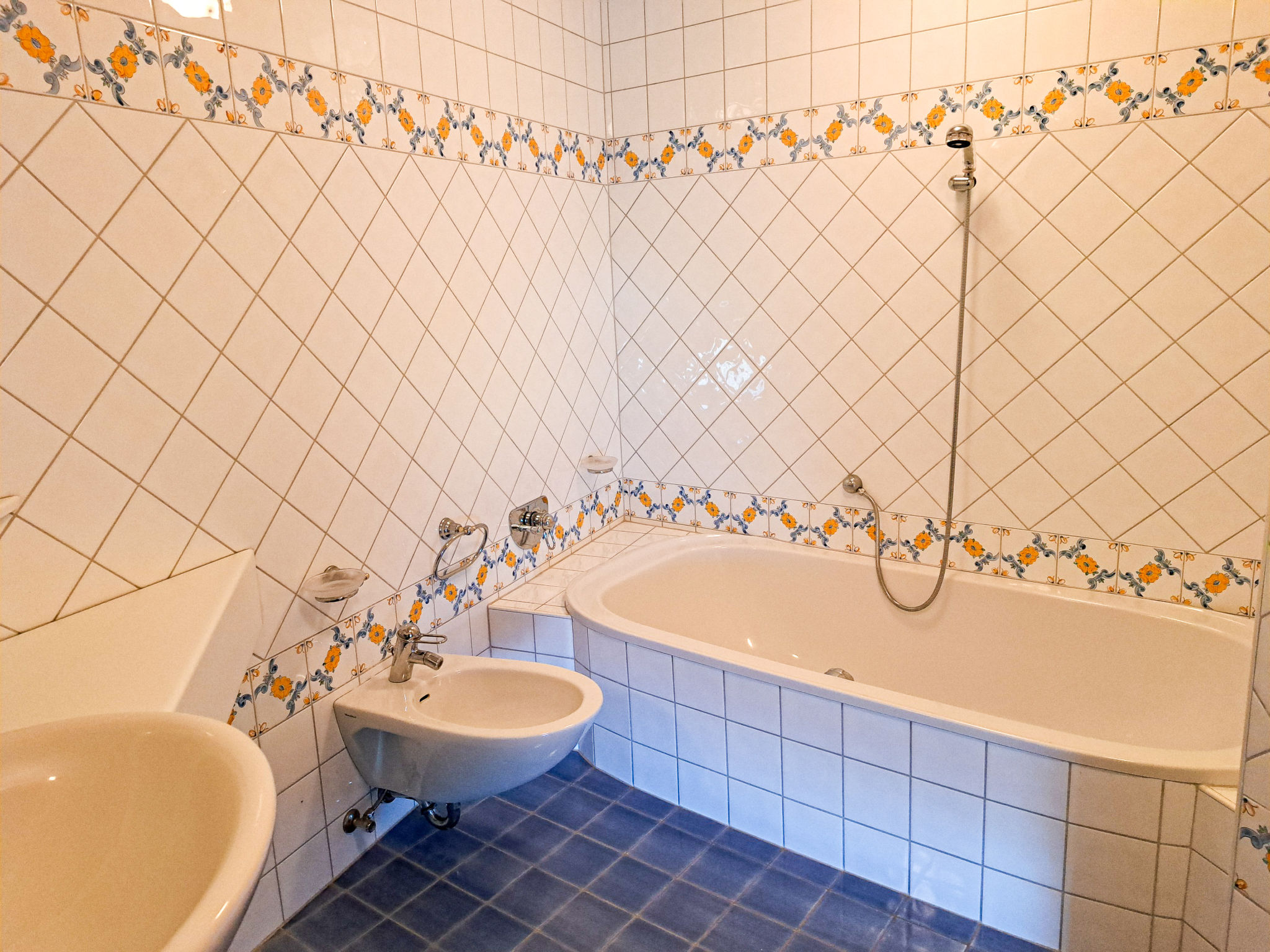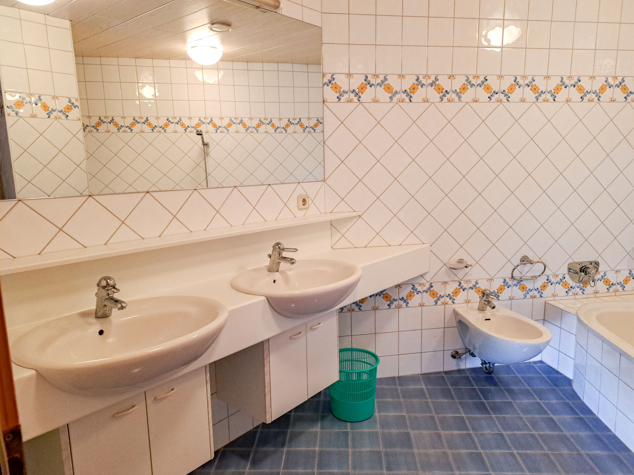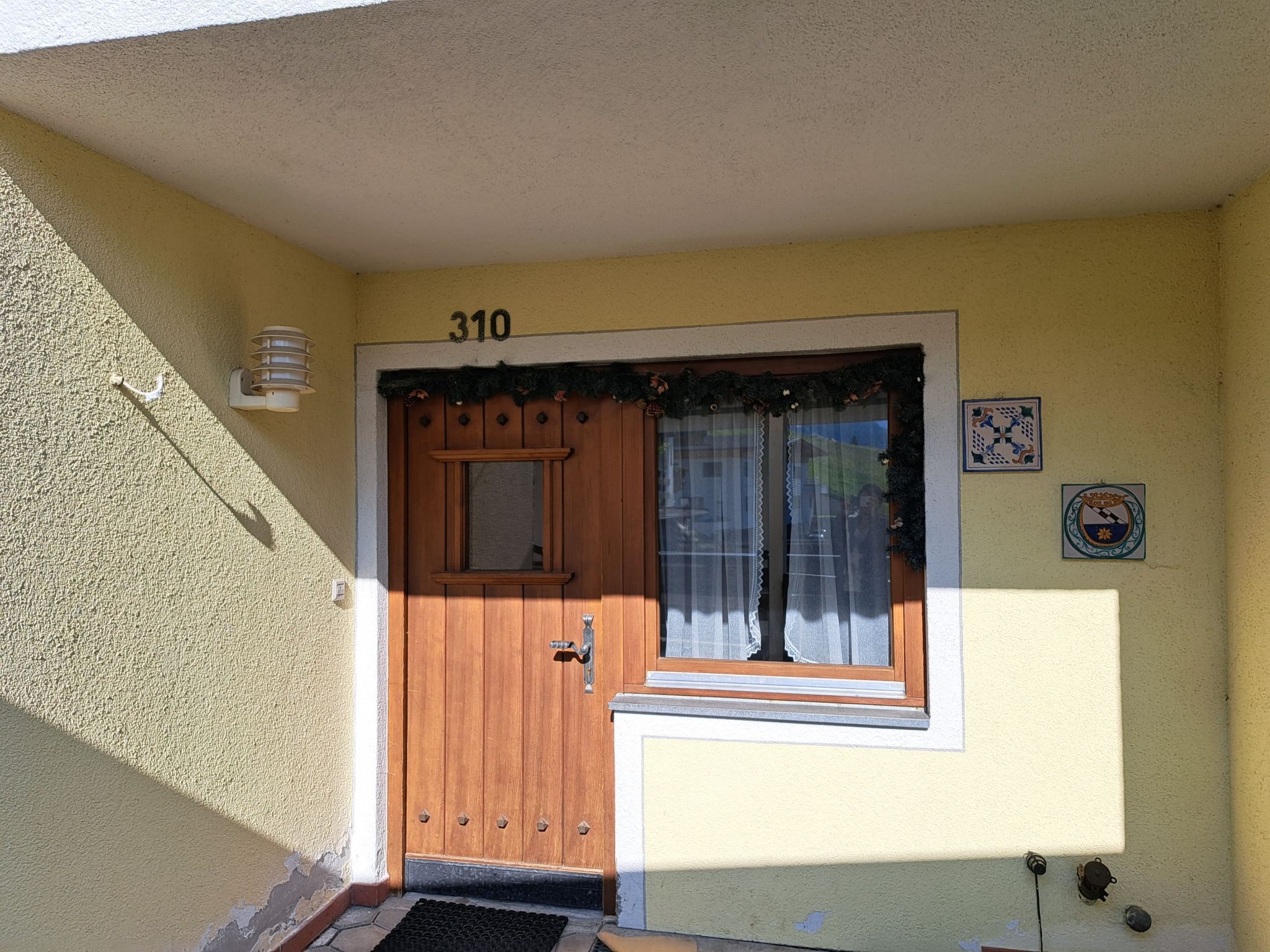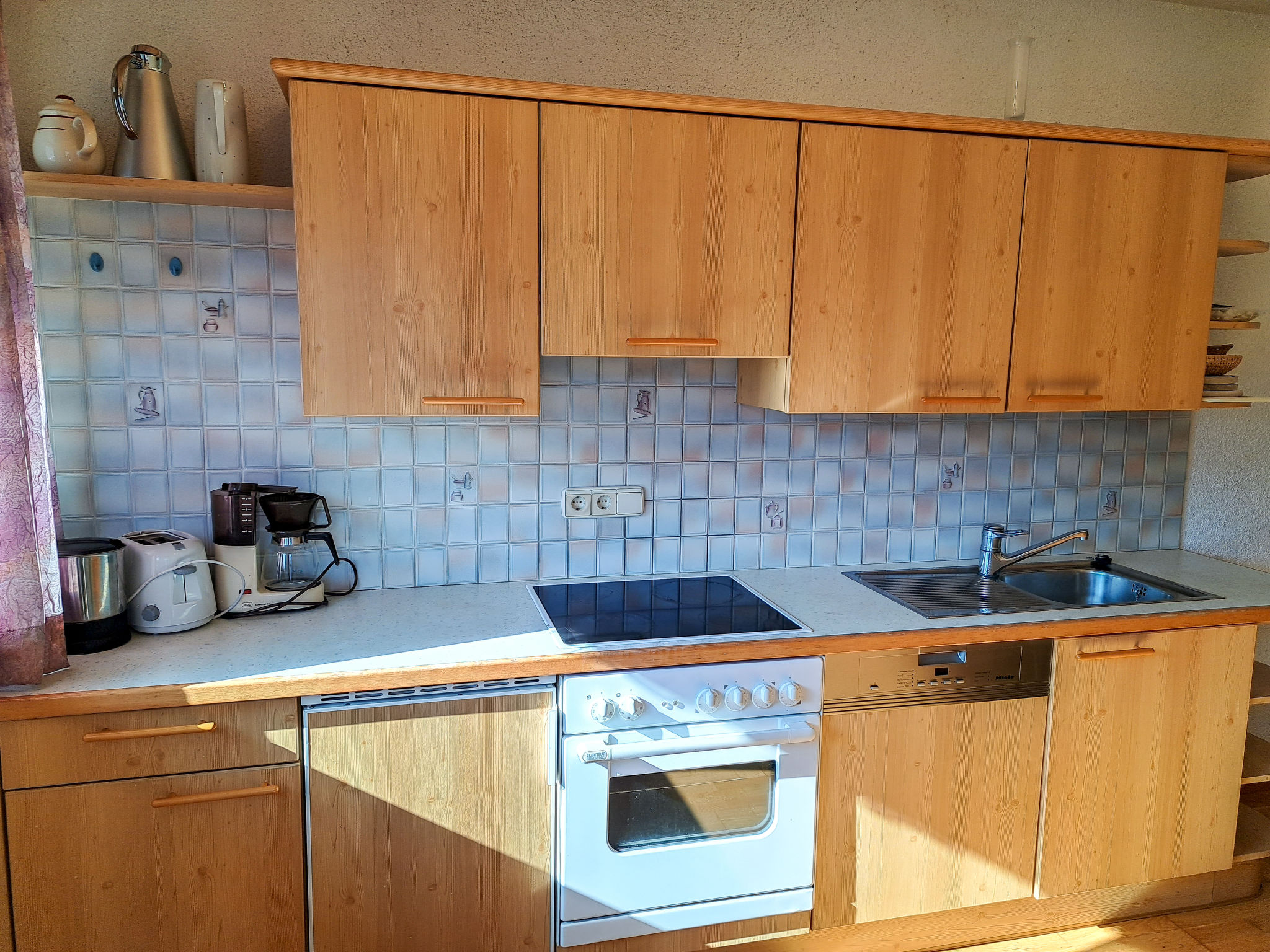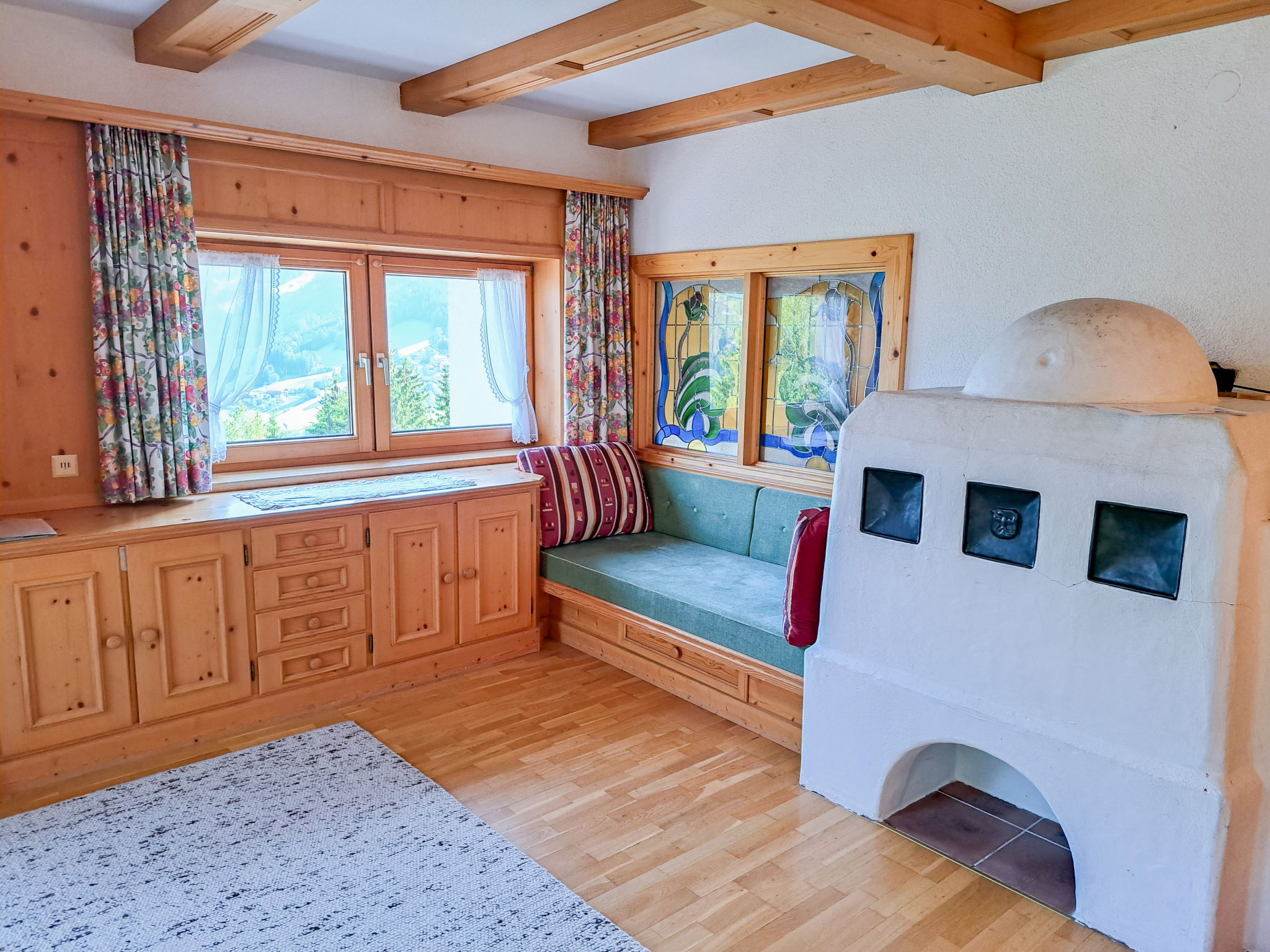 6-Zimmer-Haus, 3 Etagen, ca. 160 m². Zugang über Außentreppe in die 1. Etage (Hanglage): Schlafzimmer mit Doppelbett, Einzelbett, Dusche, Waschbecken und Balkonausgang. Zweibettzimmer mit Dusche und Waschbecken. Sep.WC. 2. Etage: Wohnraum mit Sitzgruppe, Kachelofen (Holz inklusive), Essplatz (Eckbank) für 8 Personen und Balkonausgang. Durch offenen Rundbogen in die Küche (4 Ceranfelder, Backofen, Geschirrspüler, Kühlschrank, Kaffeemaschine, Wasserkocher, Toaster) mit Essplatz für 5 Personen und Balkonausgang. Schlafzimmer mit Doppelbettcouch und Balkonausgang. 3. Etage (Dachschräge, nicht störend): Schlafzimmer mit Doppelbett, Einzelbett und Zugang zu sep.WC. Zweibettzimmer mit Zugang zu sep.WC. Bad/Dusche/Doppelwaschbecken.