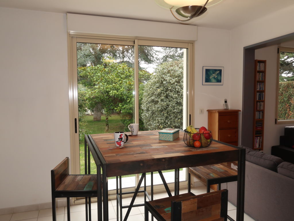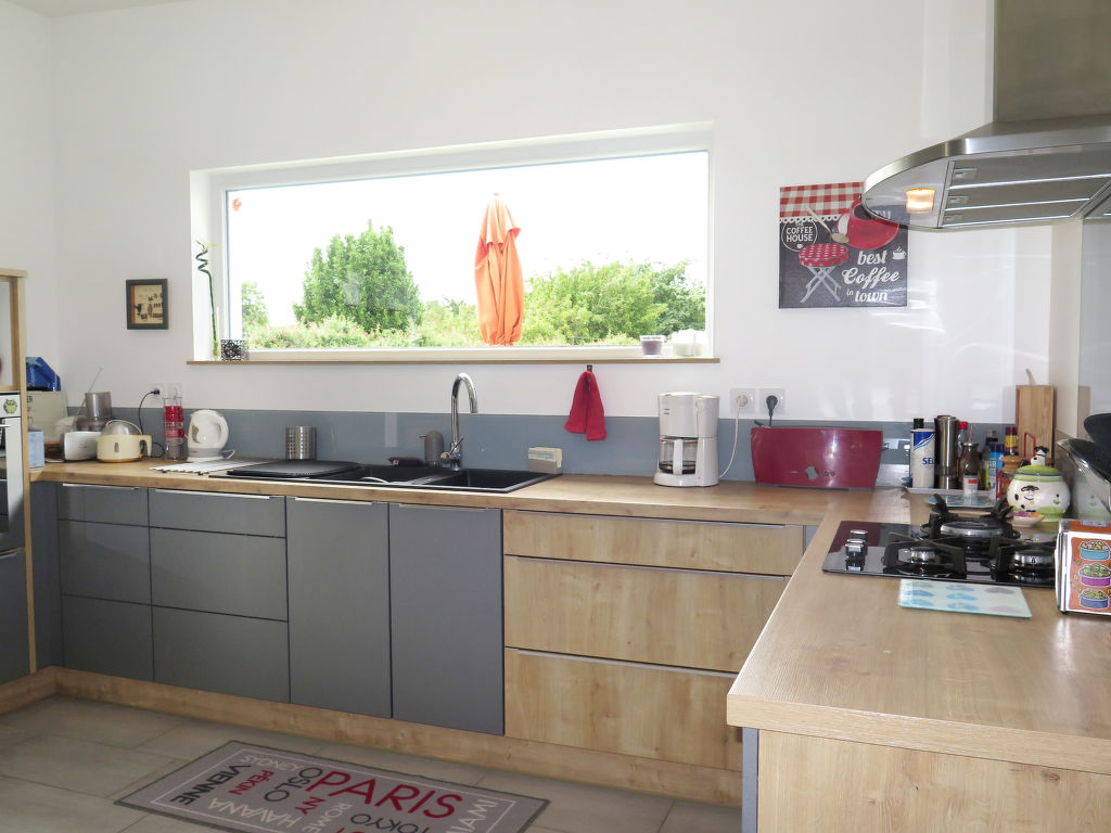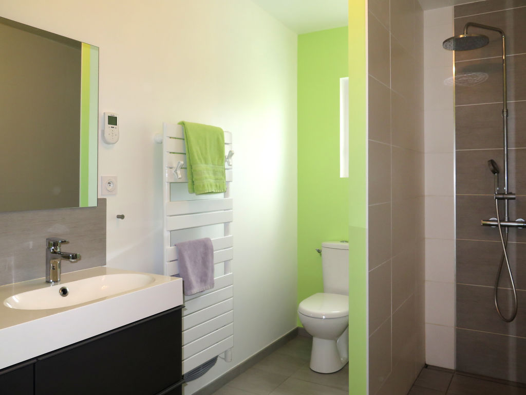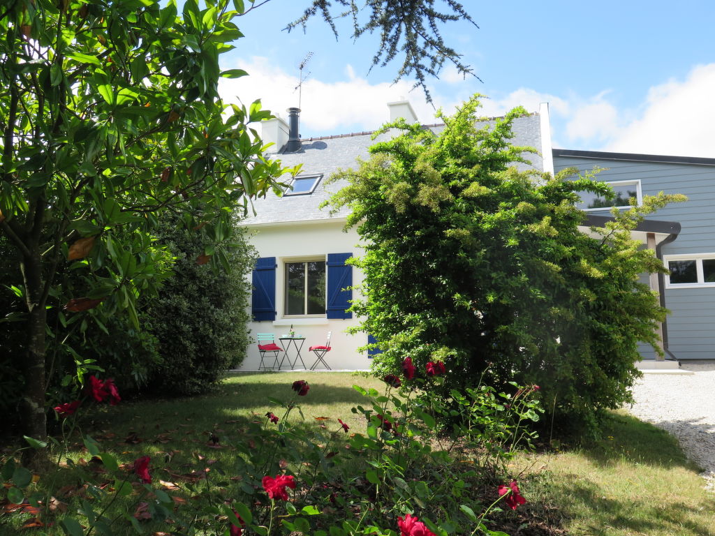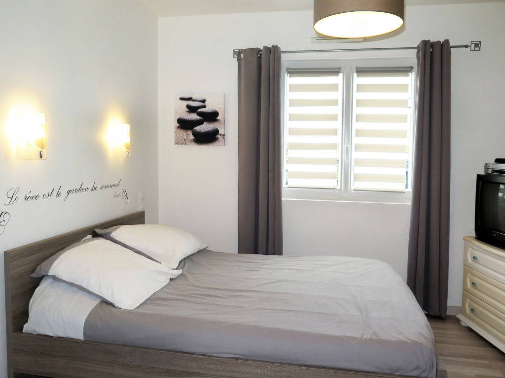 5-Zimmer-Haus, 2 Etagen, ca. 150 m². Erdgeschoss: Wohnraum mit Sitzgruppe, Kamin (nur Dekoration), Essplatz für 4 Personen, Gartenausgang und Glasschiebetür zur Terrasse. Zum Wohnraum offene Küche (3 Flammen, Backofen, Mikrowelle, Geschirrspüler, Kühlschrank, Kaffeemaschine, Wasserkocher, Toaster, Gefriertruhe im Abstellraum) mit Essplatz und Gartenausgang. 2 Schlafzimmer, jeweils mit franz. Bett. Dusche/Doppelwaschbecken/WC. Sep.WC. Vom Wohnraum Treppe ins Obergeschoss (Dachschräge): Schlafzimmer mit franz. Bett. Schlafzimmer mit franz. Bett und Einzelbett. Dusche/WC. Inserat einer Privatperson nach Artikel 155, IV, CGI.